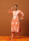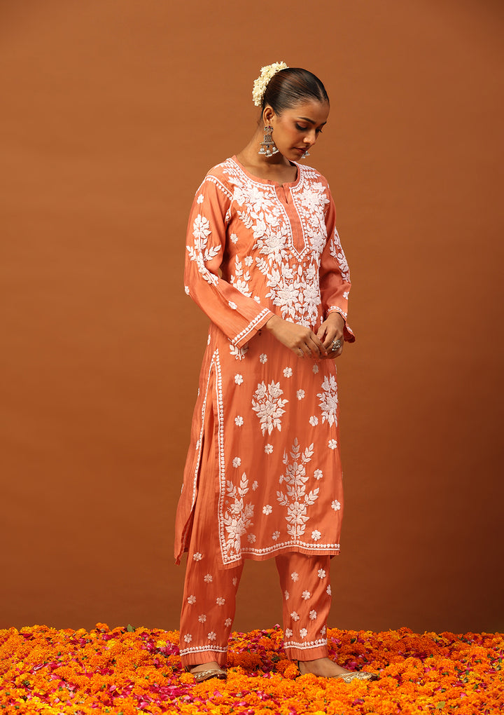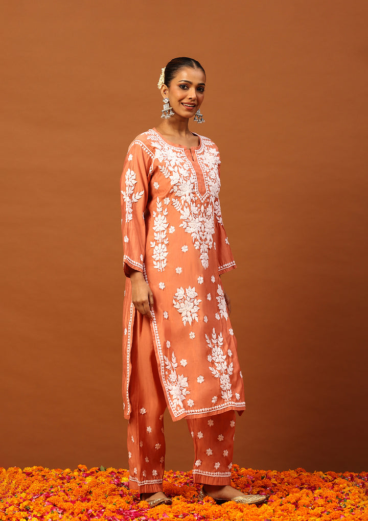 HOC Chanderi Chikankari Solid Women's 2 PC Long Kurta Set -Peach