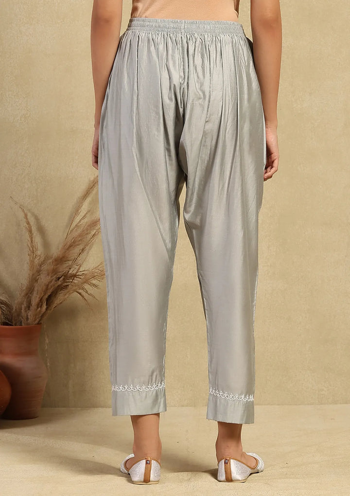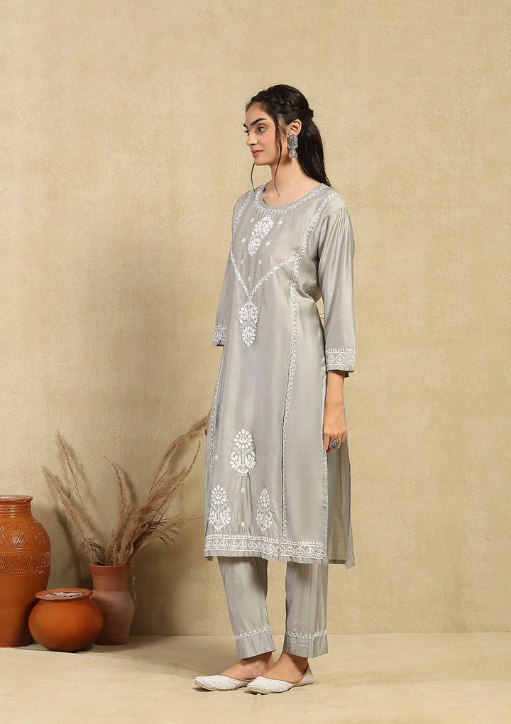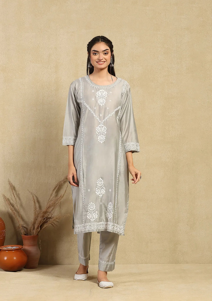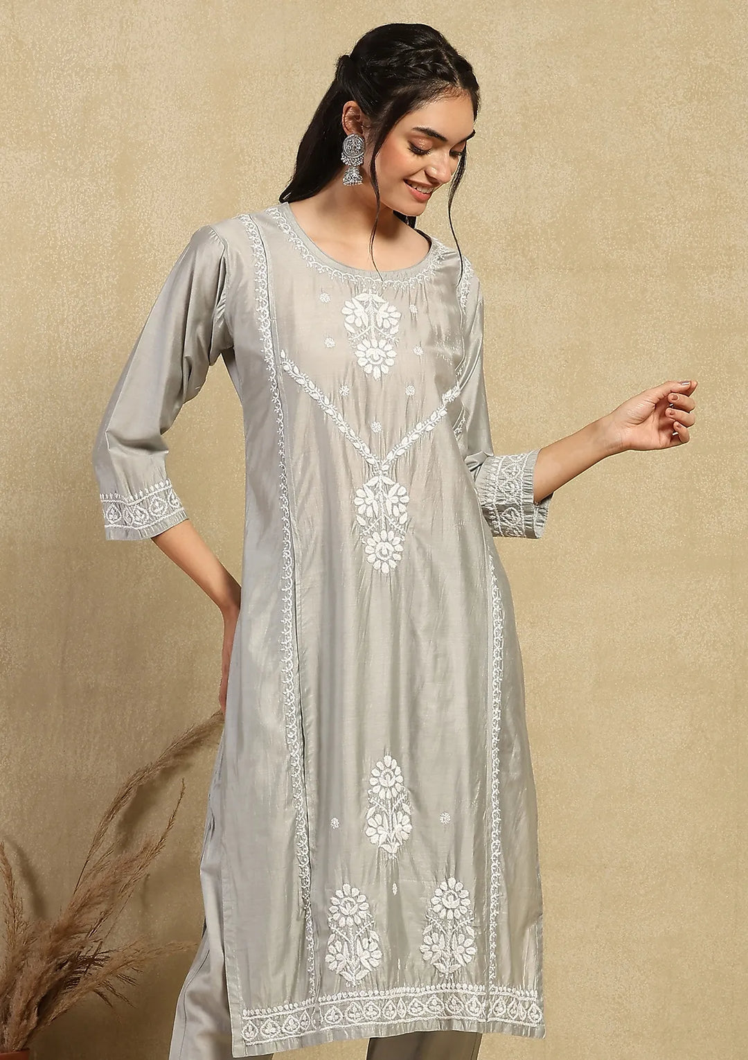 HOC Chanderi Chikankari Solid Women's 2PC Long Kurta Set -Grey