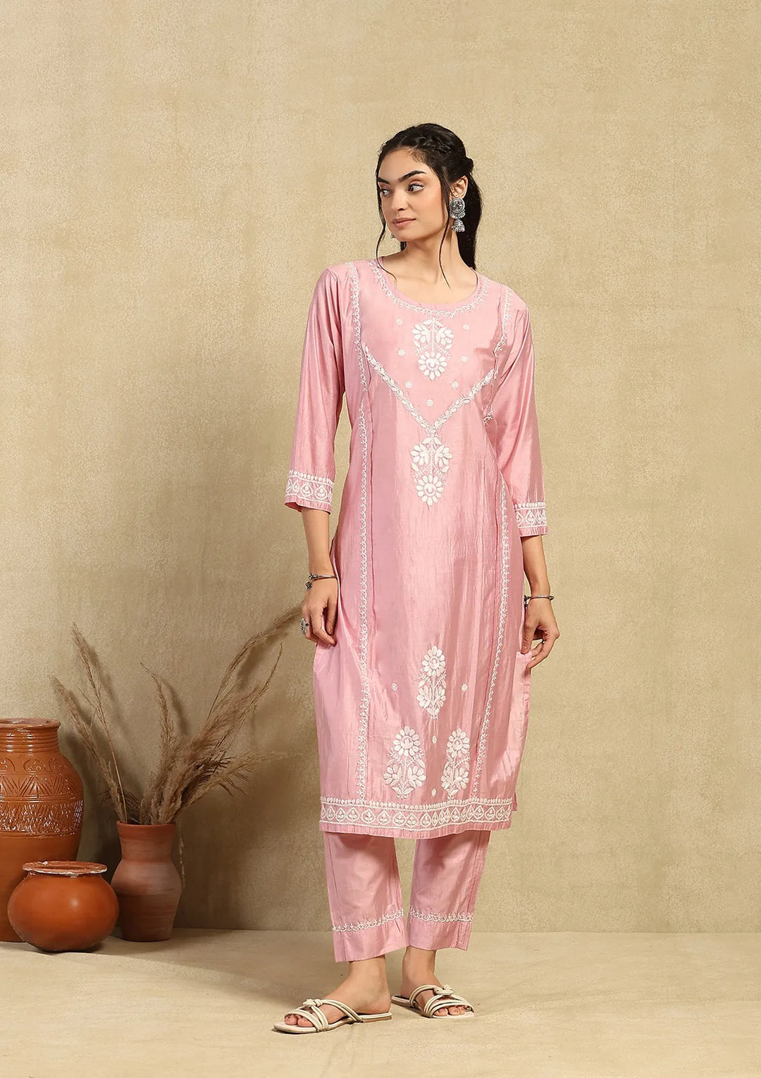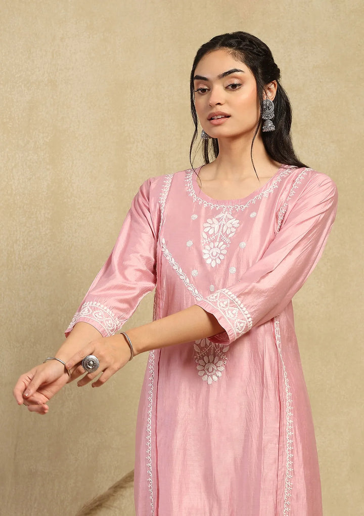 HOC Chanderi Chikankari Solid Women's 2PC Long Kurta Set -Pink