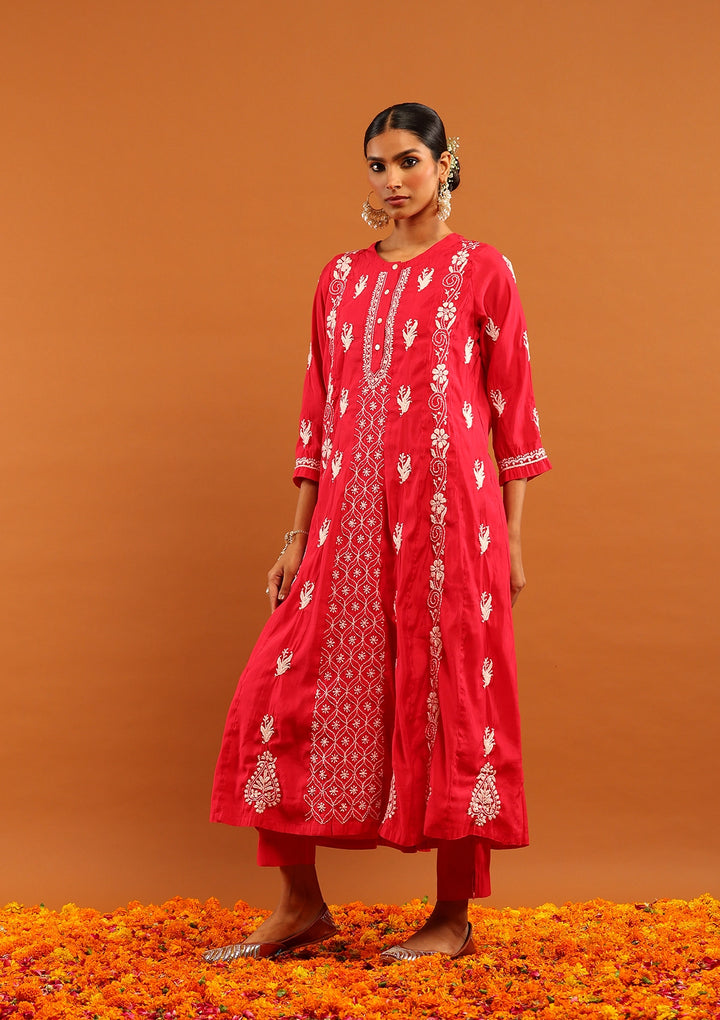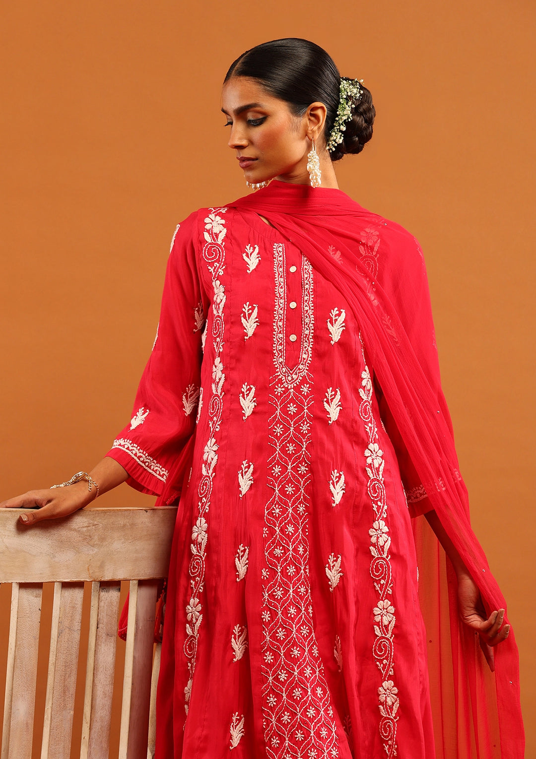 HOC Chanderi Chikankari Solid Women's 3 PC Anarkali Kurta Set-Pink
