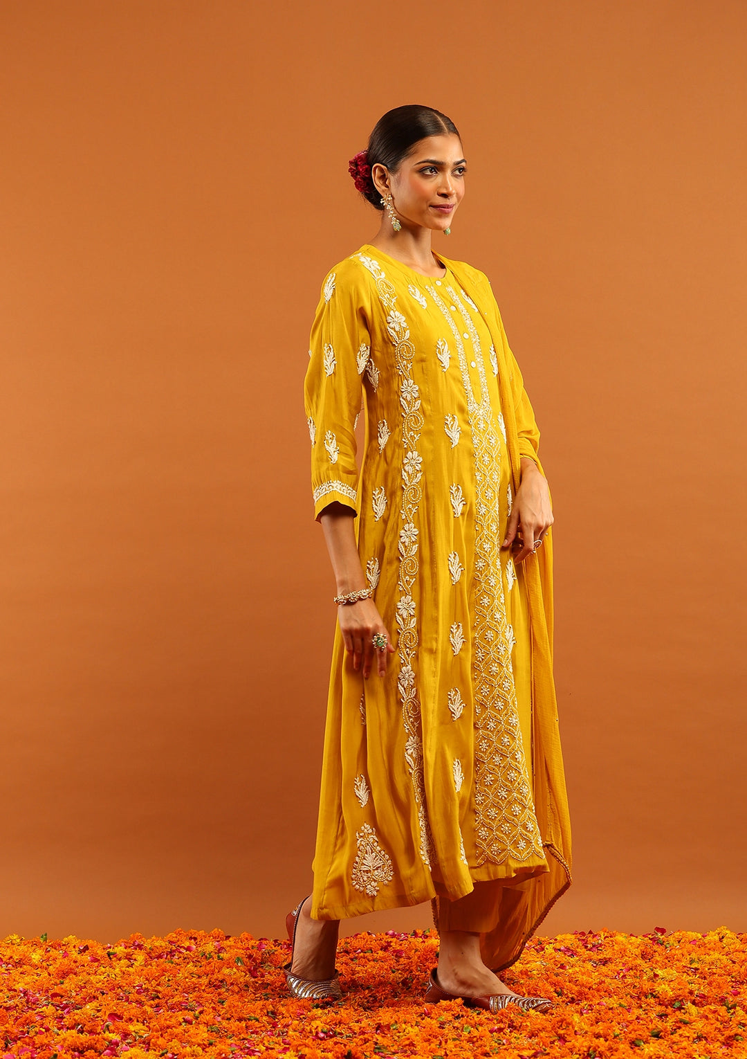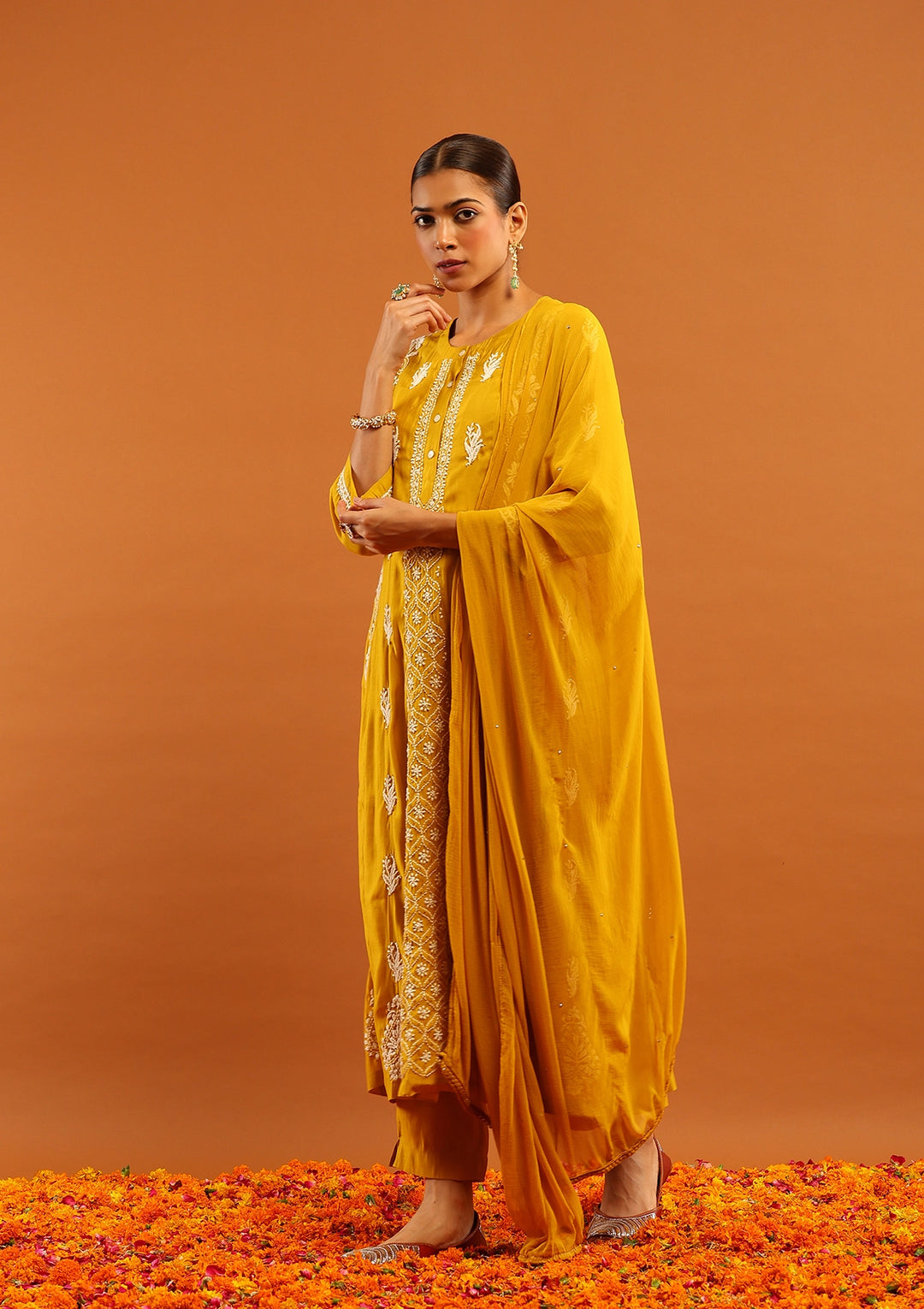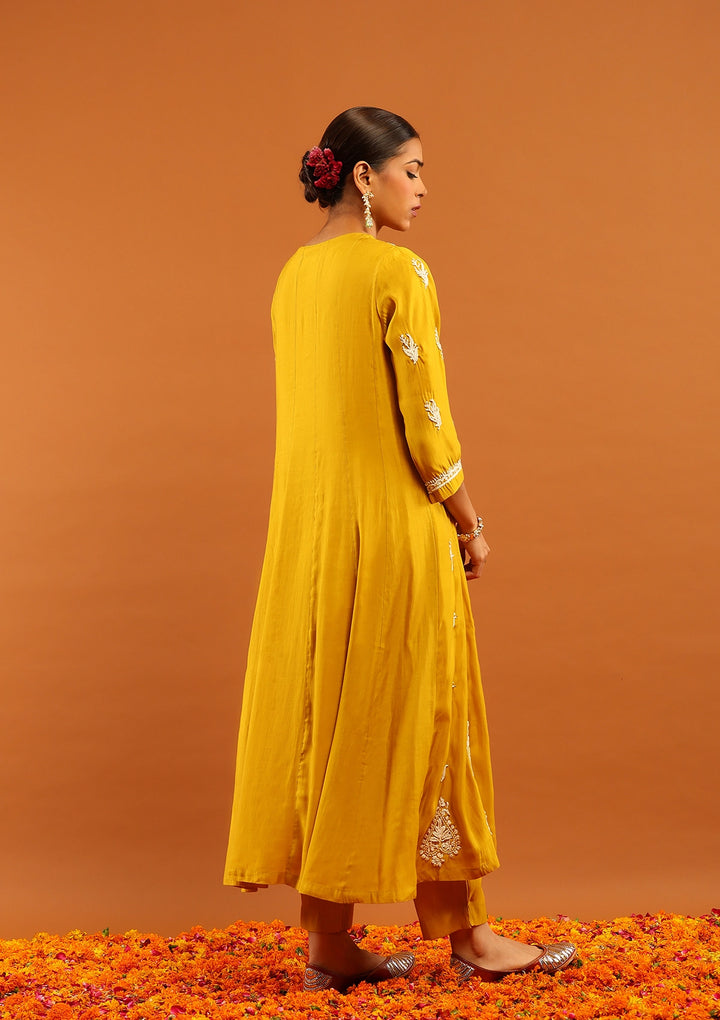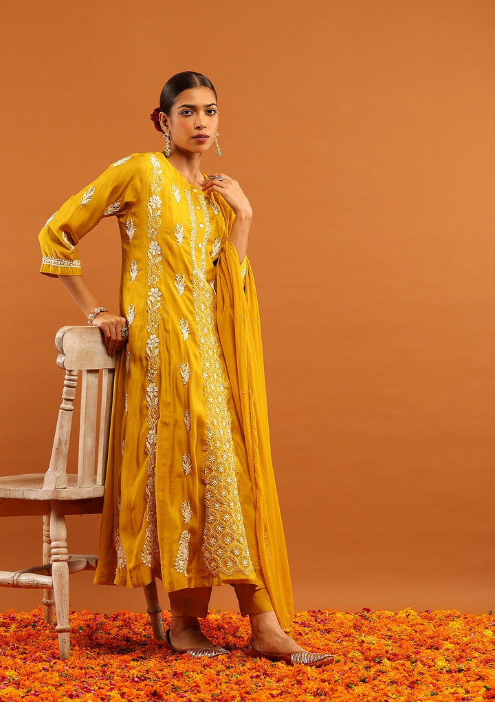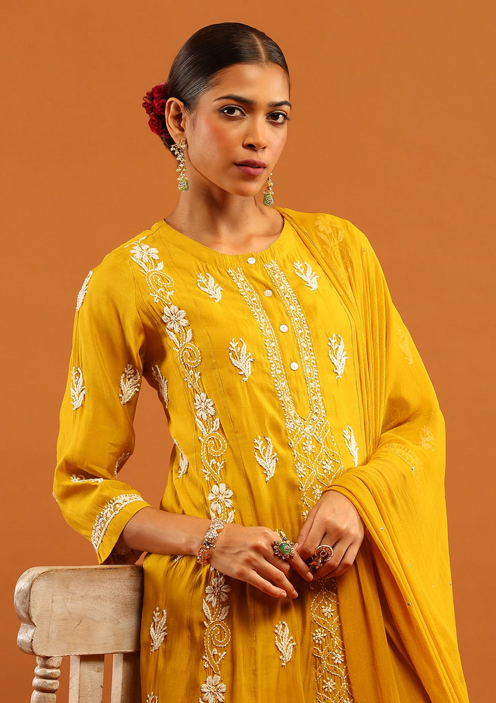 HOC Chanderi Chikankari Solid Women's 3 PC Anarkali Kurta Set-Yellow