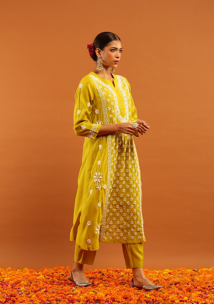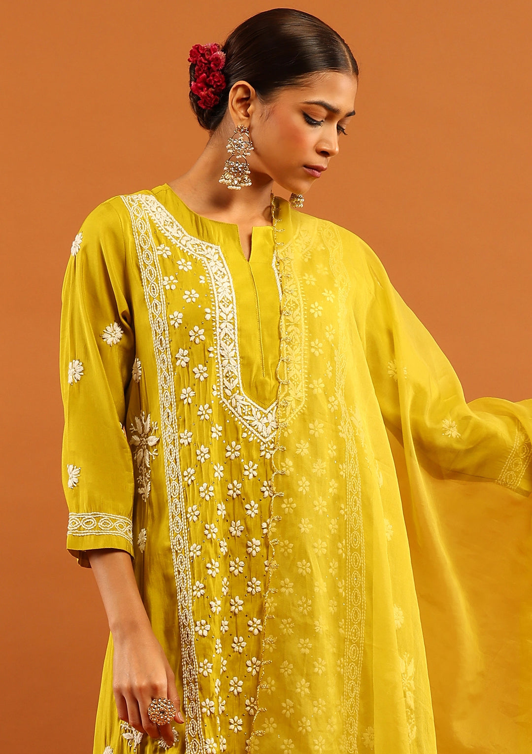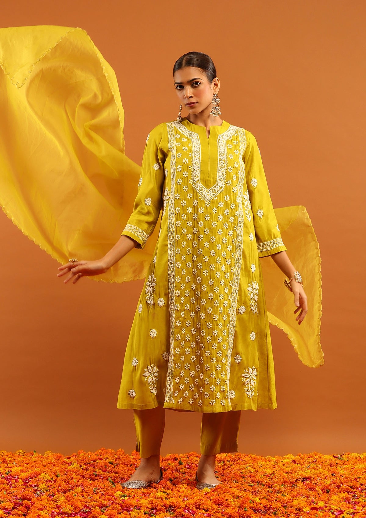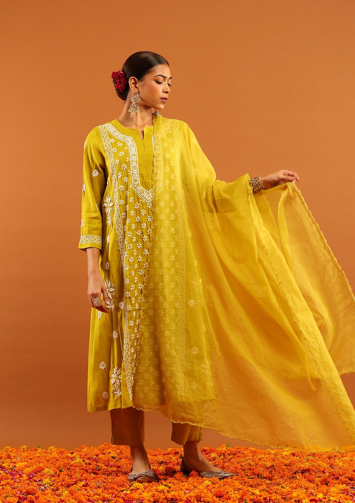 HOC Chanderi Chikankari Solid Women's 3 PC Long Kurta Set-Green
