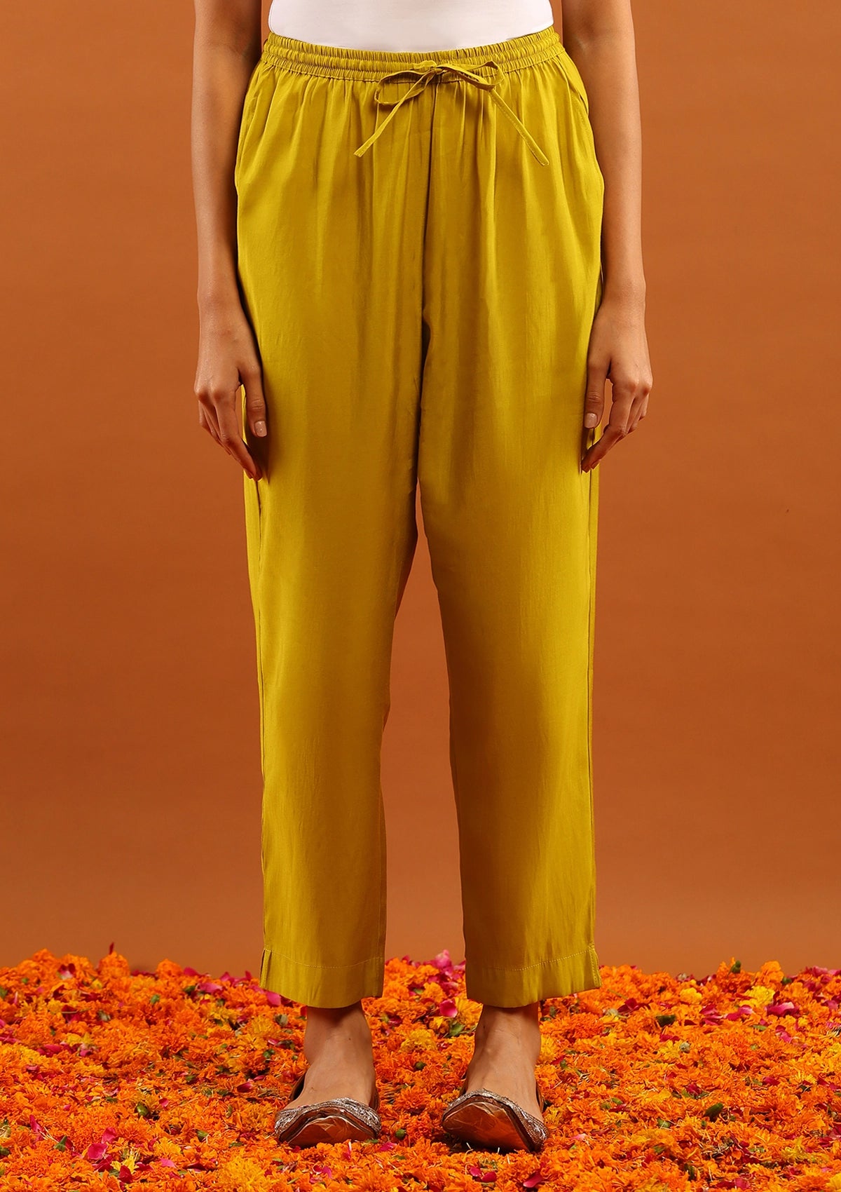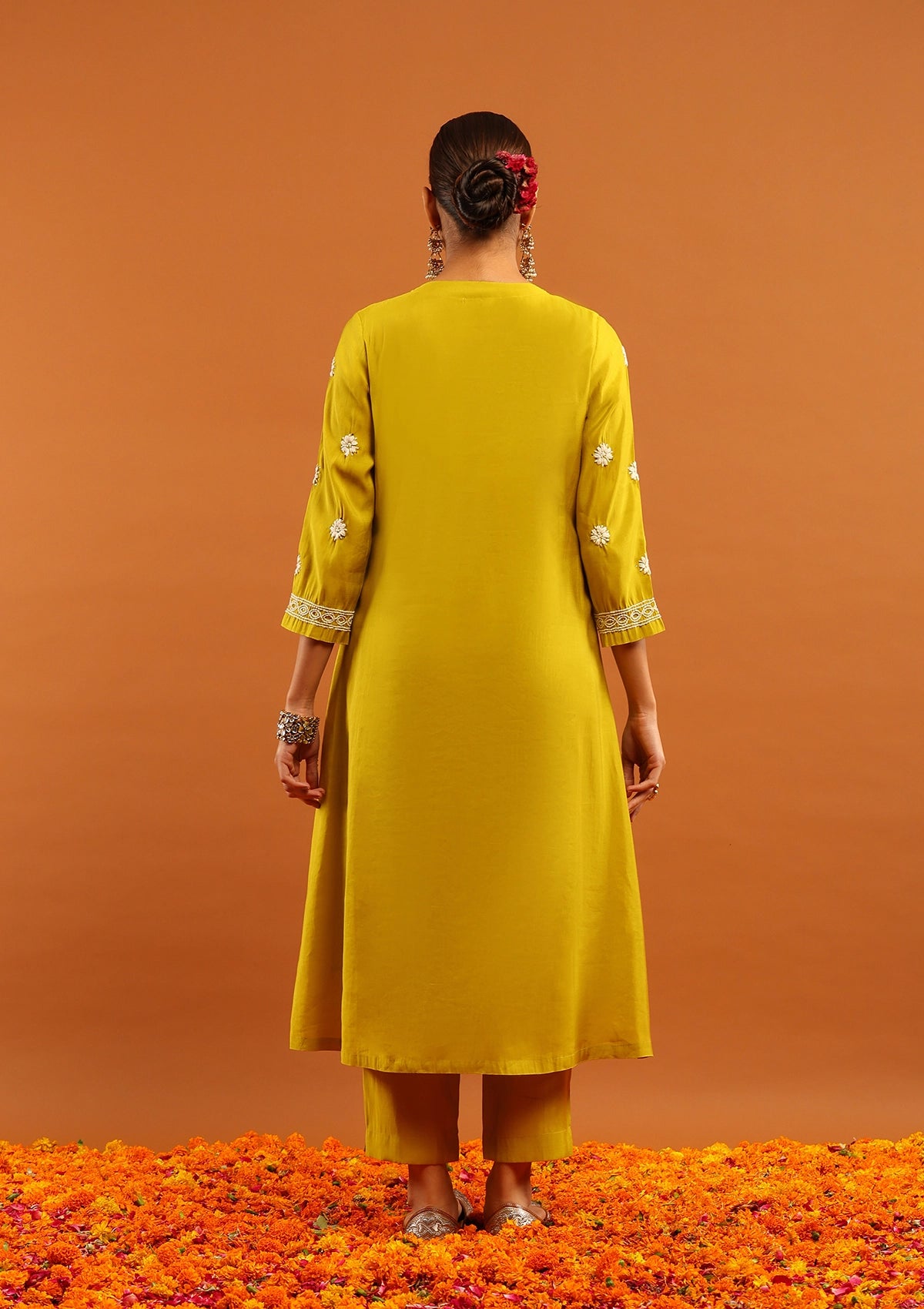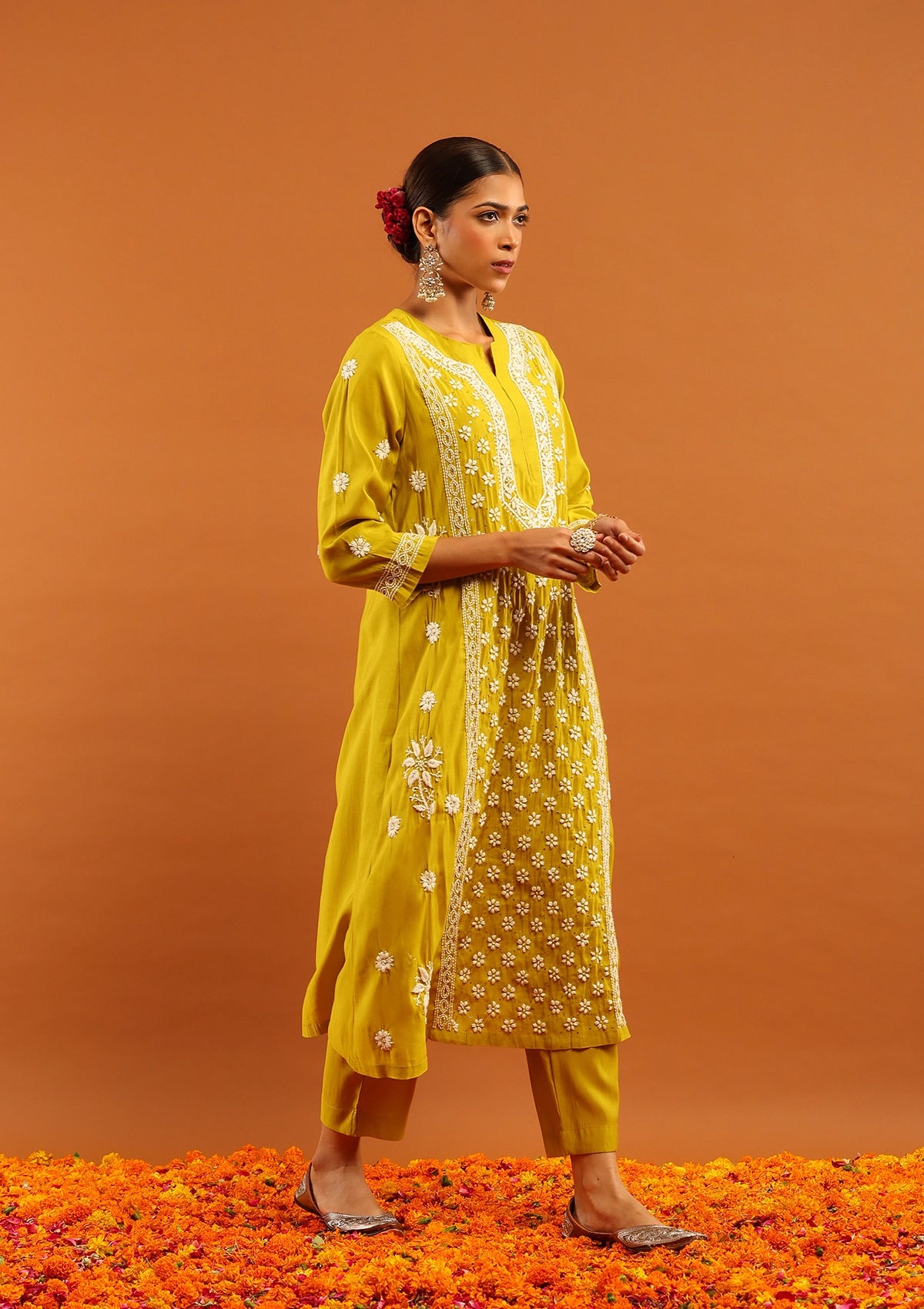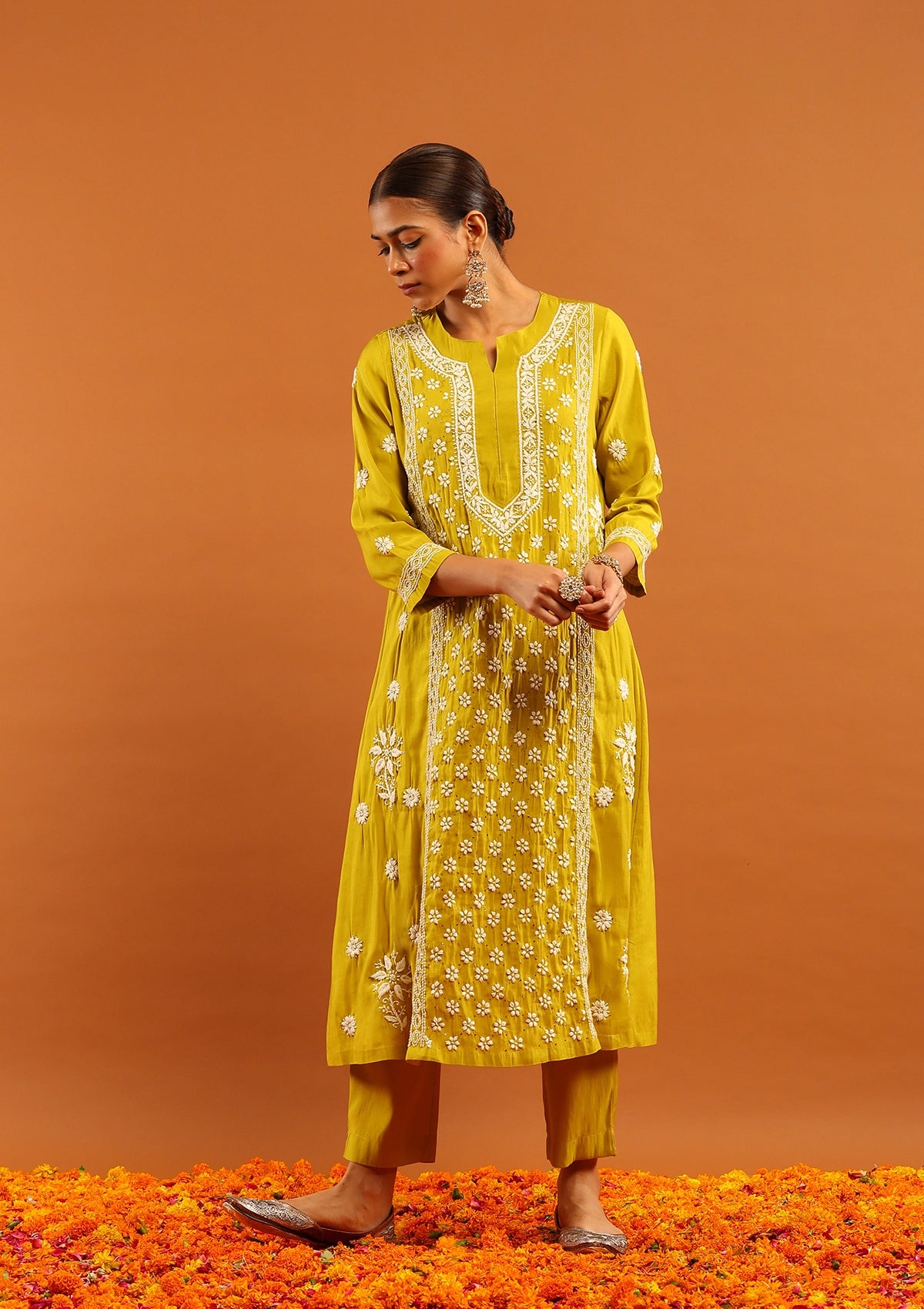 HOC Chanderi Chikankari Solid Women's 3 PC Long Kurta Set-Green