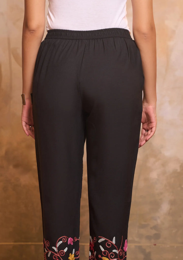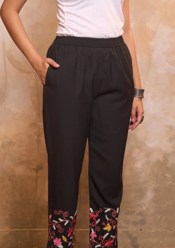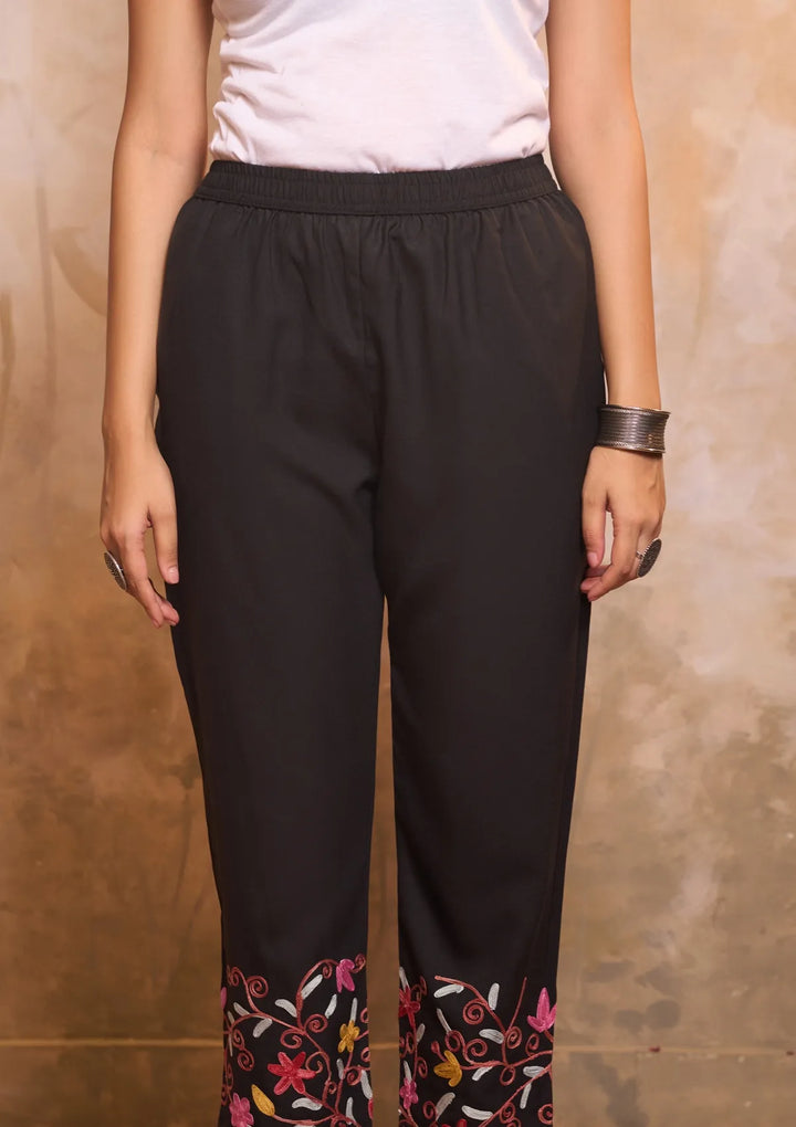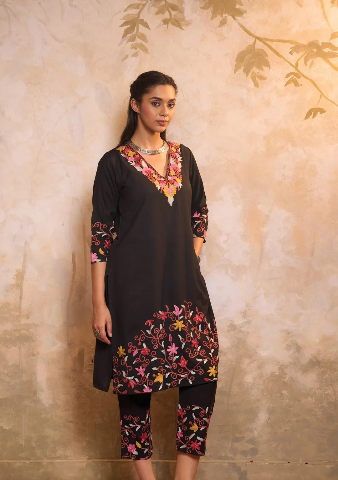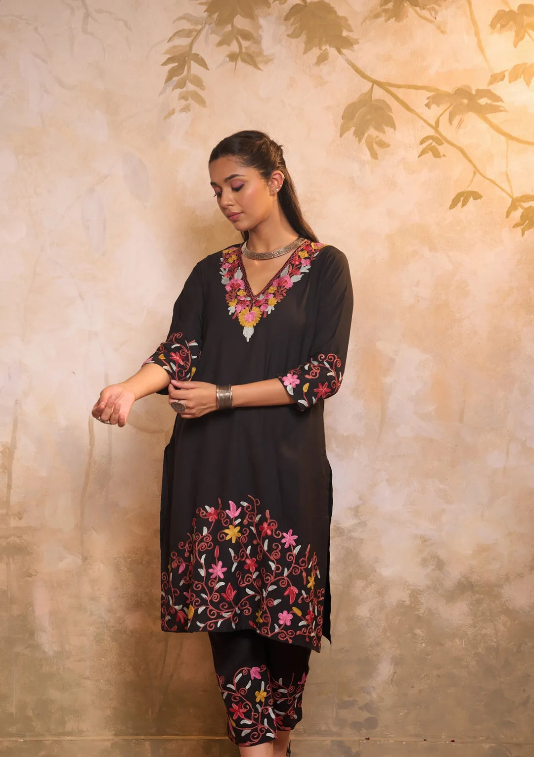 HOC Cotton Aari Embroidered Solid Women's 2 PC Long Kurta Set - Black