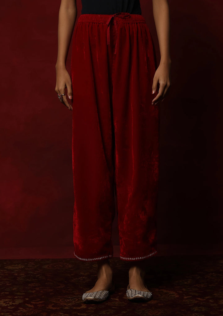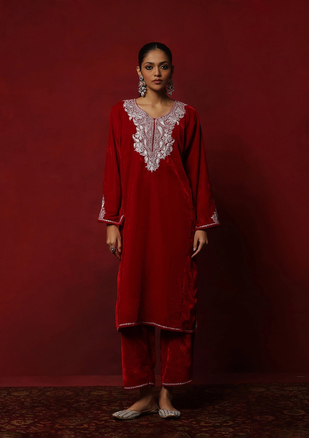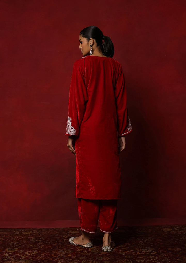 HOC Kashmiri Velvet Tilla Embroidered Solid Women's 2 PC Phiran Set -Red