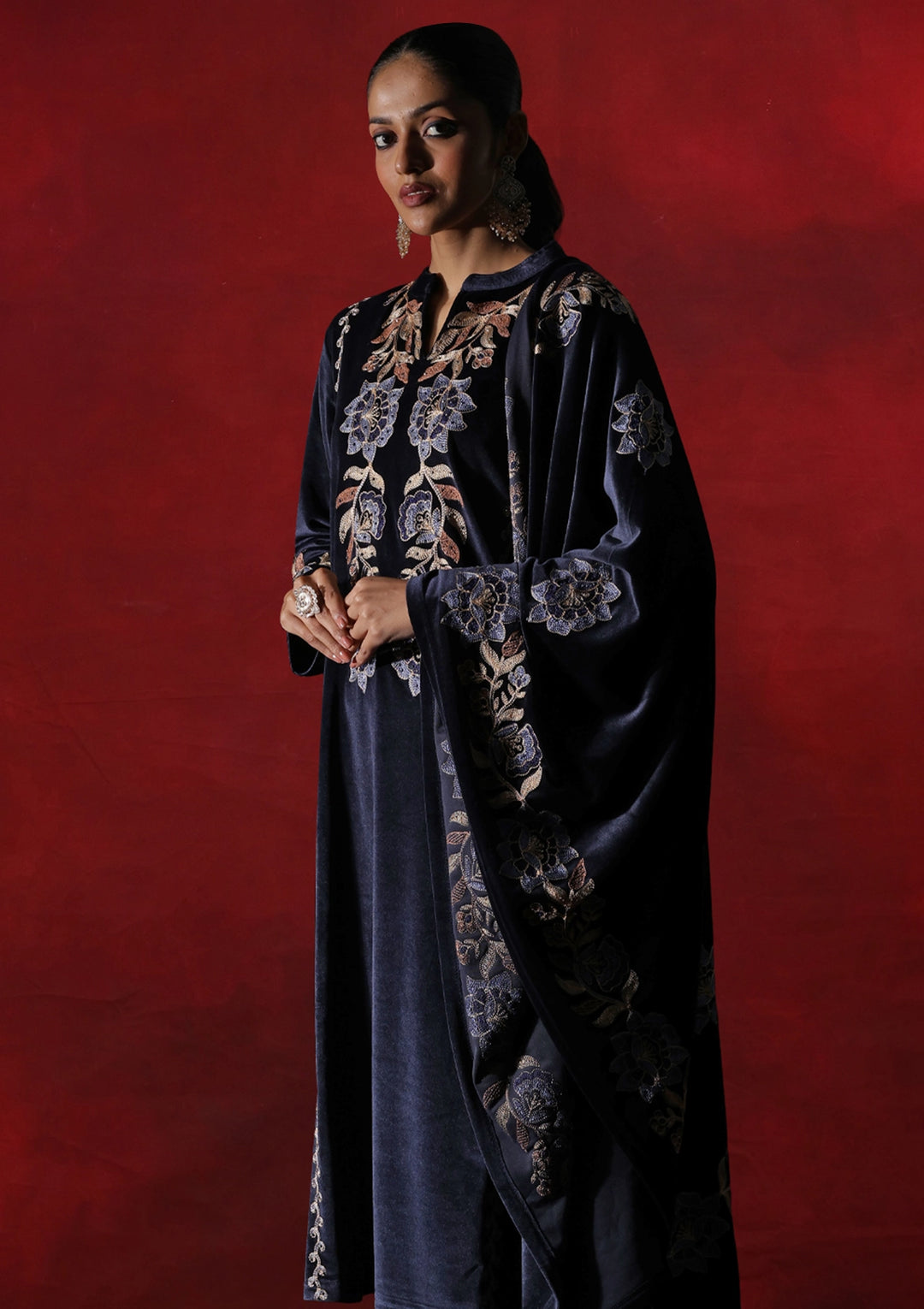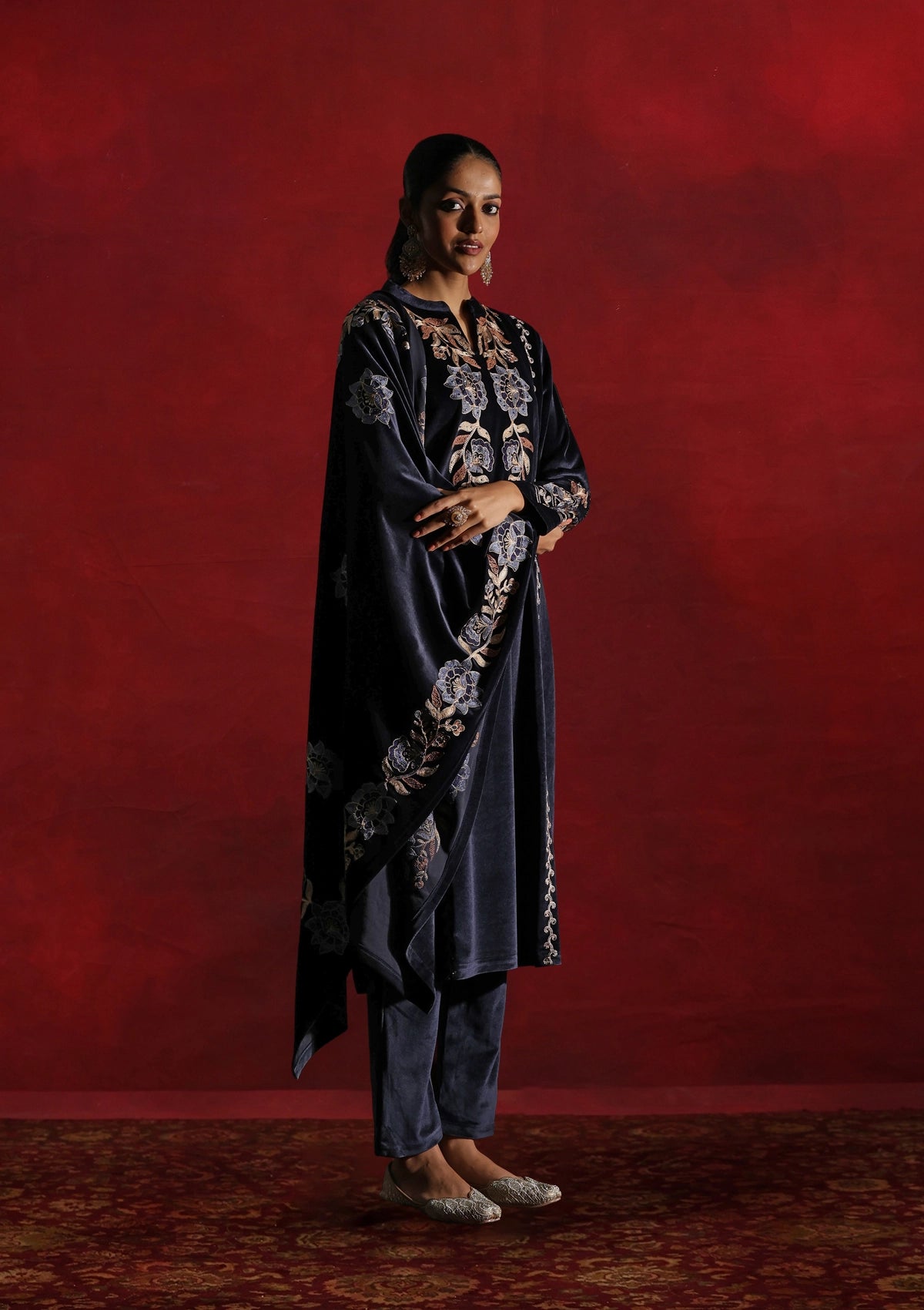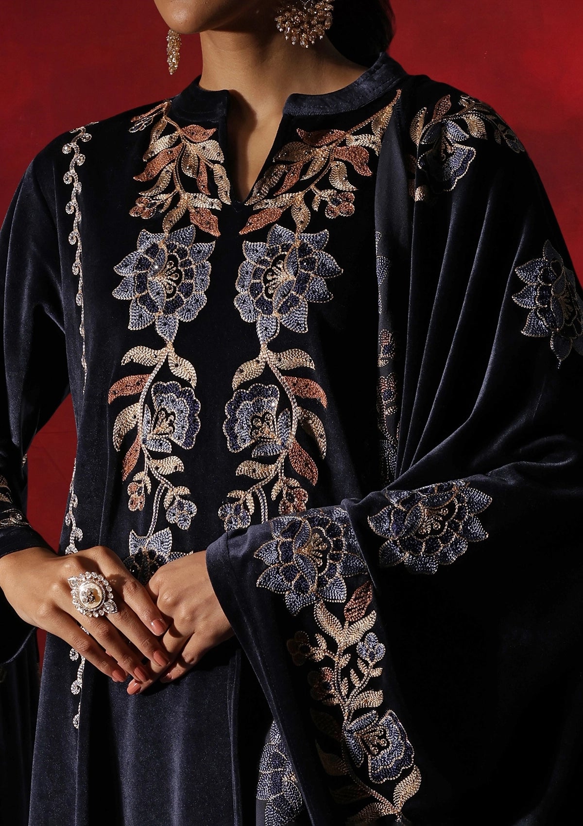 HOC Velvet Embroidered & Embellished Solid Women's 3 PC Kurta Set- Navy Blue