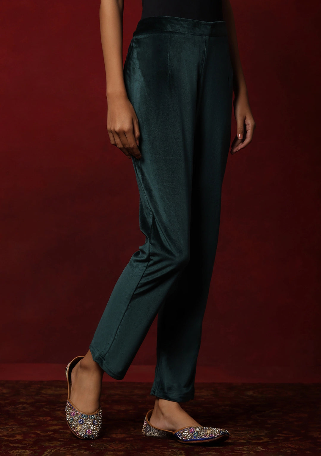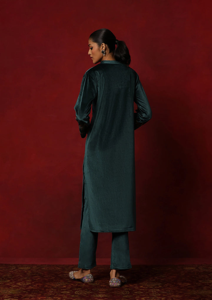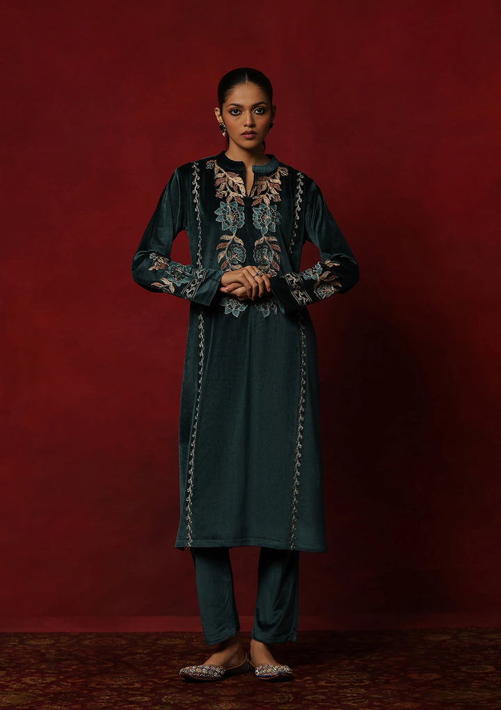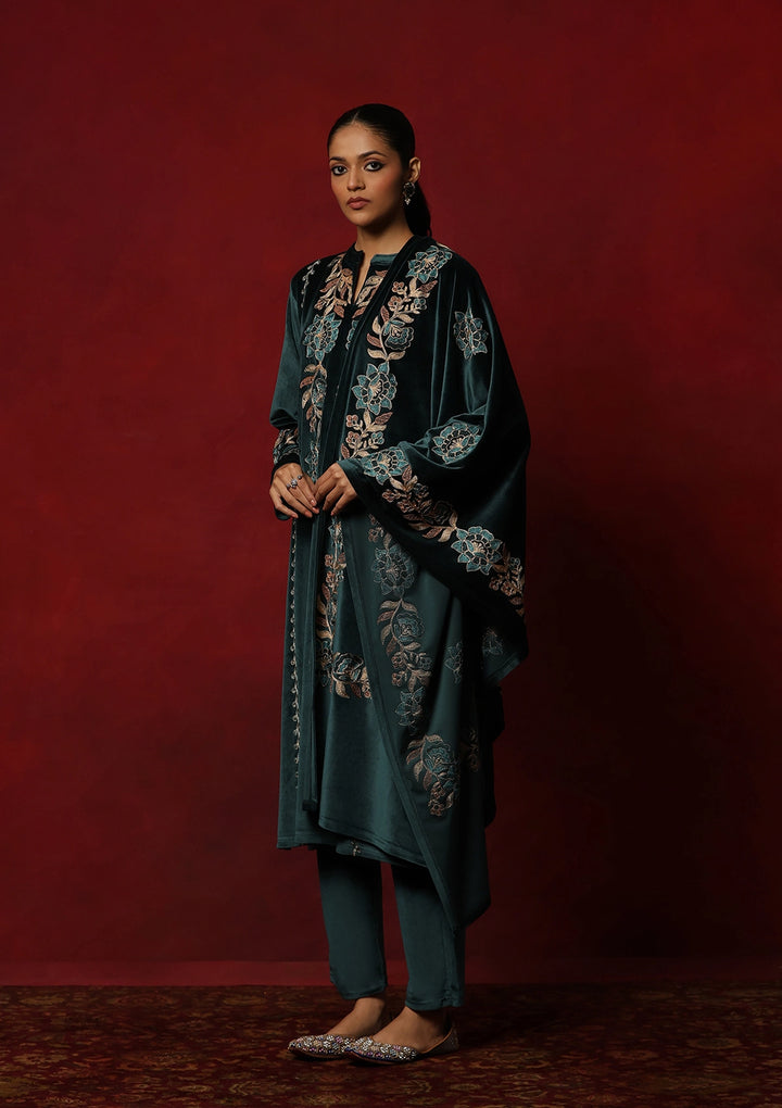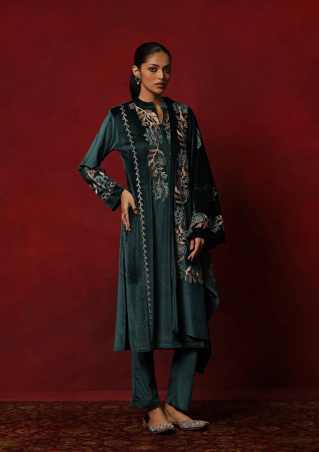 HOC Velvet Embroidered & Embellished Solid Women's 3 PC Kurta Set- Teal Green