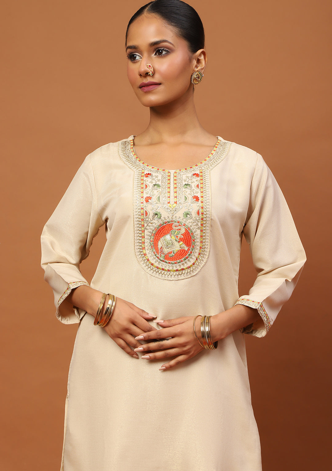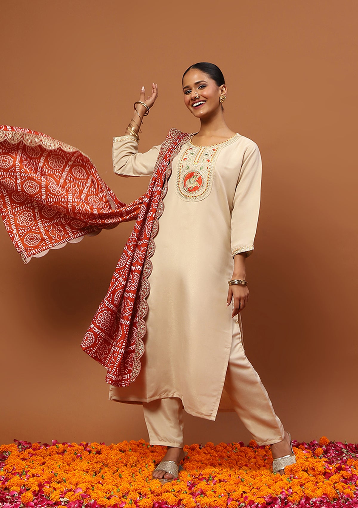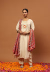 HOC Cotton Blend Embroidered With Sequin 3 PC Straight Kurta Set – Beige
