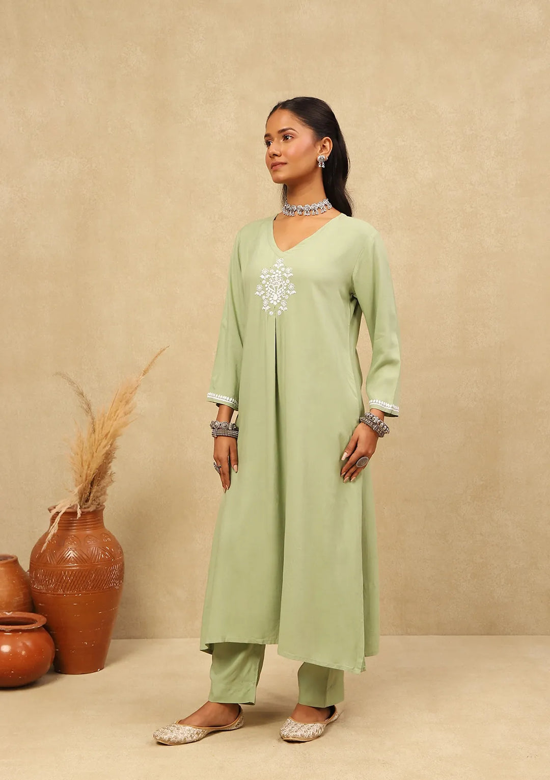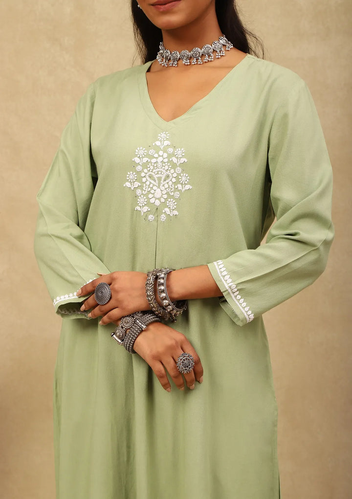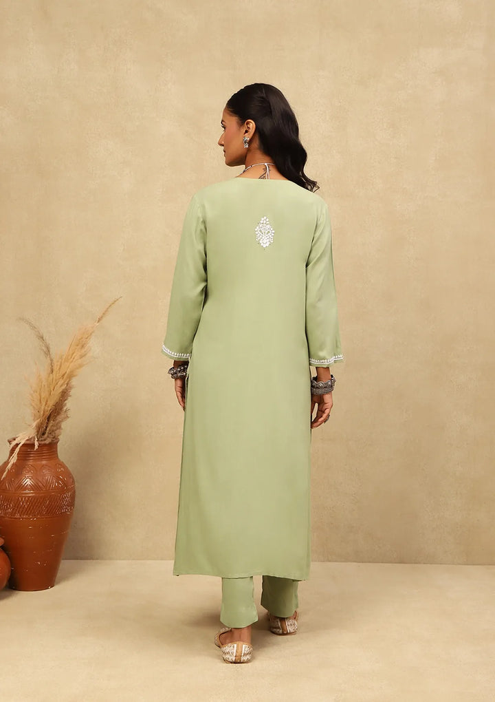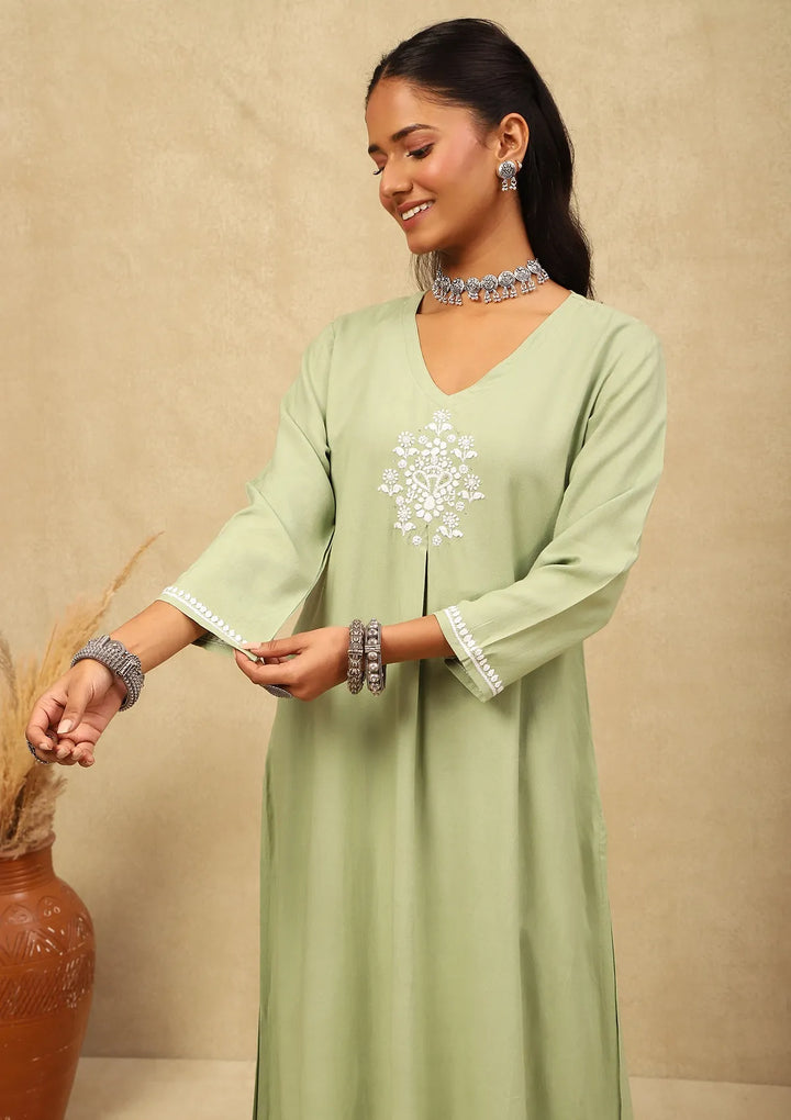 HOC Rayon Chikankari With Mukaish Solid Women's 2 PC Long Kurta Set - Green