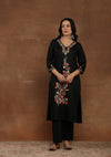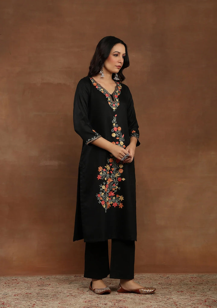 HOC Wool Aari Embroidered Straight Kurta Set-Black