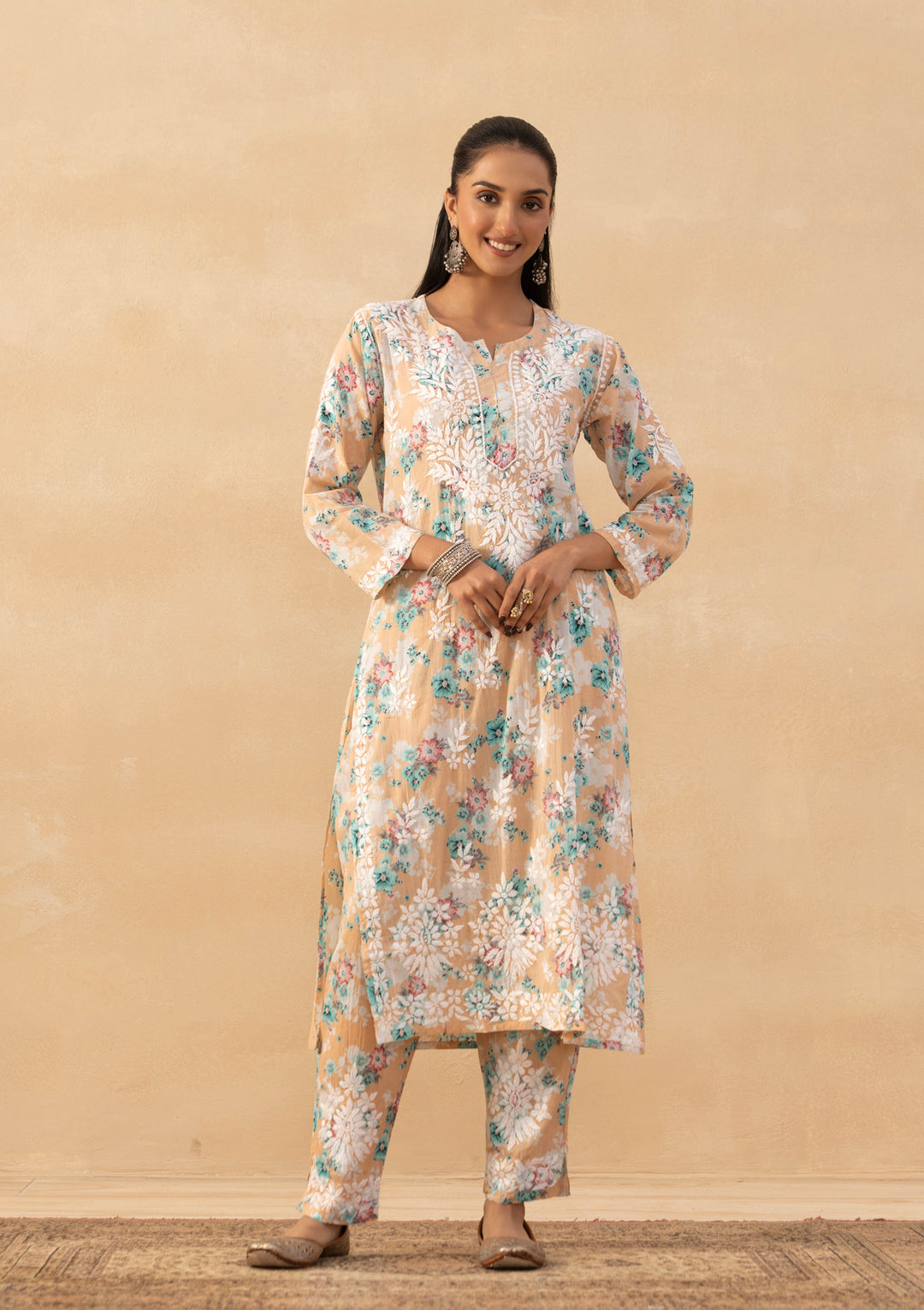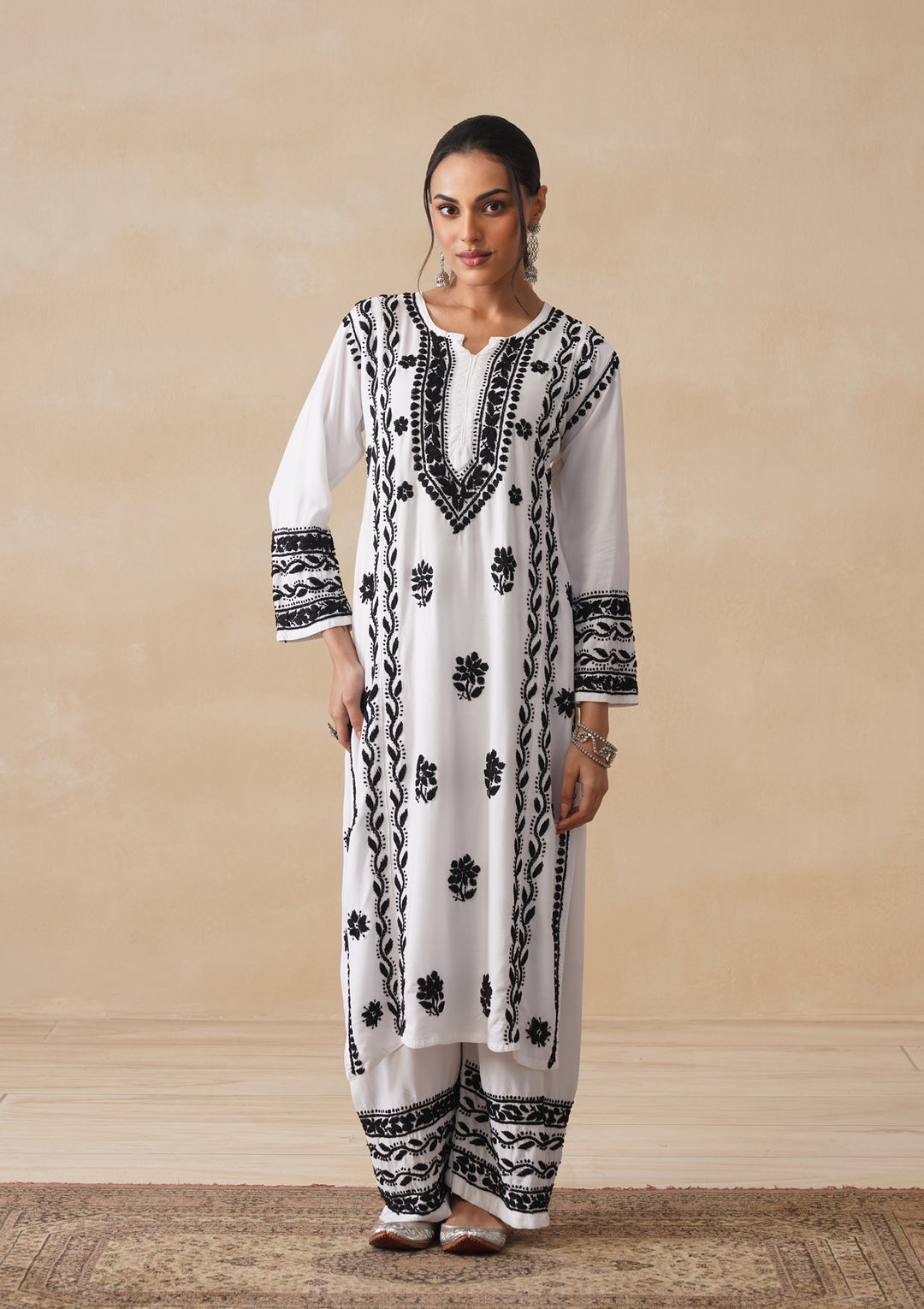 Our chikankari kurta sets come with a matching chikankari bottom wear like straight pants, palazzos, flared palazzos, gharara, or an inner. Some chikankari suit for women may also include a dupatta to add a touch of elegance and tradition to the outfit.
