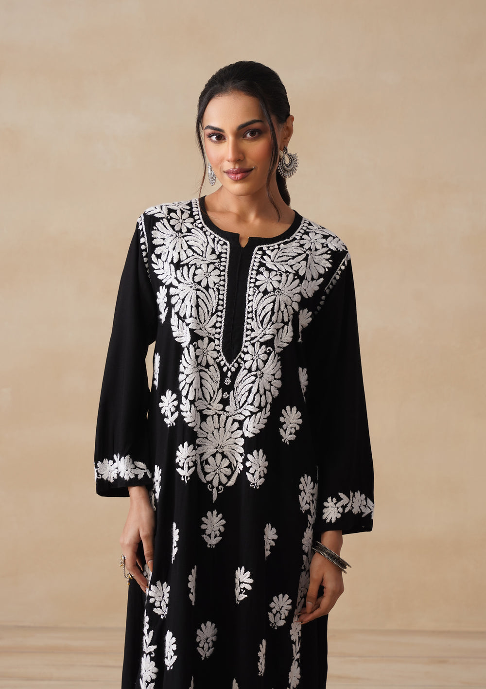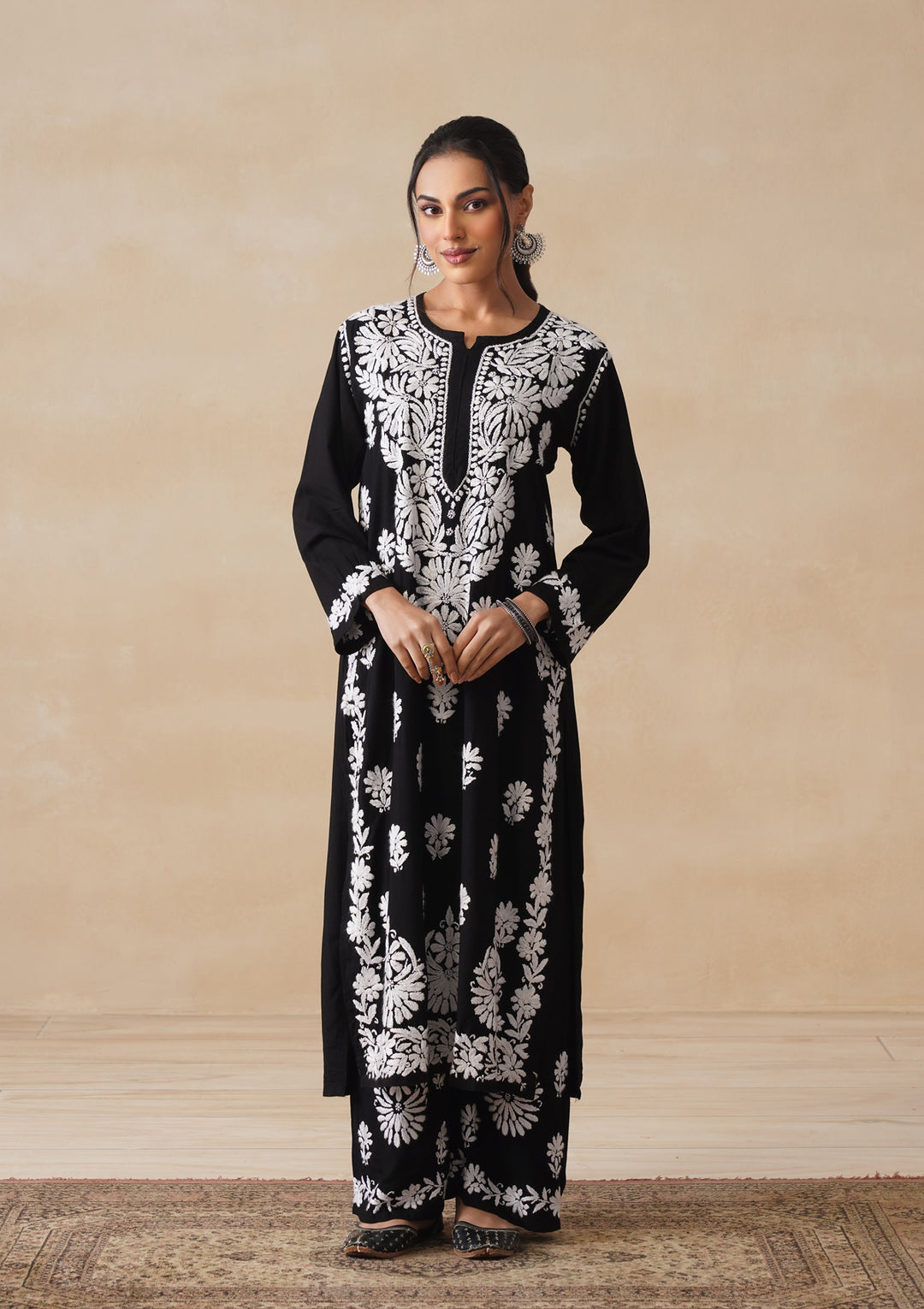 Modal Chikankari Solid Women's 2PC Long Kurta Set- Black