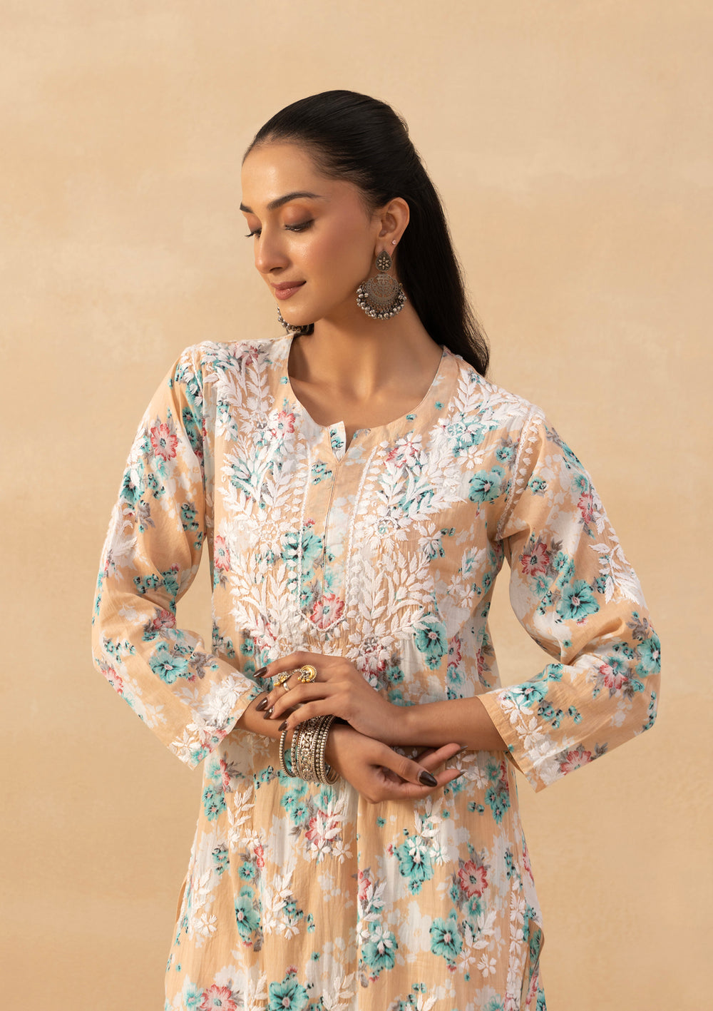 To style a chikankari kurta set, balance elegance and comfort by choosing lightweight fabrics and accessorize as per your style to stand out. Here is how you can style our quintessential Chikankari short kurta for women