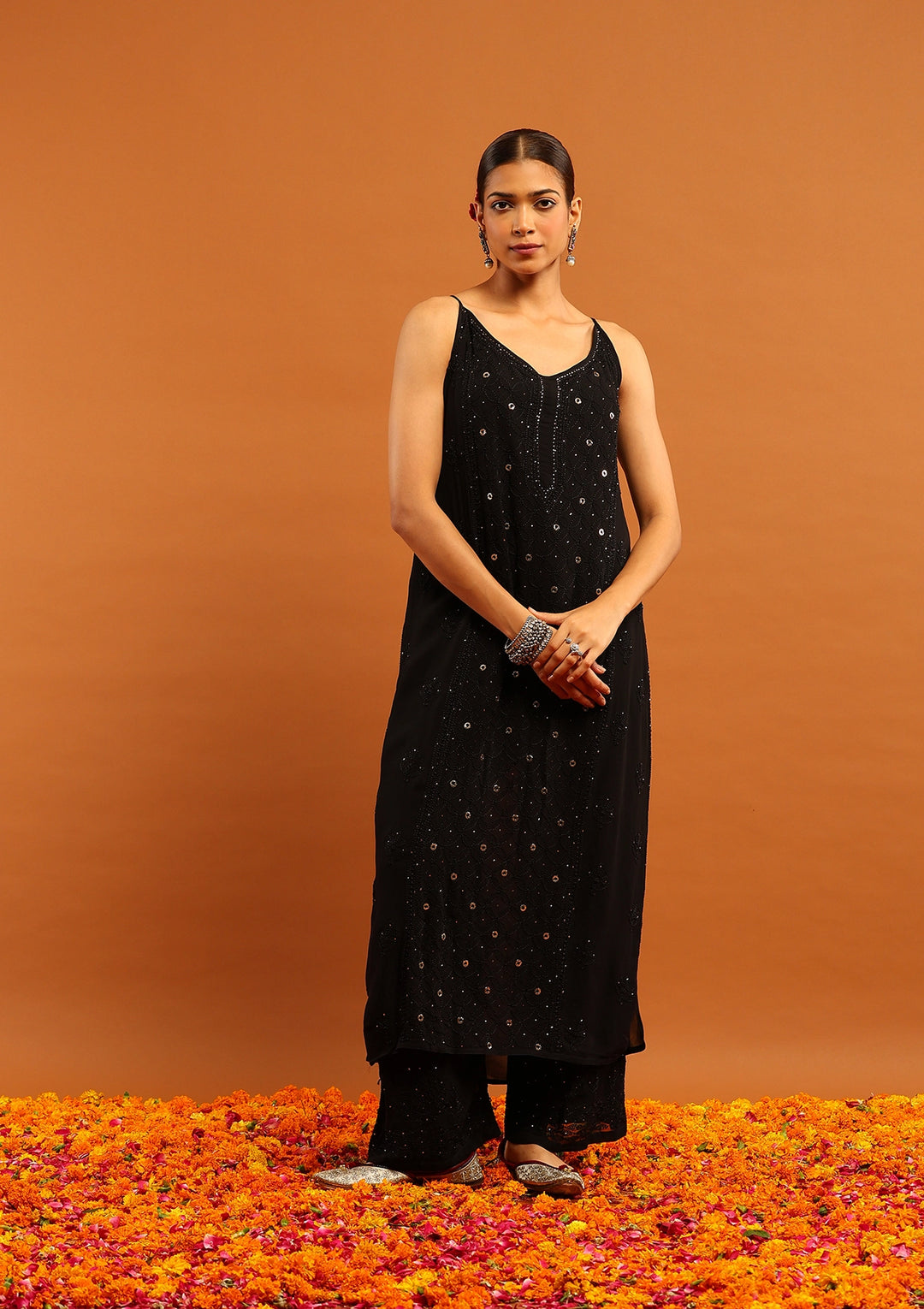 HOC Viscose Georgette Chikankari Mukaish & Kamdani Solid Women's 3 PC Long Kurta Set-Black