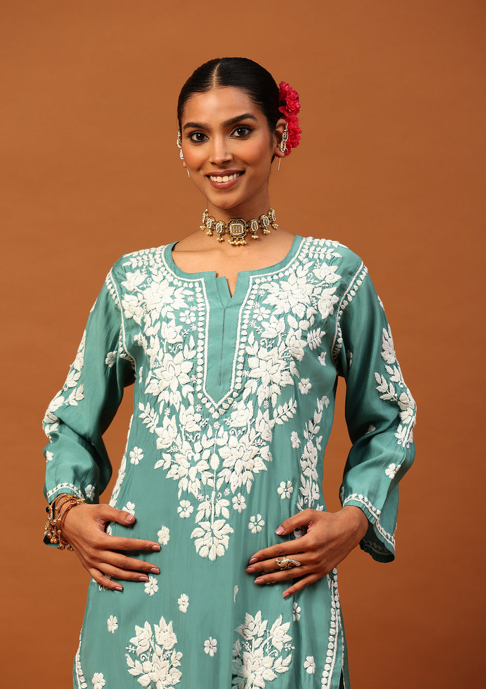 HOC Juhaina Chikankari Cotton Straight Set (Teal Green)