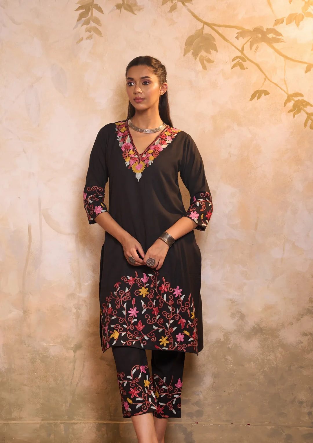 HOC Cotton Aari Embroidered Solid Women's 2 PC Long Kurta Set - Black
