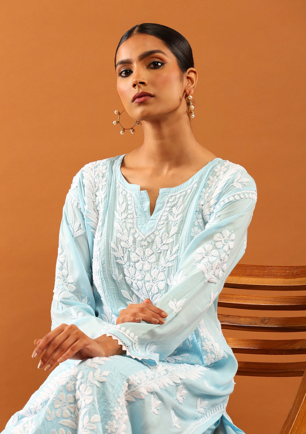 HOC Modal Chikankari Solid Women's 2 PC Long Kurta Set With Lace -Pastel Blue