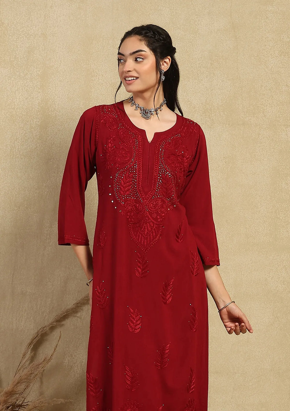 HOC Aari Embroidered Cotton Crush Crepe Solid Women's 2PC Kaftan Set - Wine