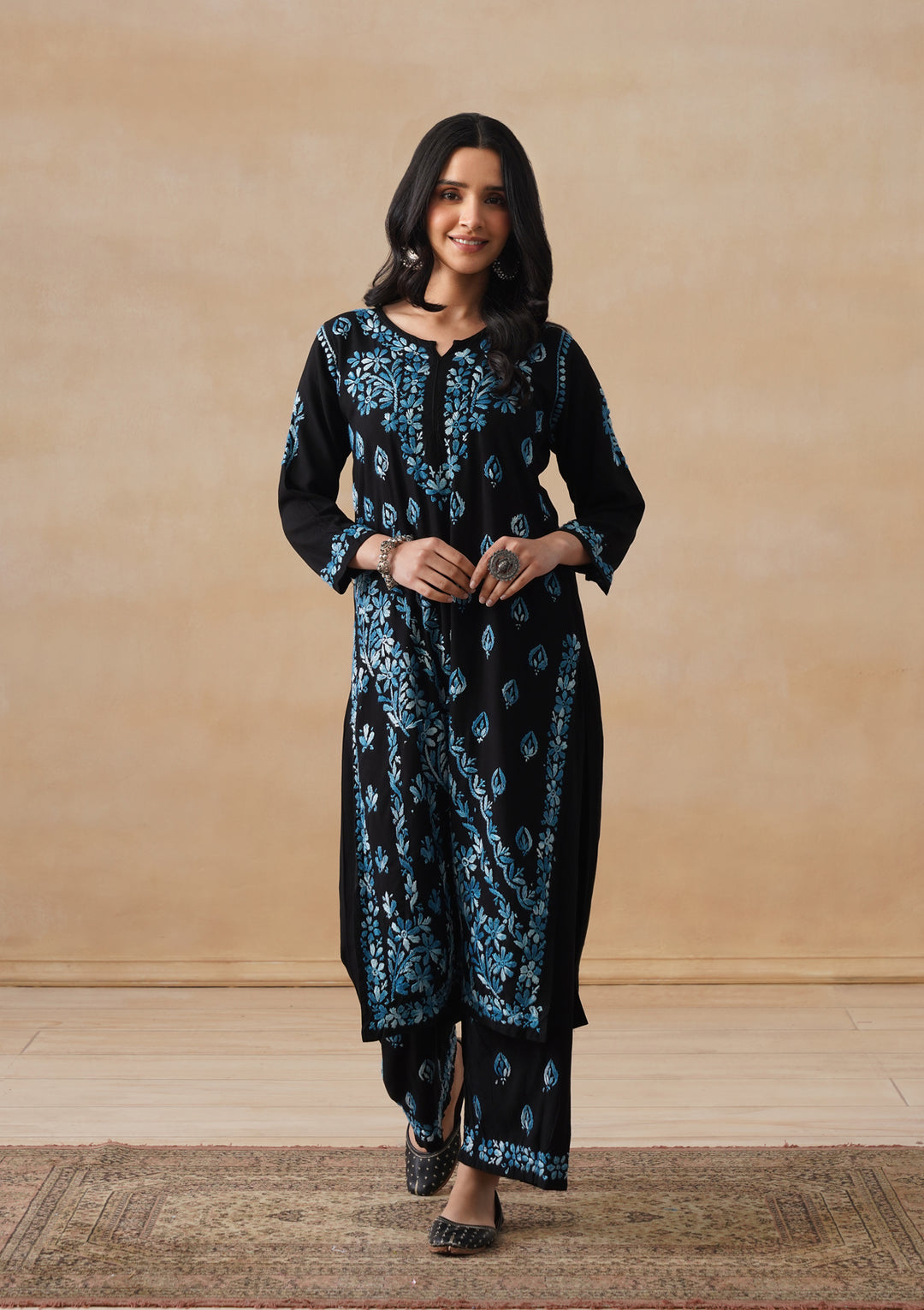 HOC Rayon Chikankari Solid Women's 2 PC Long Kurta Set - Black