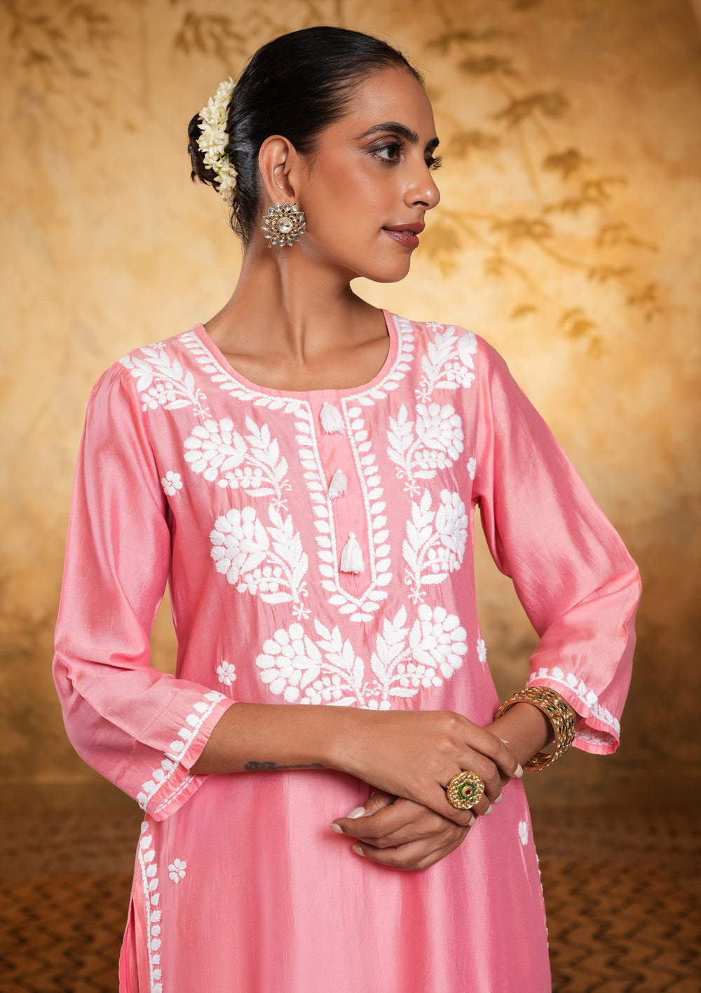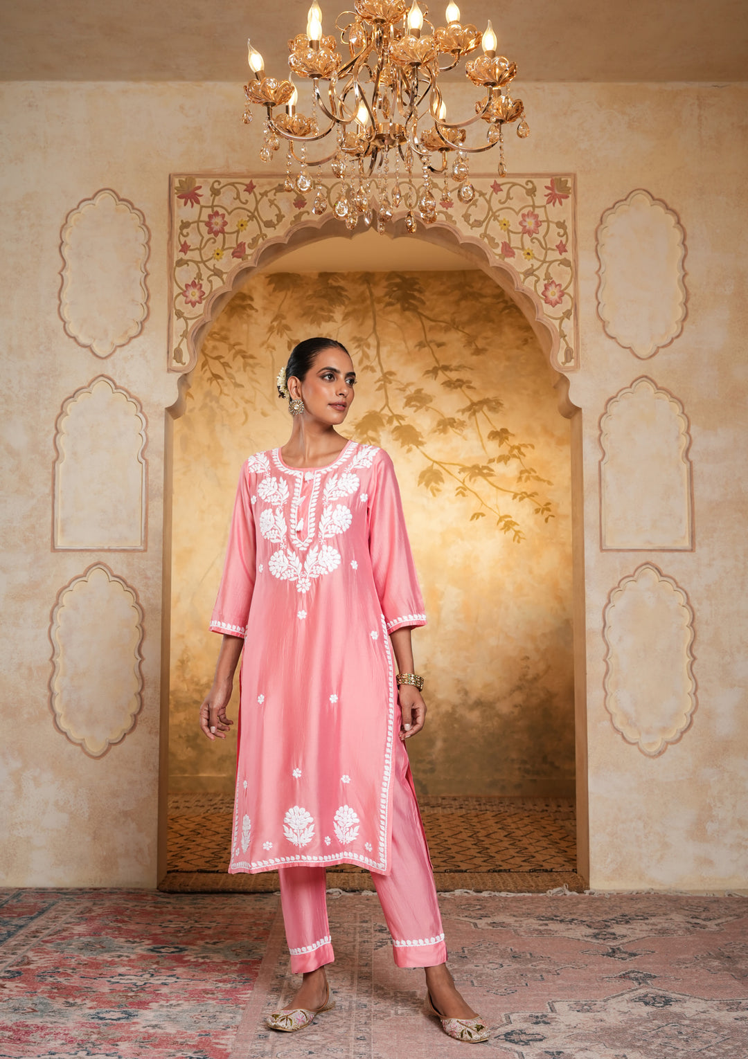 Chanderi Chikankari Solid Women's 2 PC Long Kurta Set - Pink