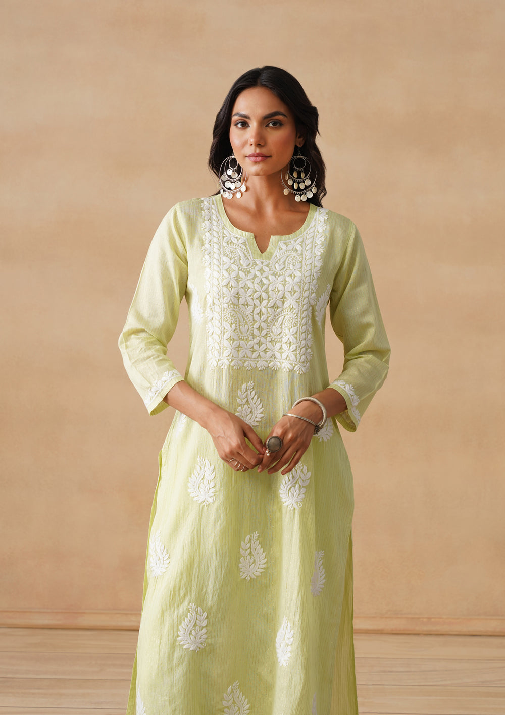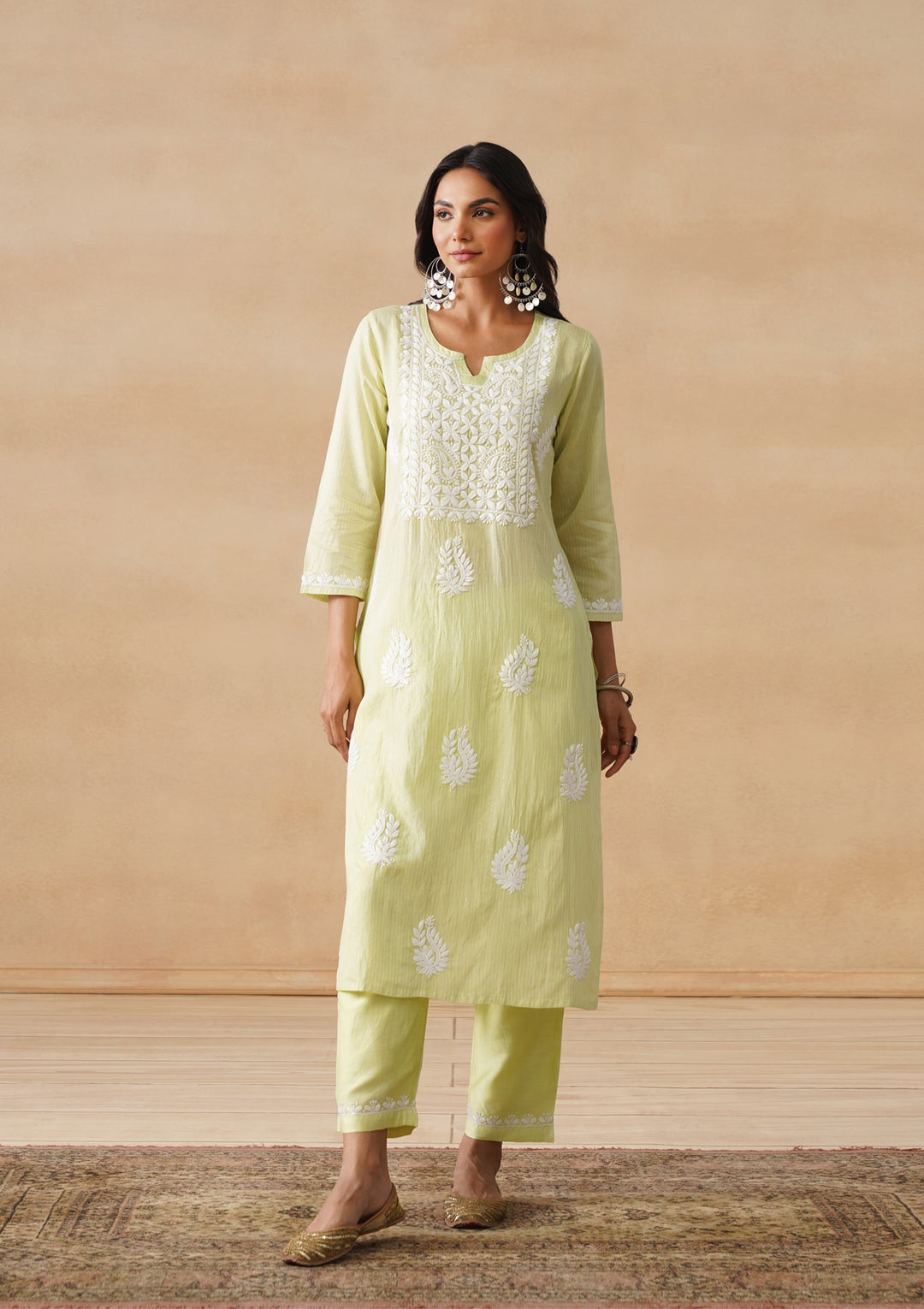 To look classy in a chikankari kurta set, pair it with a matching Chikankari bottomwear such as palazzo pants or a flared skirt. Choose lightweight fabrics like Rayon chikankari kurta set, cotton or silk for a comfortable and elegant look. Accessorize chikankari suit set with minimal jewelry and a simple hairstyle to let the intricate embroidery take center stage.