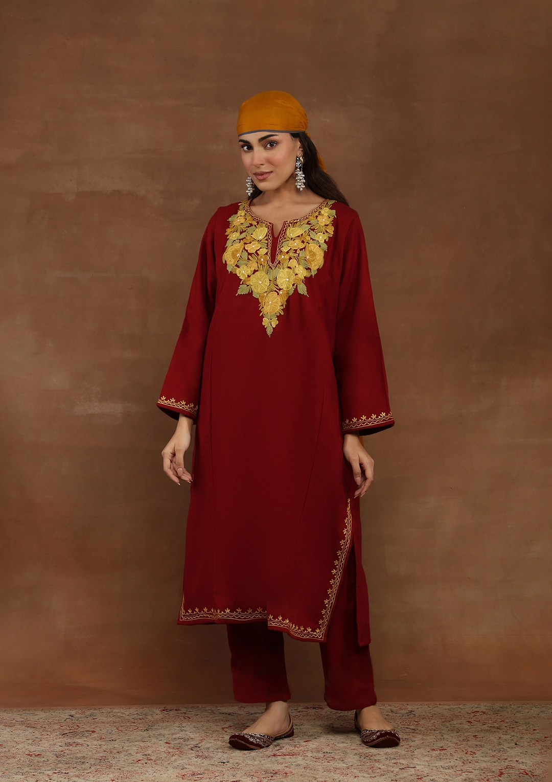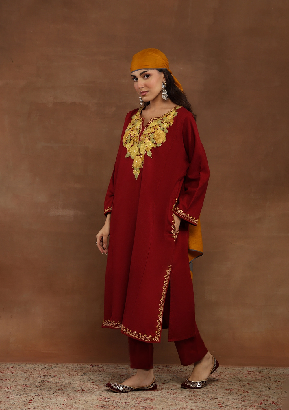 HOC Aari Embroidered Woollen Solid Women's Long Kurta - Olive Green