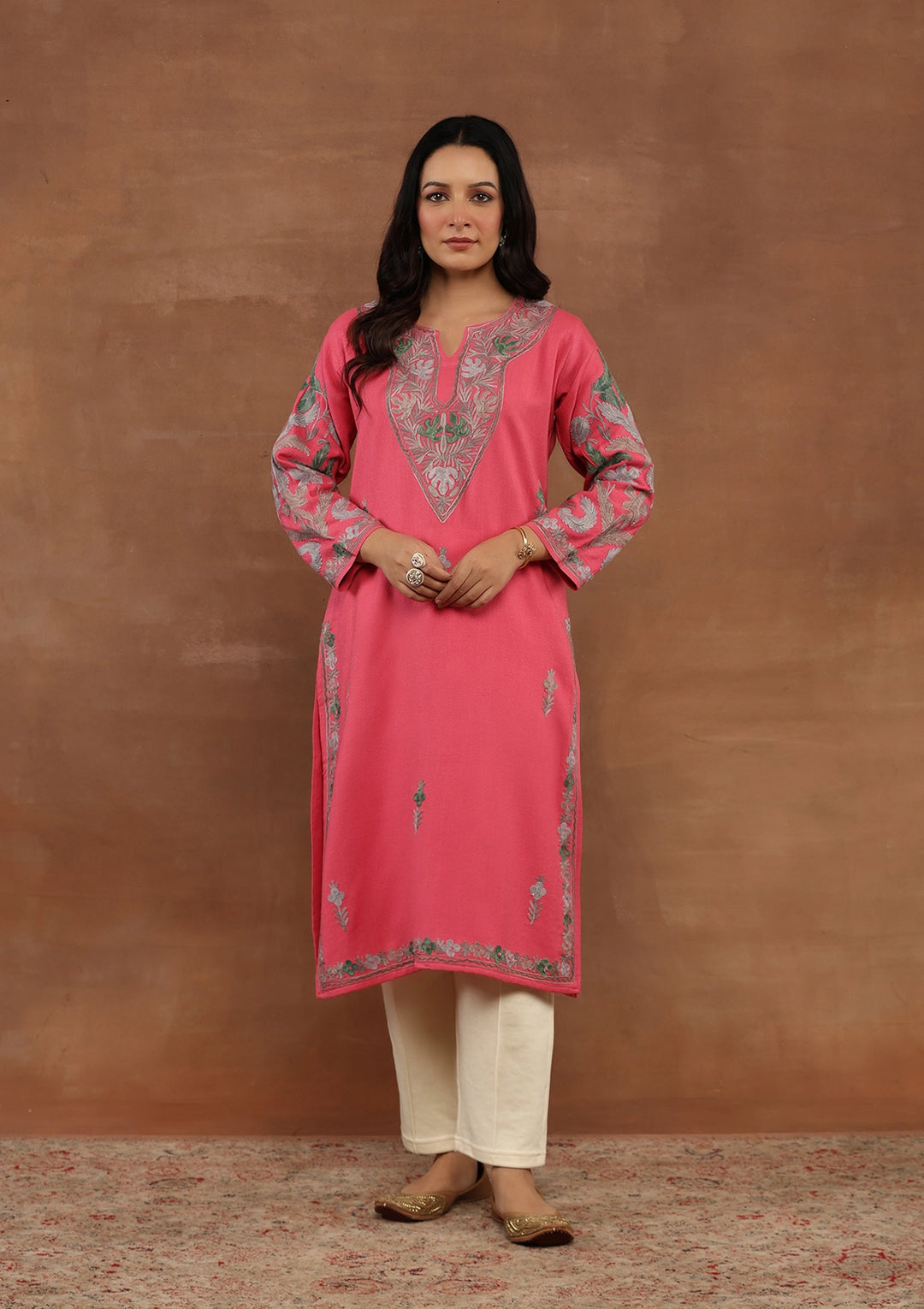 HOC Aari Embroidered Woollen Solid Women's Long Kurta - Green