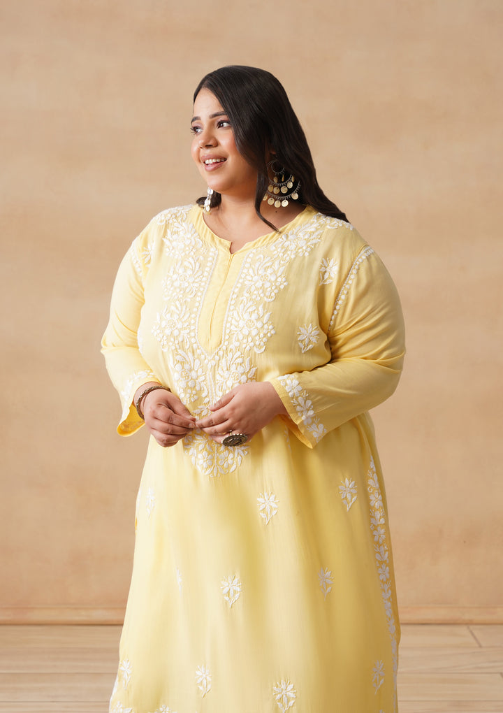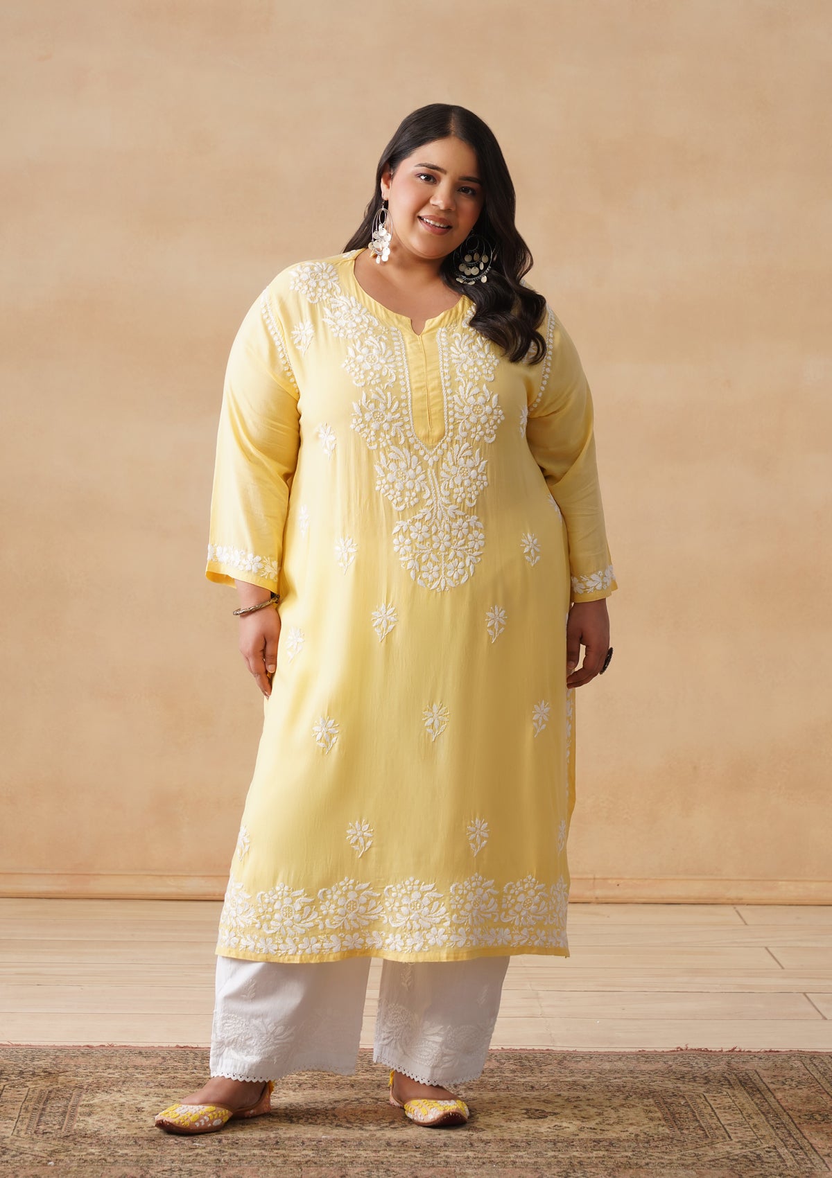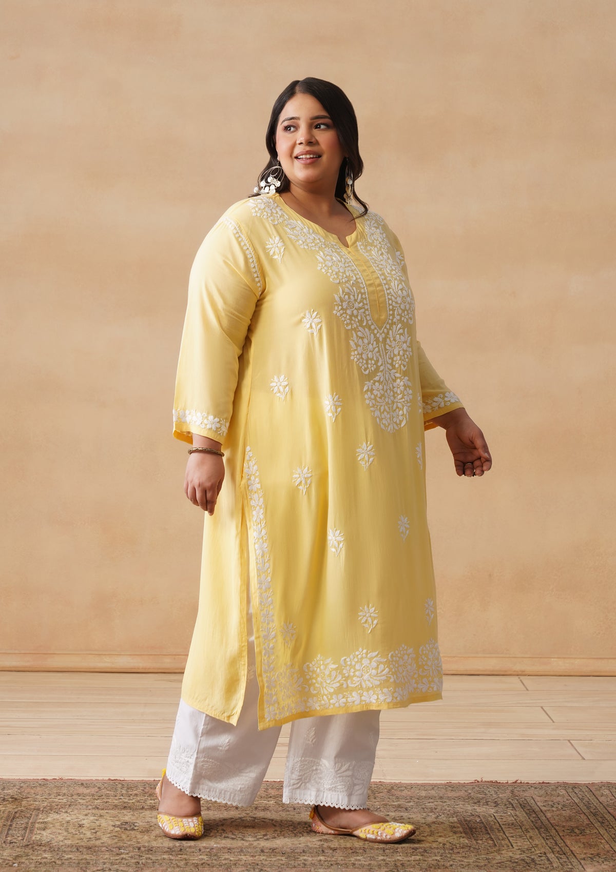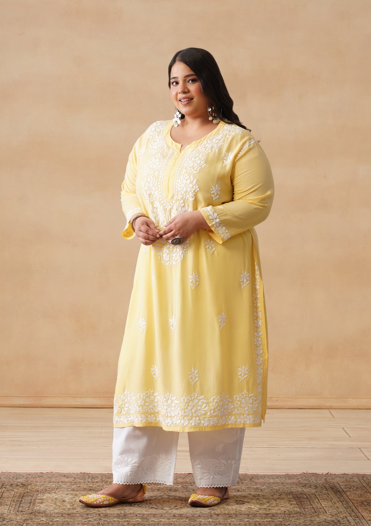 HOC Modal Chikankari Solid Women's Long Kurta - Yellow