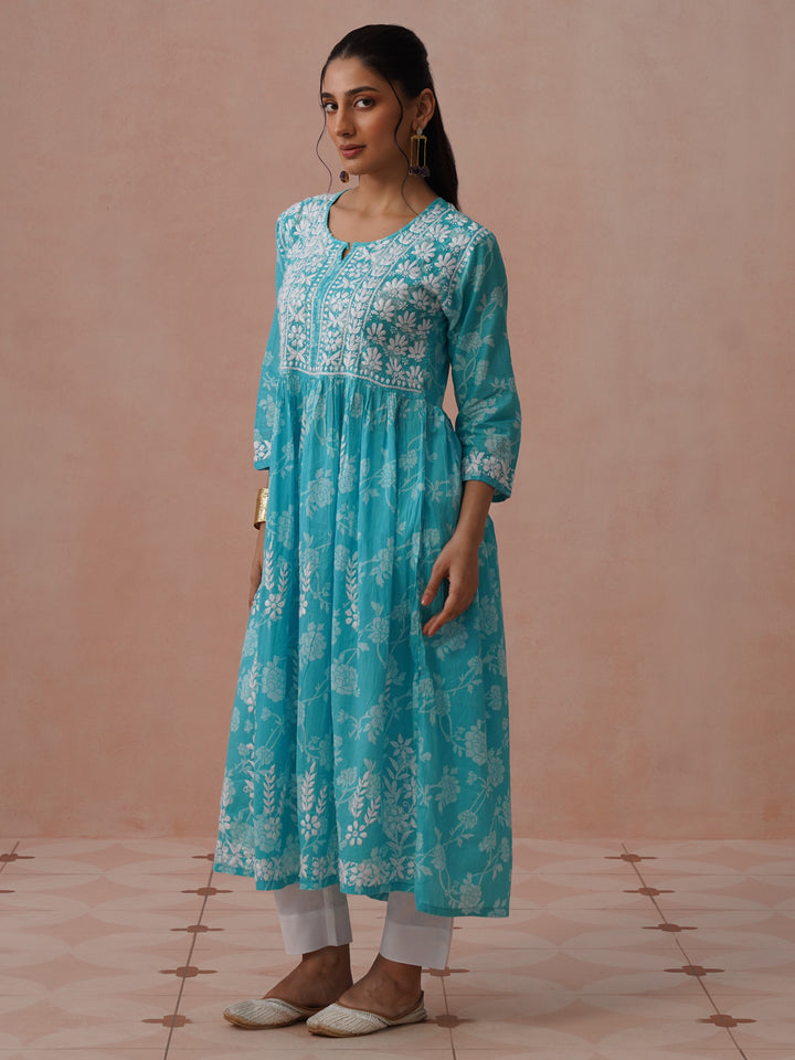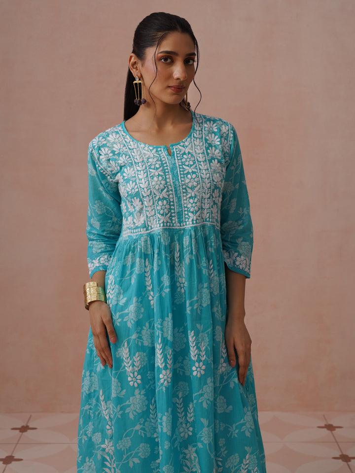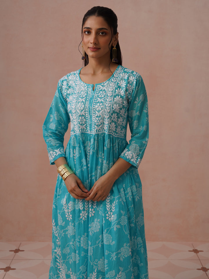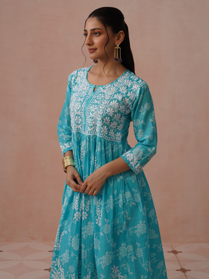 HOC Mulmul Chikankari Printed Women's Long Gown - Light Blue