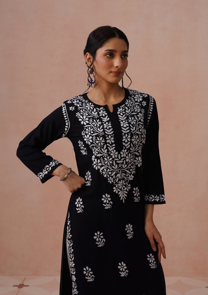 HOC Rayon Chikankari Solid Women's Long Kurta - Black