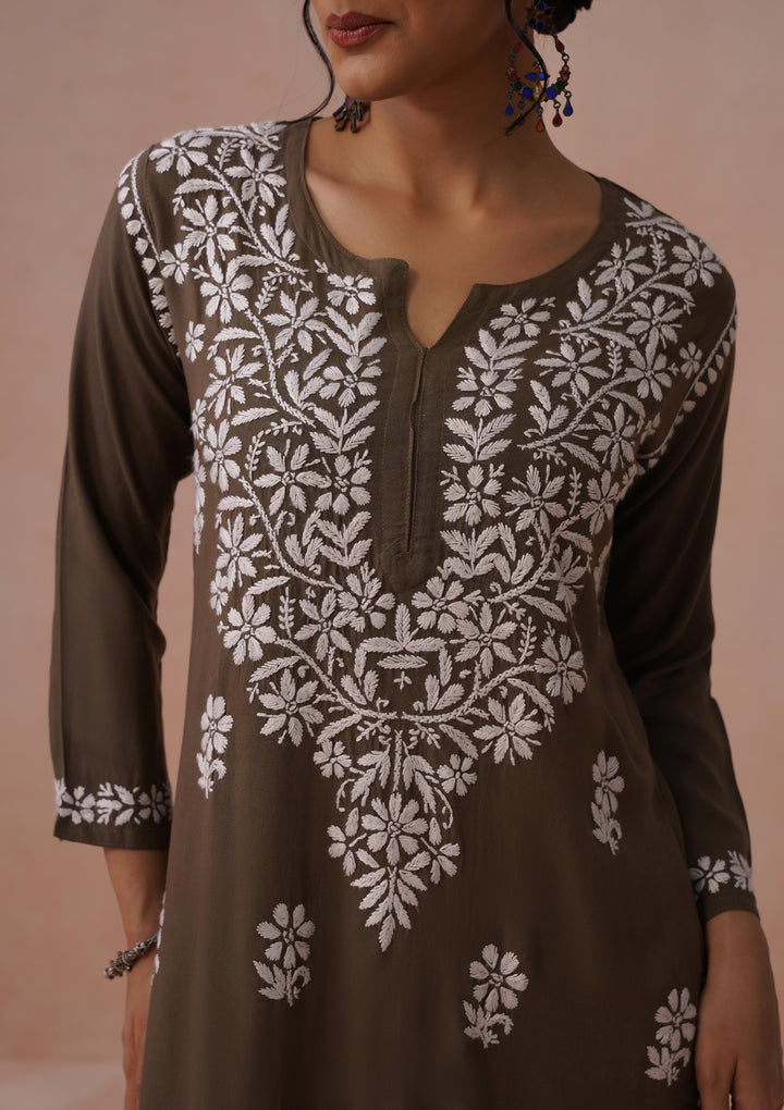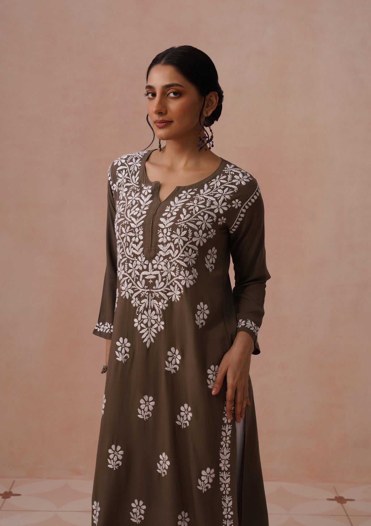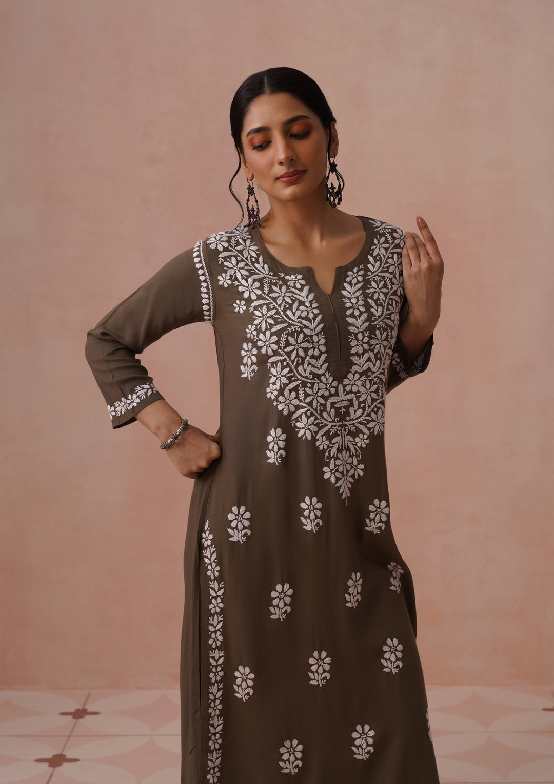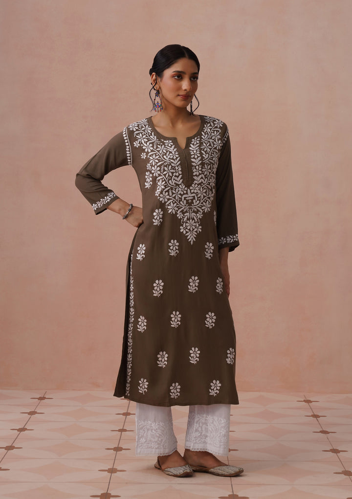 HOC Rayon Chikankari Solid Women's Long Kurta - Brown