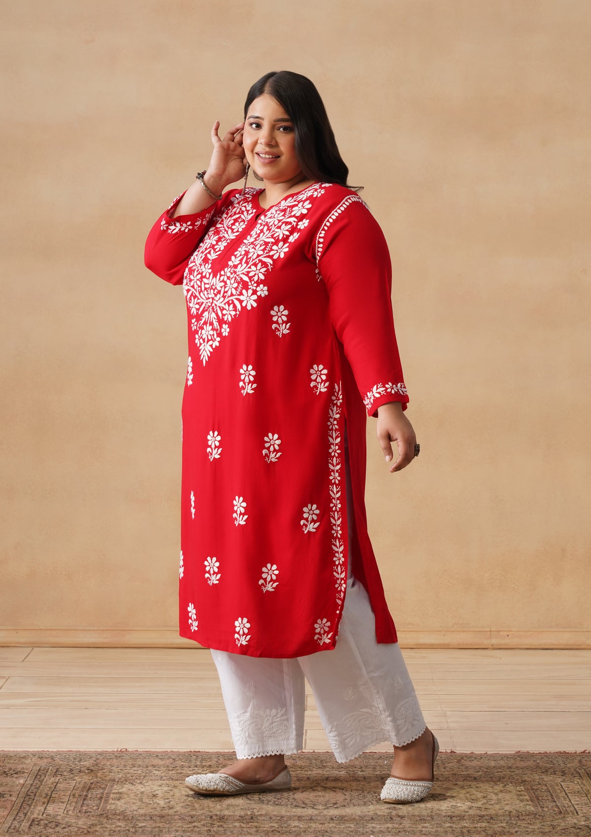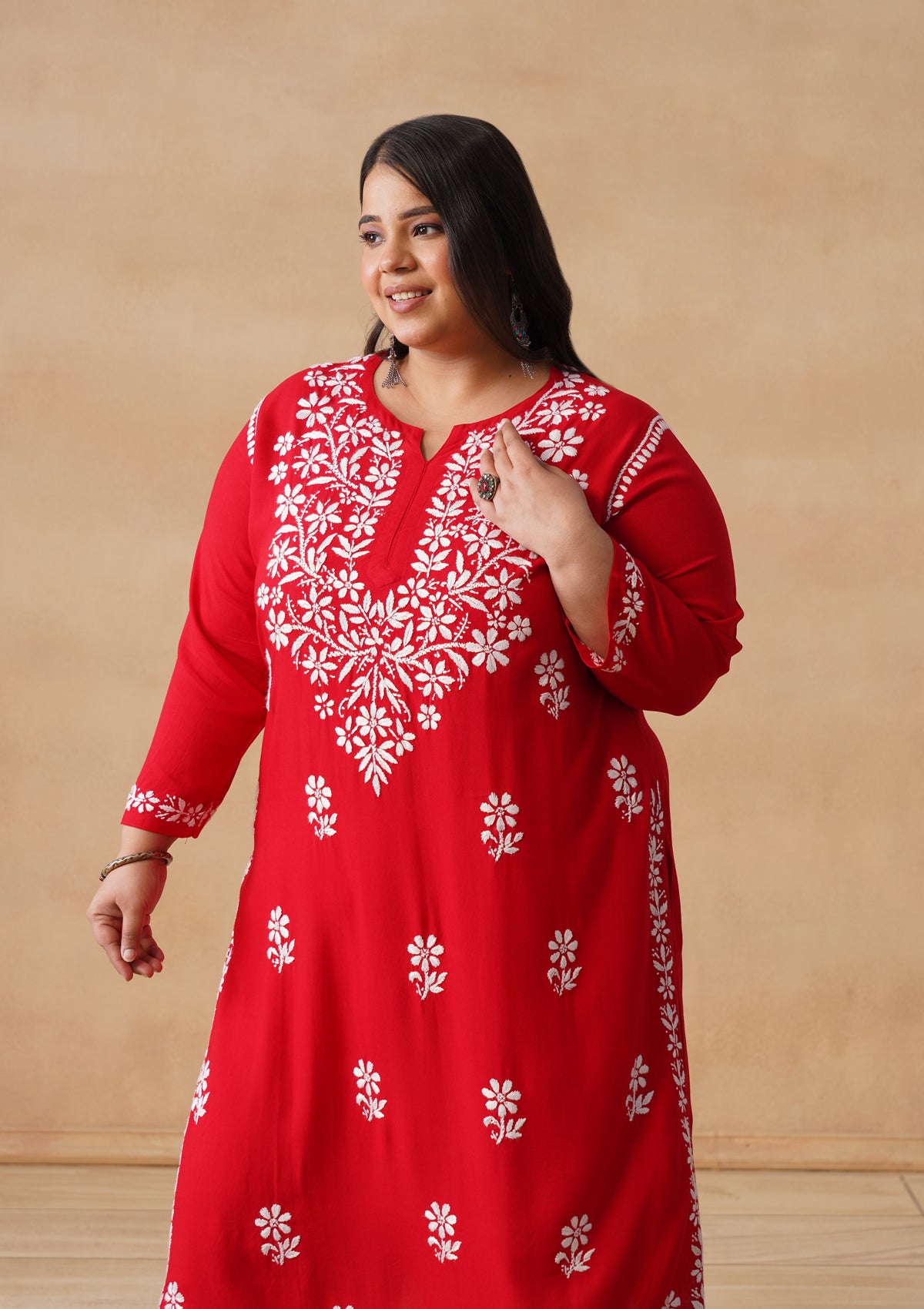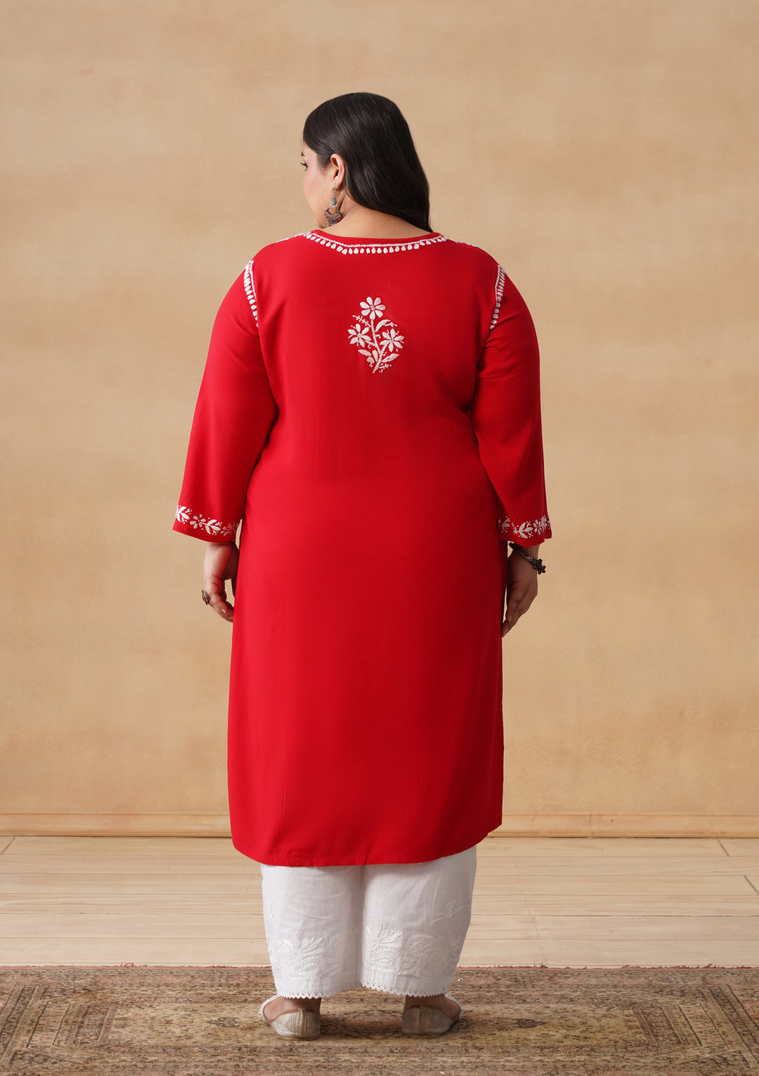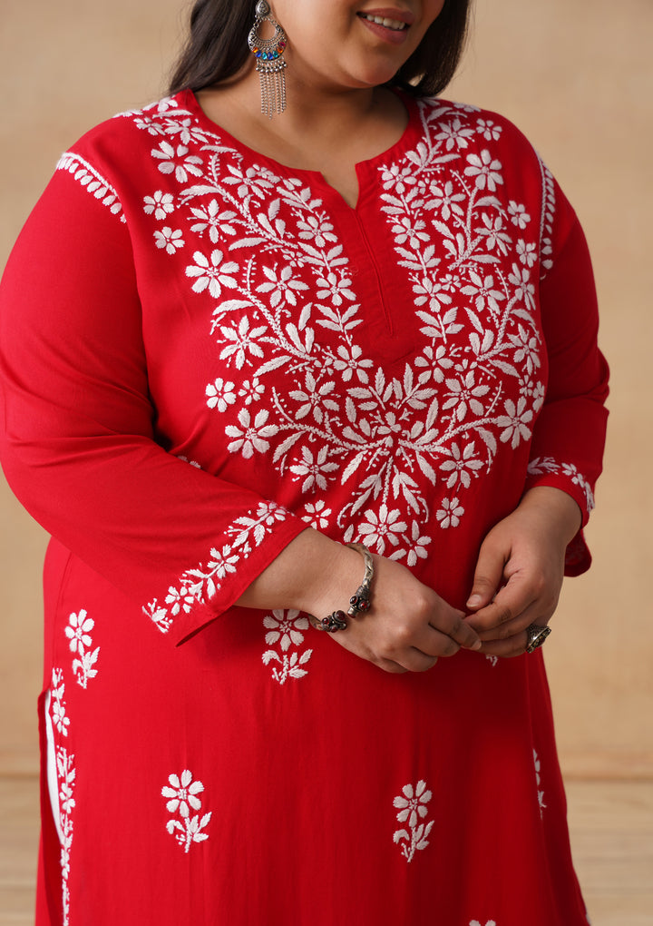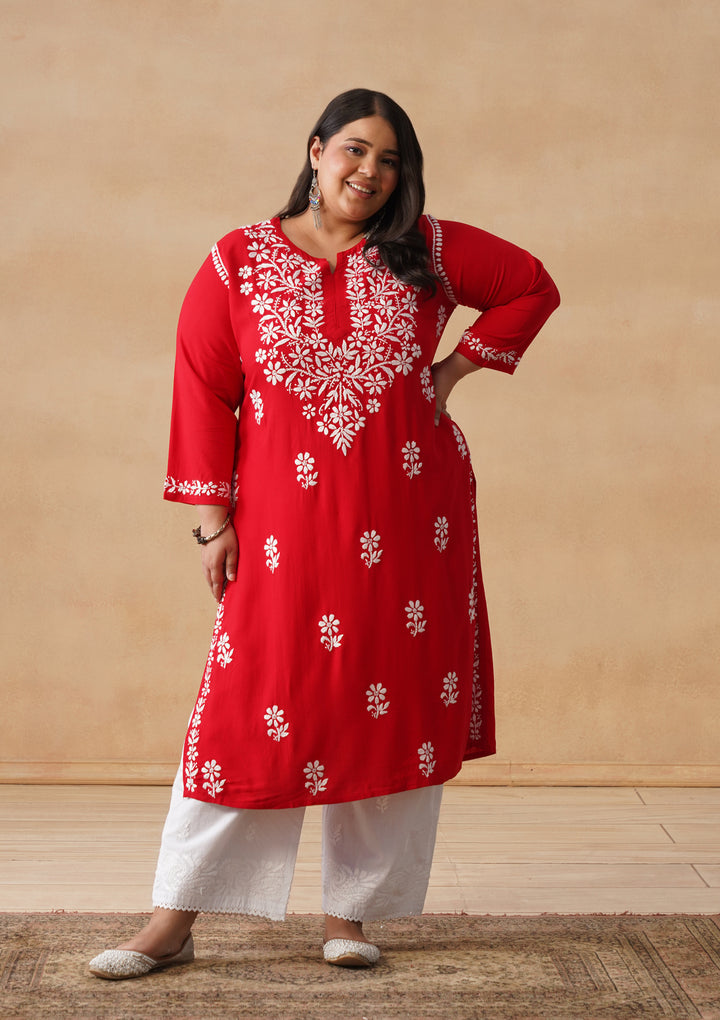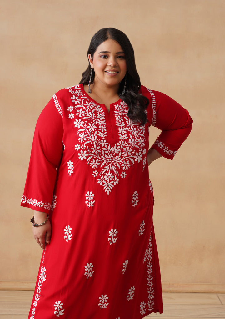 HOC Rayon Chikankari Solid Women's Long Kurta - Red