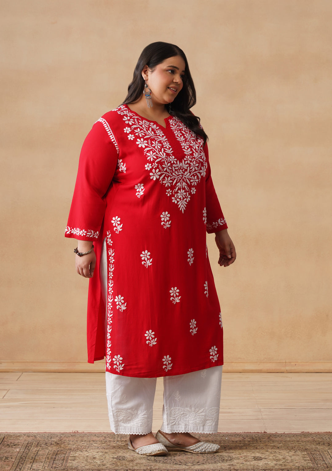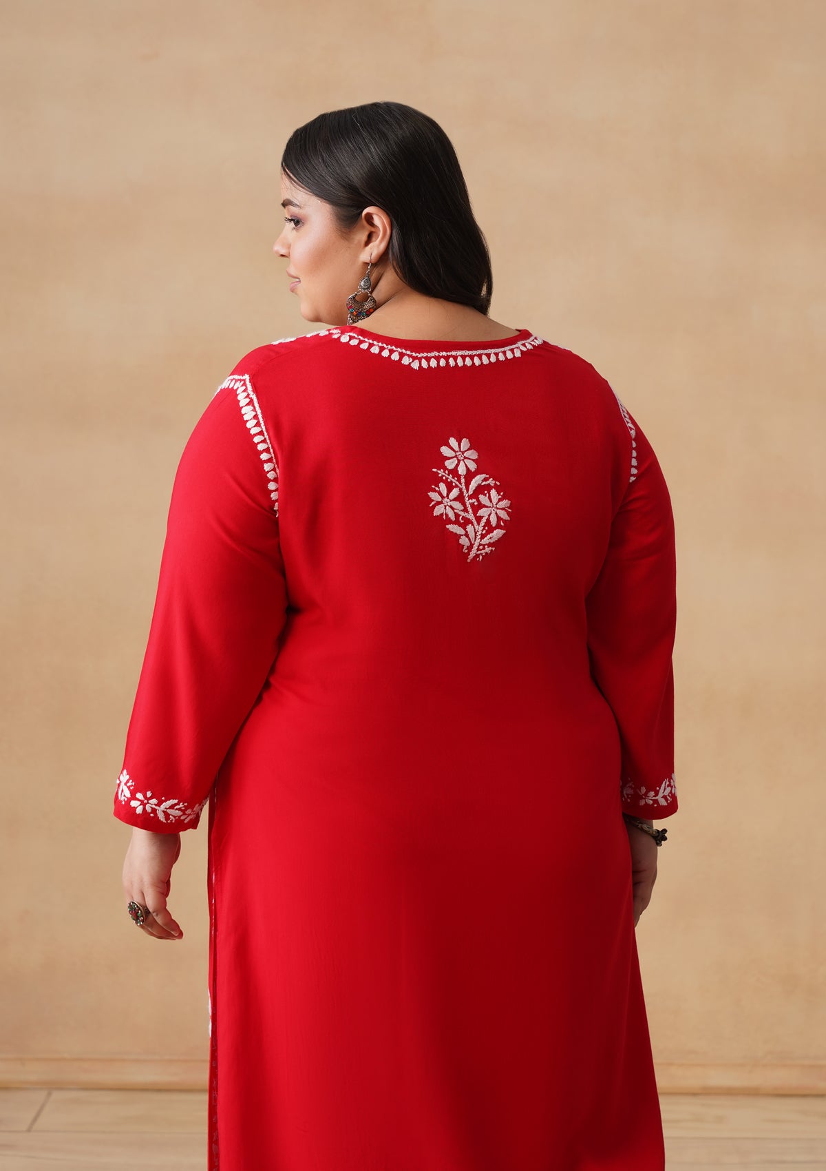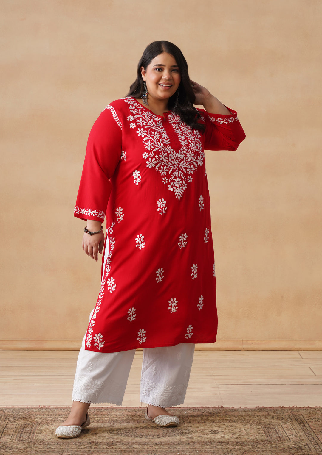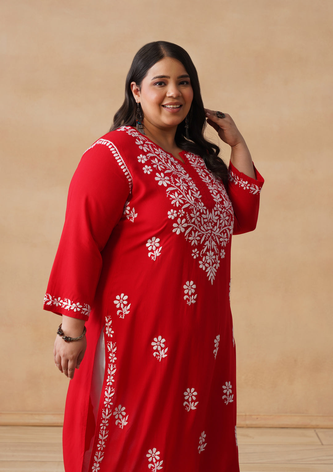 HOC Rayon Chikankari Solid Women's Long Kurta - Red