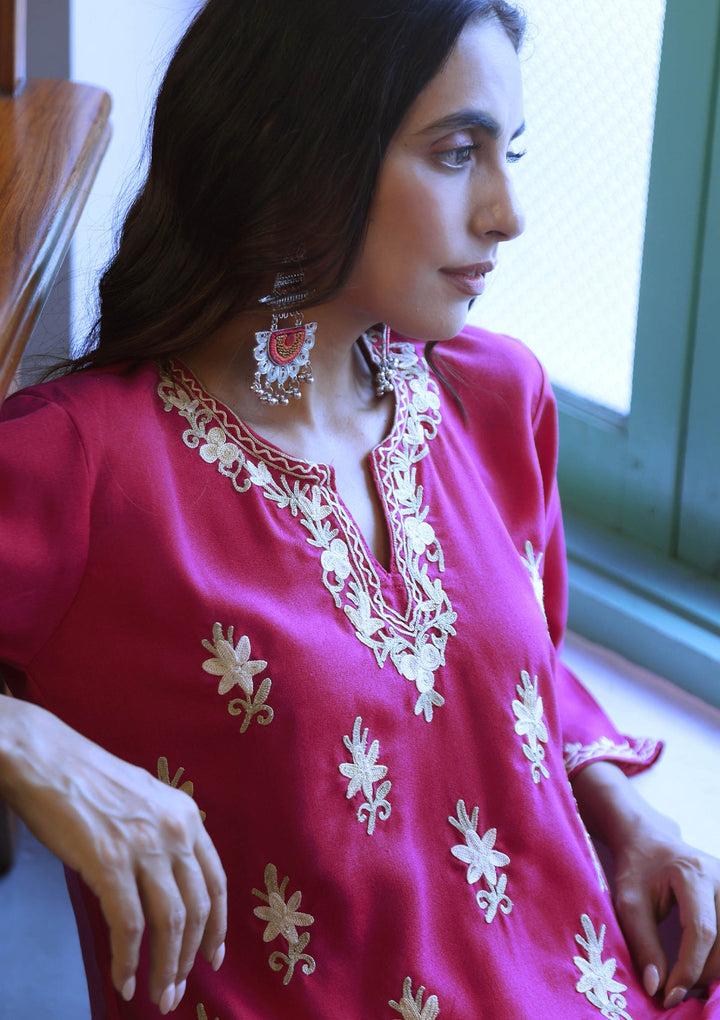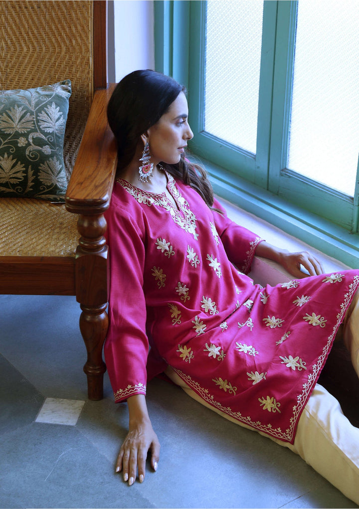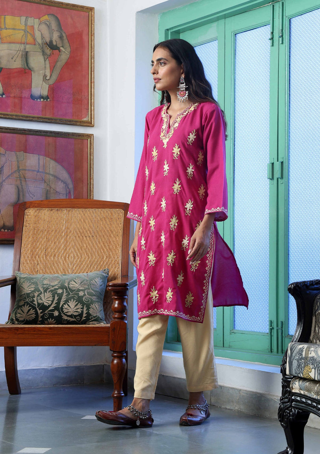 HOC Aari Embroidered Cotton Solid Women's Long Kurta - Pink