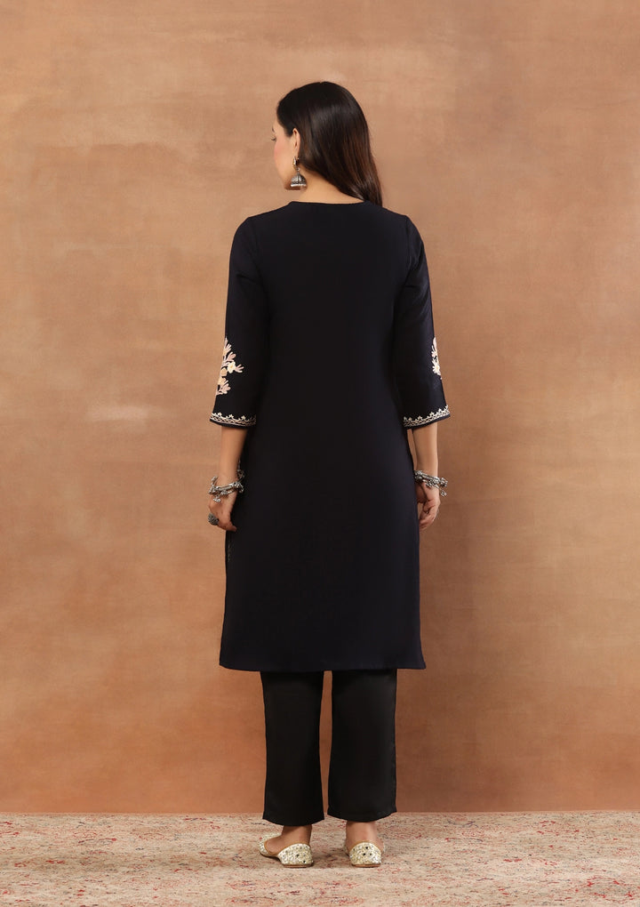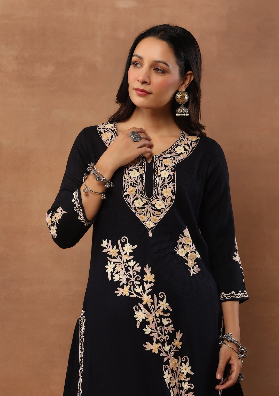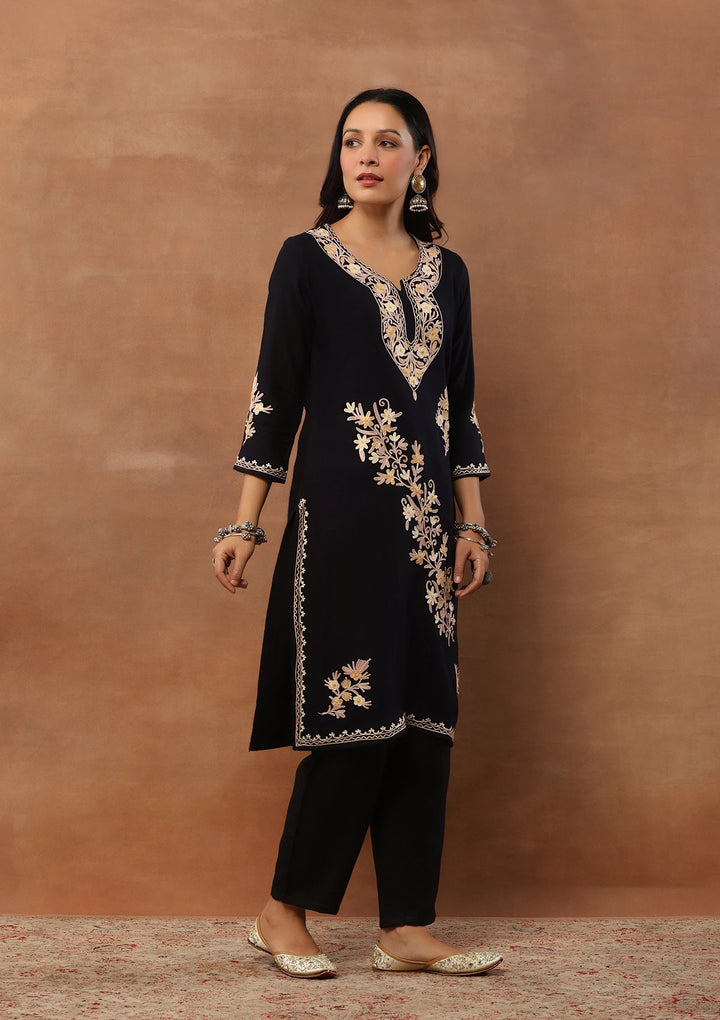 HOC Aari Embroidered Woollen Solid Women's Long Kurta - Black