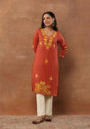 HOC Aari Embroidered Woollen Solid Women's Long Kurta - Coral