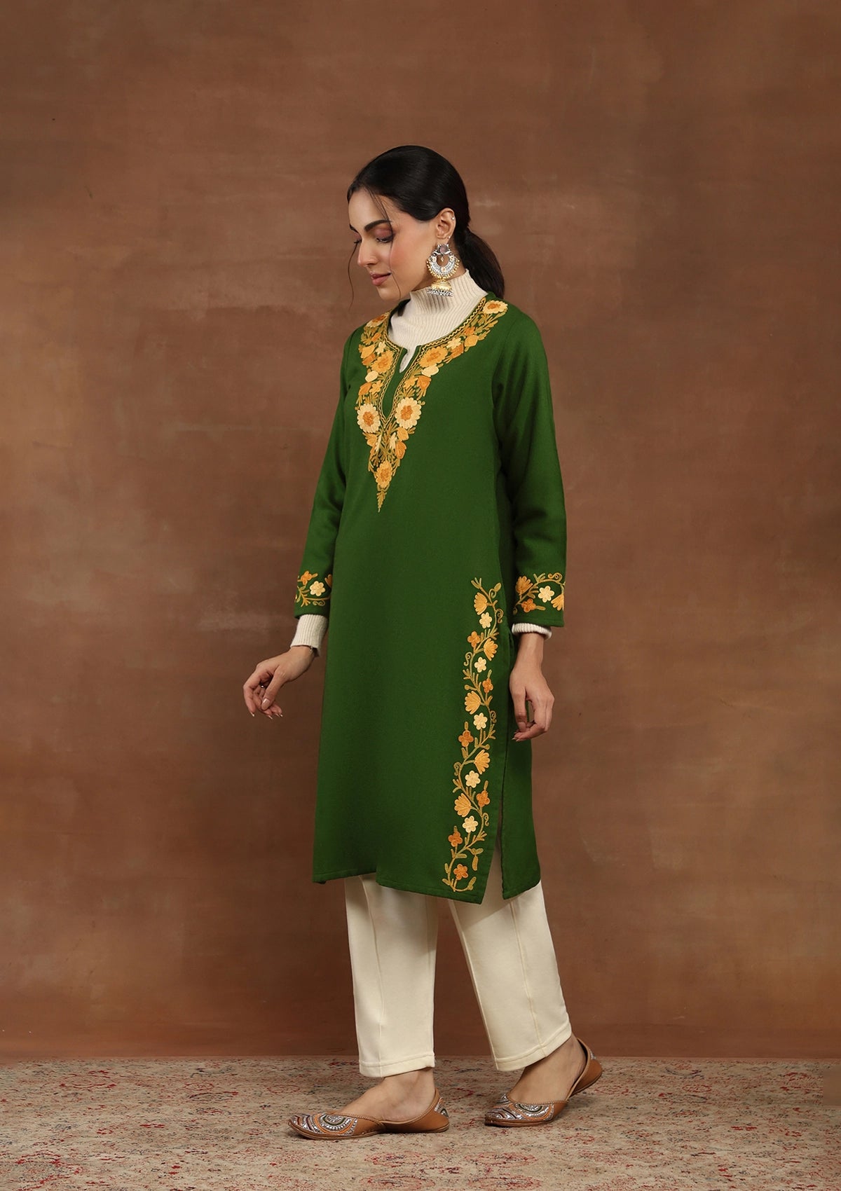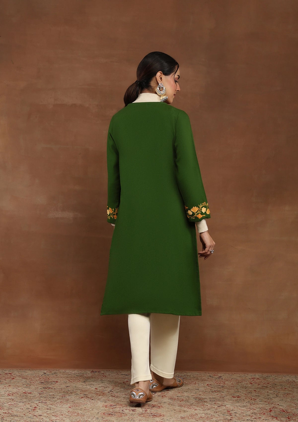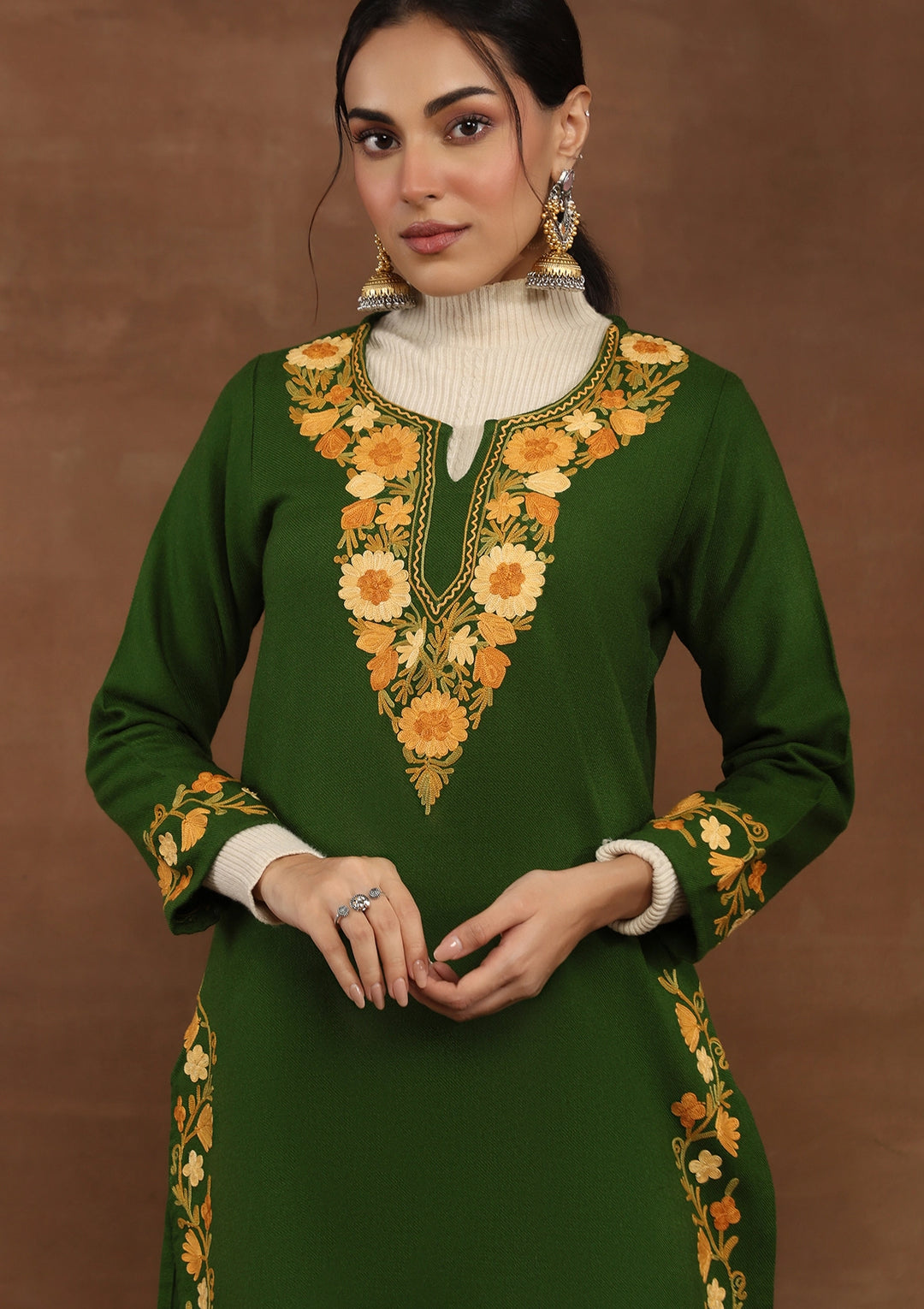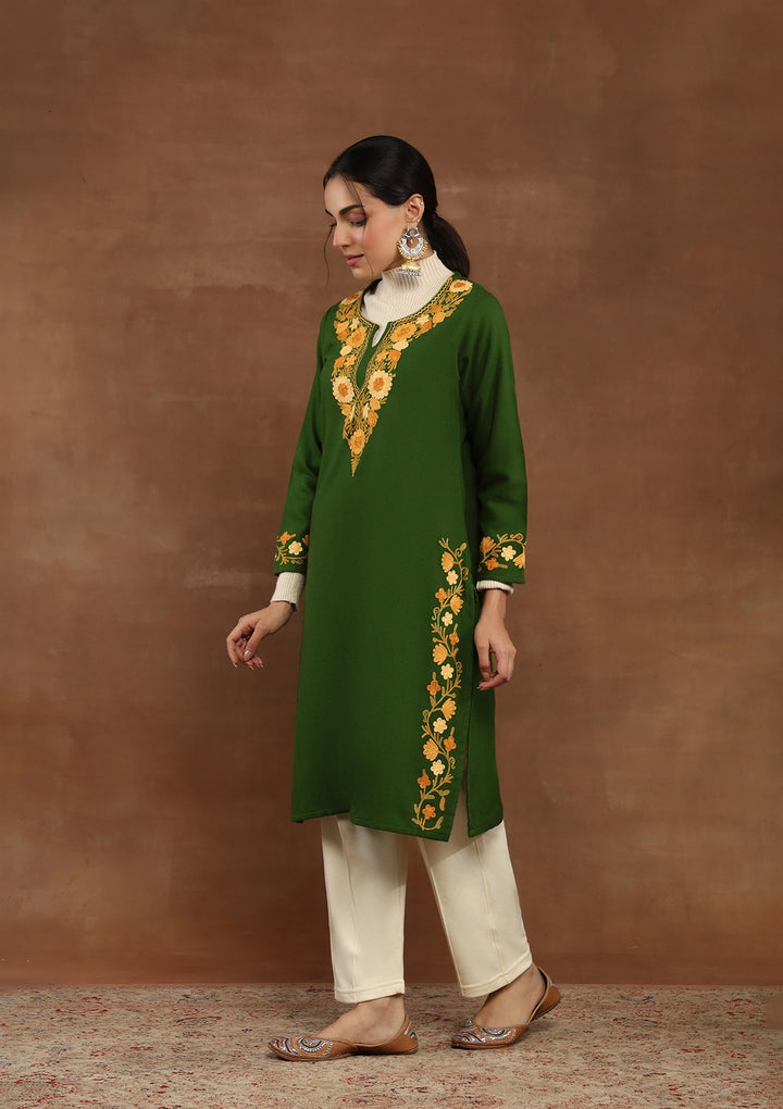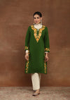 HOC Kashmiri Wool Aari Embroidered Solid Women's Long Kurta -Green