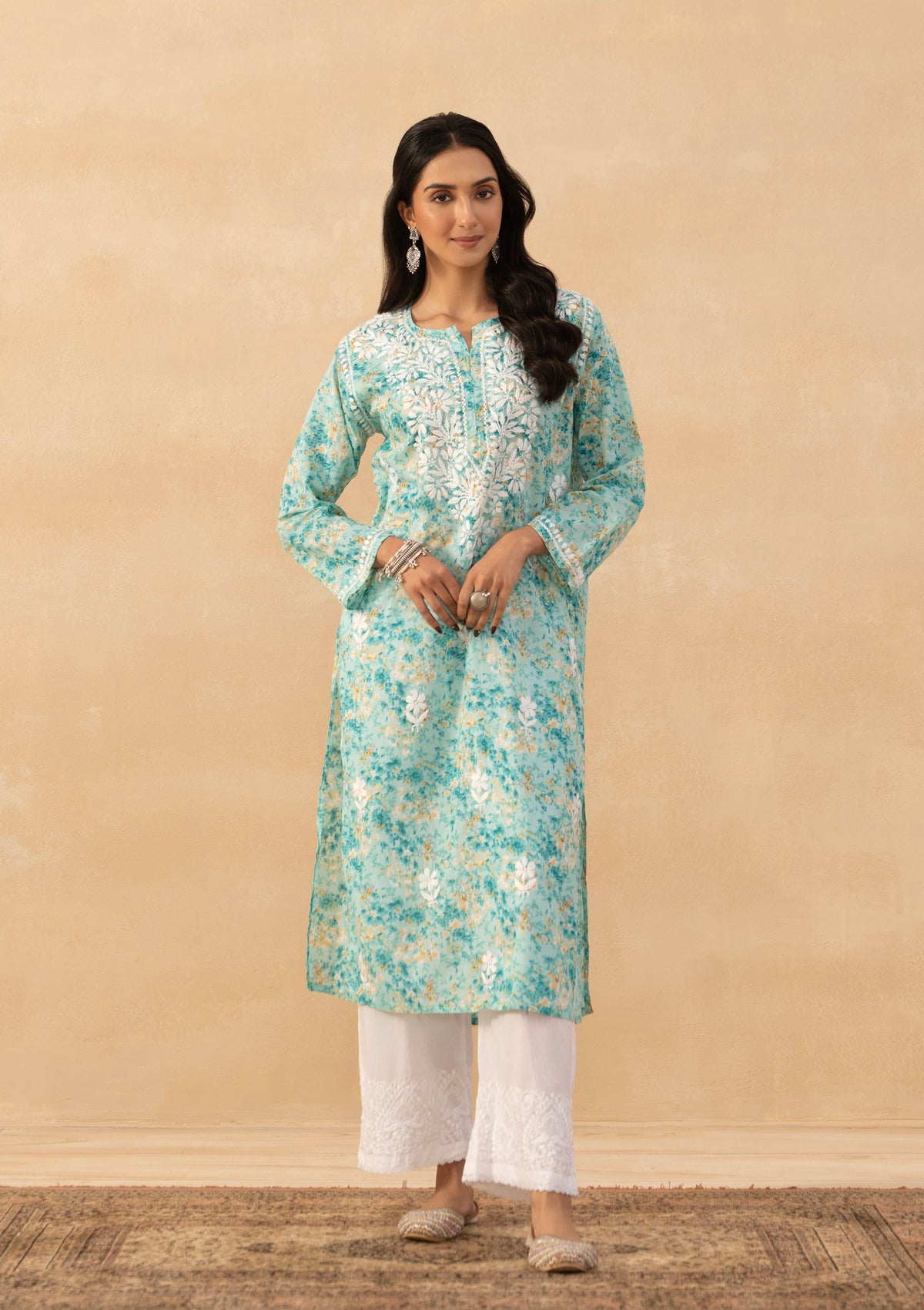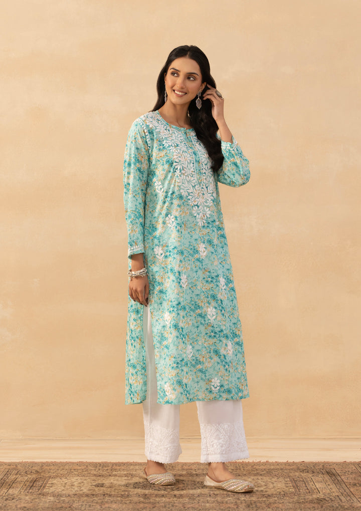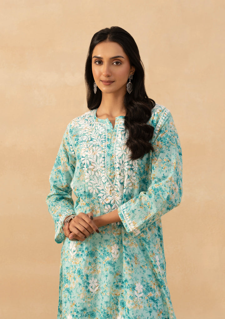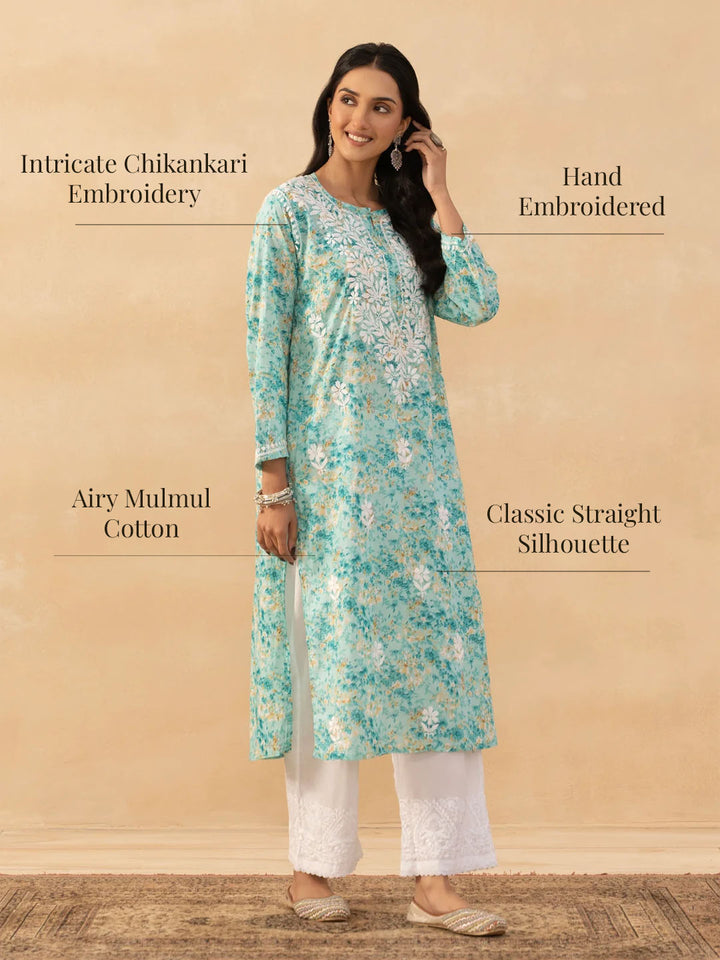 HOC Mulmul Chikankari Printed Women's Long Kurta - Green