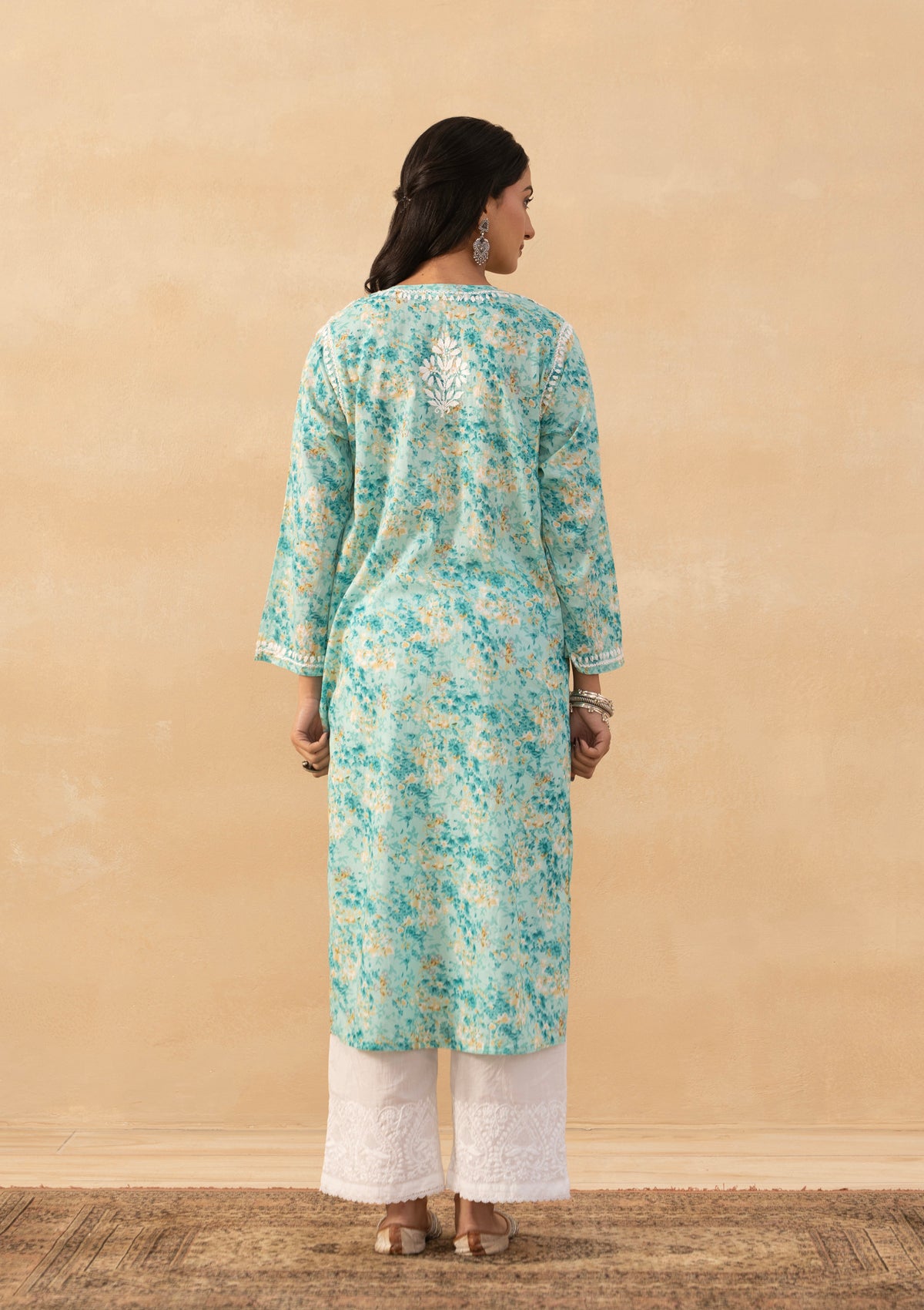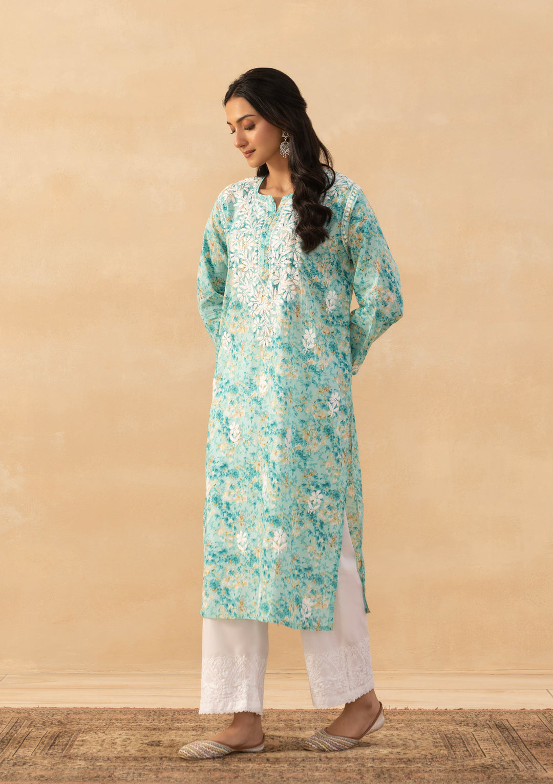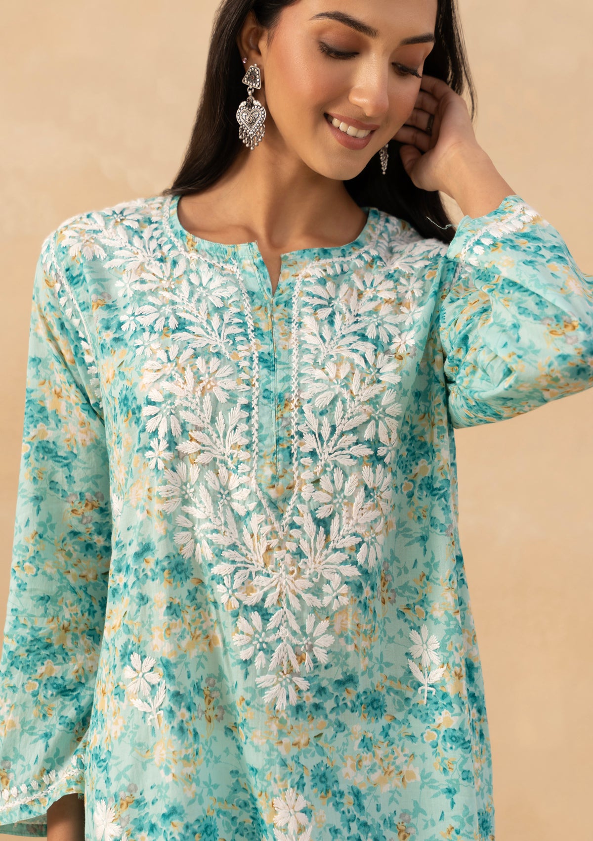 HOC Mulmul Chikankari Printed Women's Long Kurta - Green