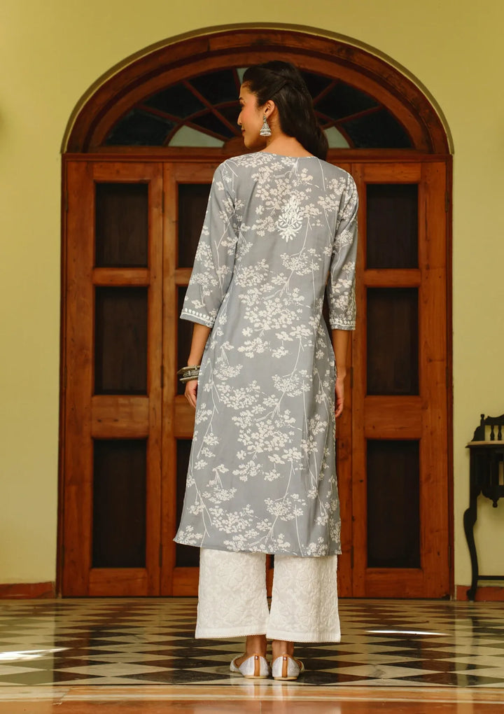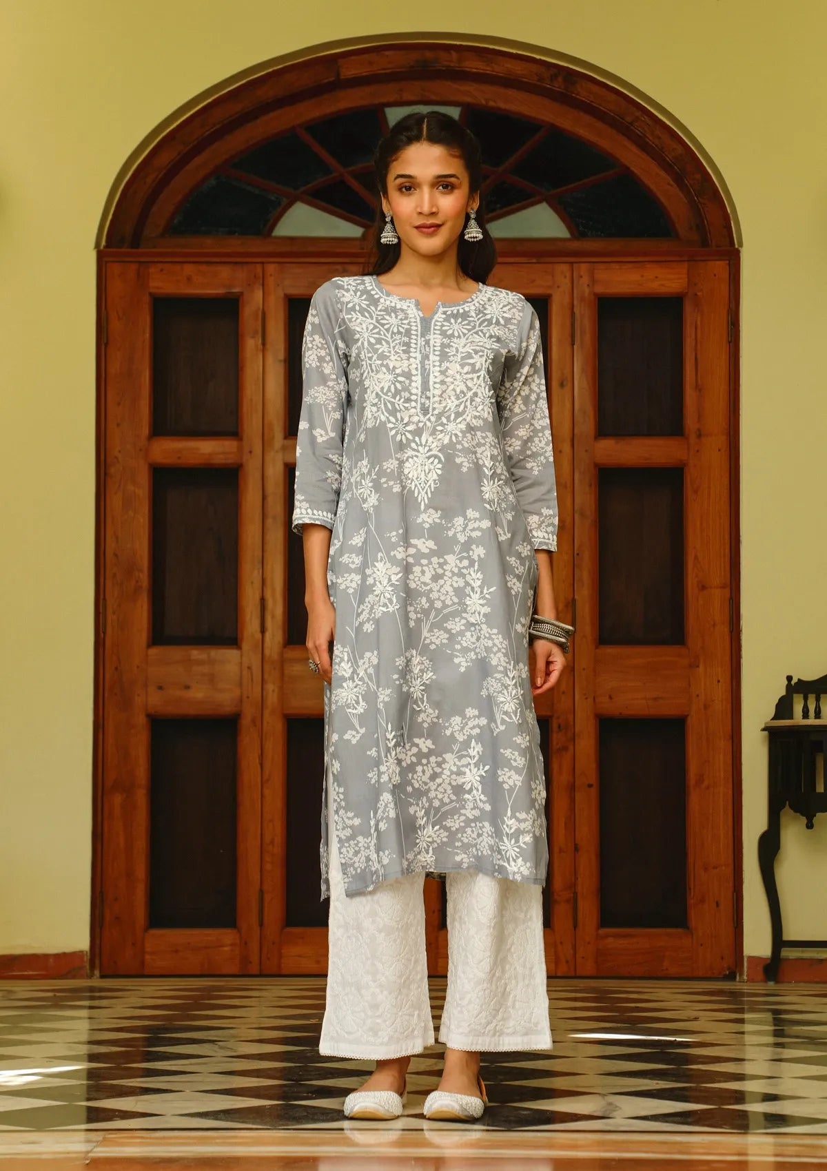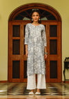 HOC Zainab Chikankari Mulmul Printed Straight Kurta -Grey