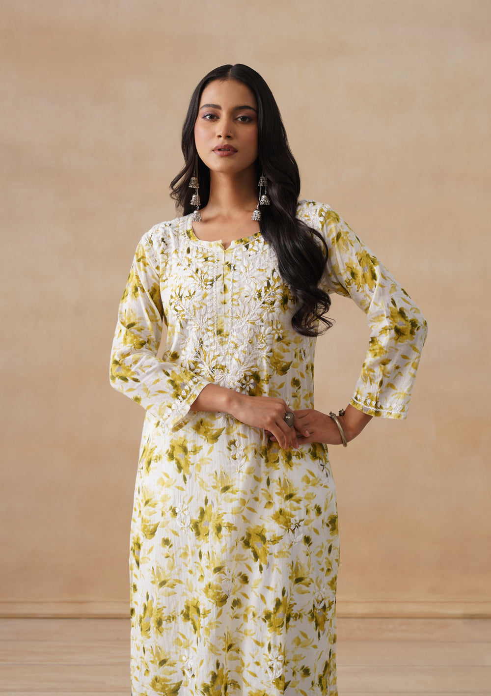 HOC Zainab Chikankari Mulmul Printed Straight Kurta -Yellow