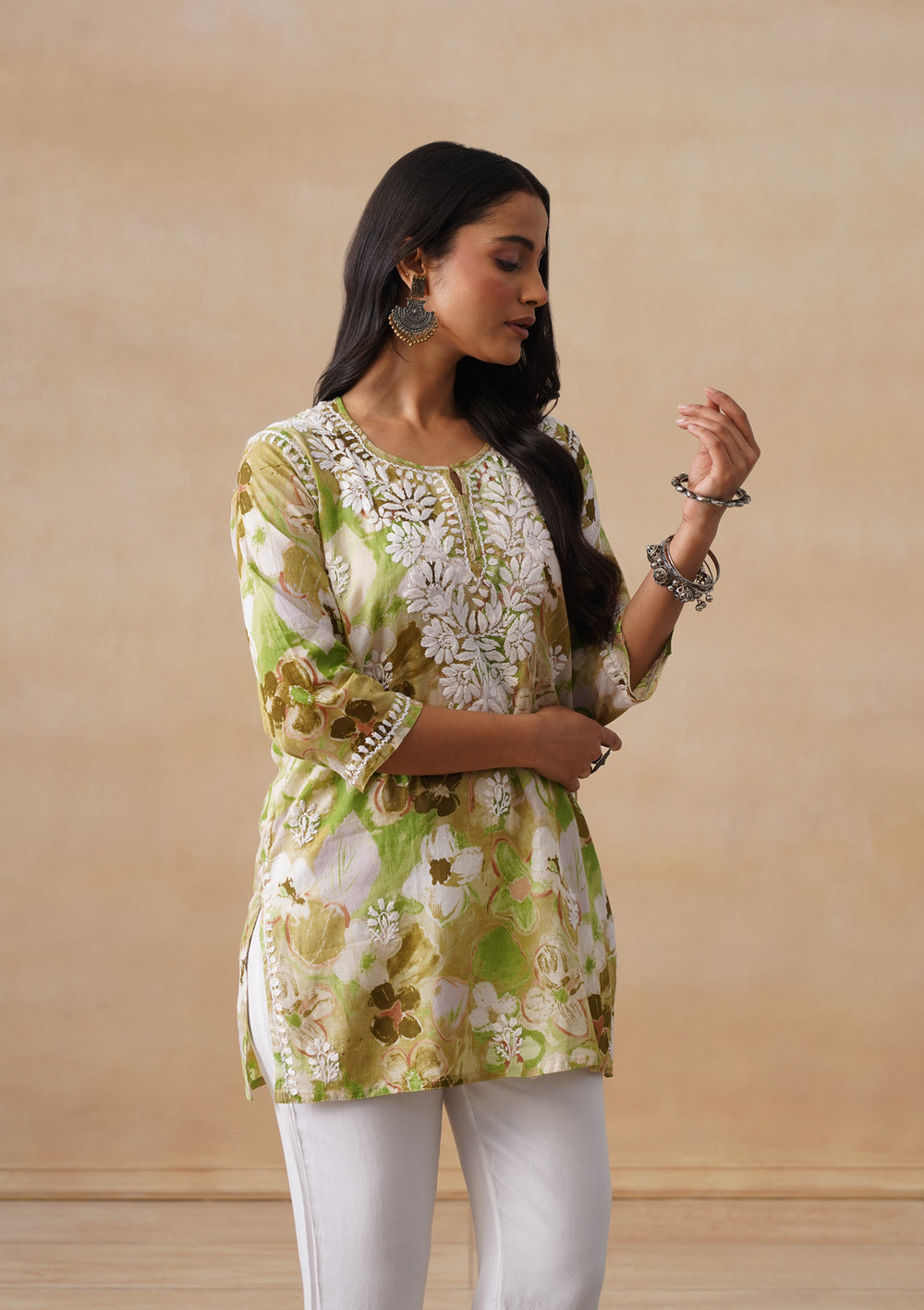 HOC Mulmul Chikankari Printed Women's Short Kurta - Green