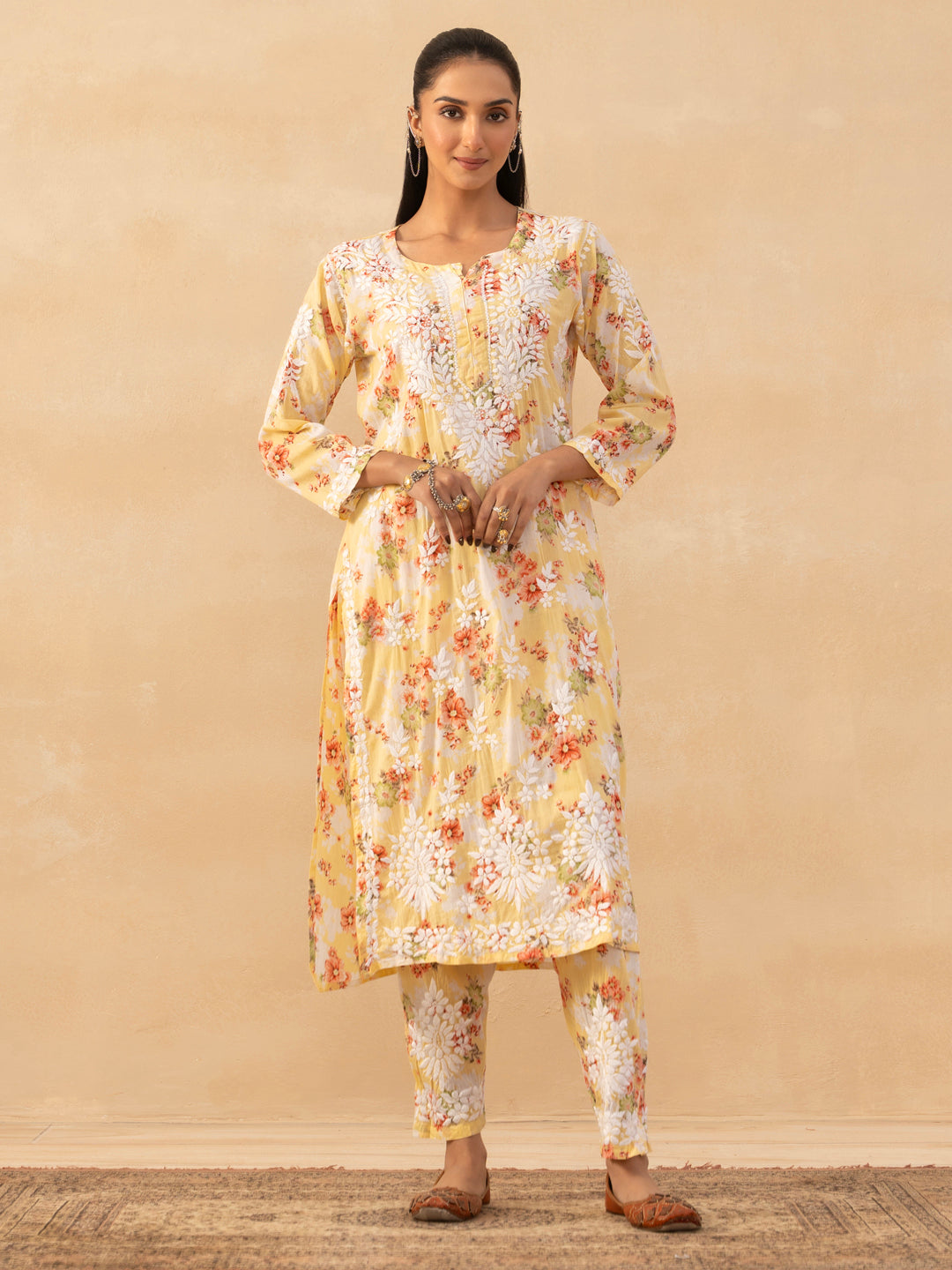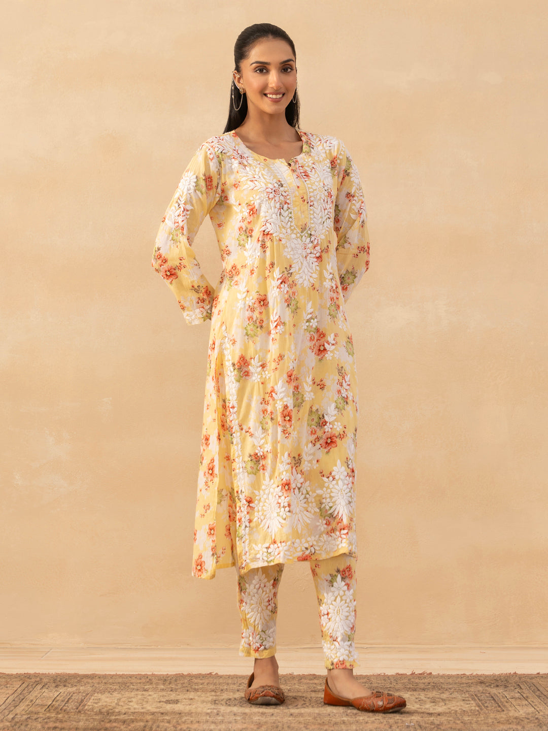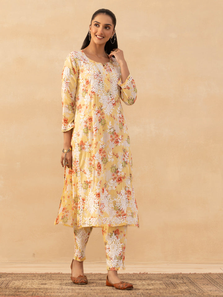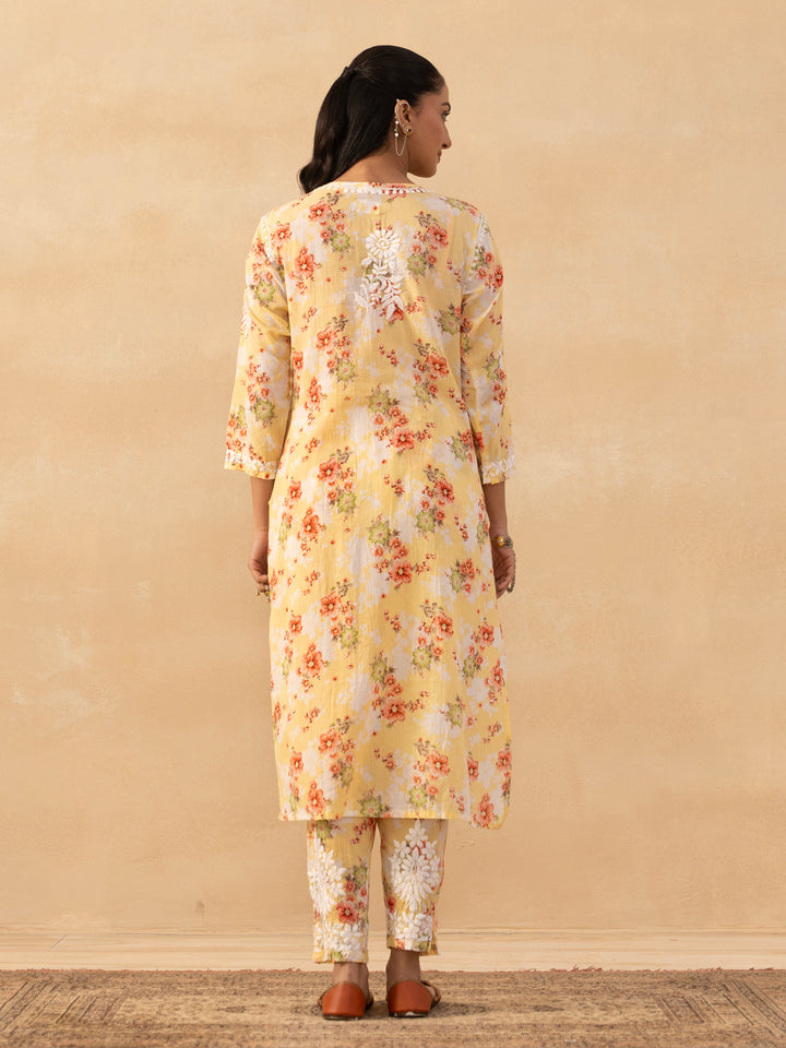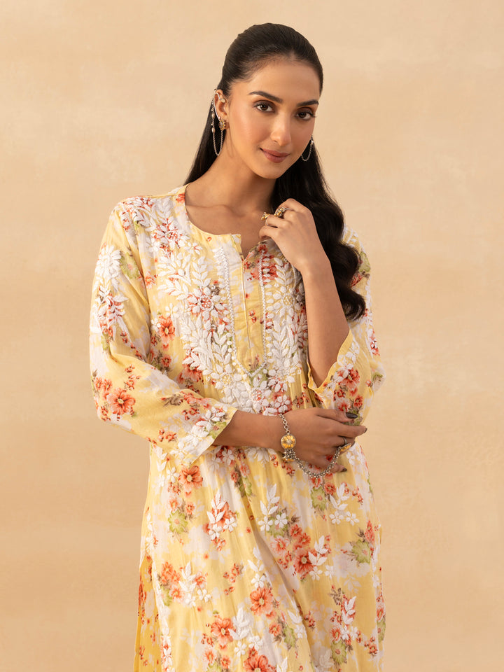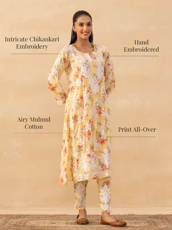 HOC Mulmul Chikankari Printed Women's 2 PC Long Kurta Set - Yellow