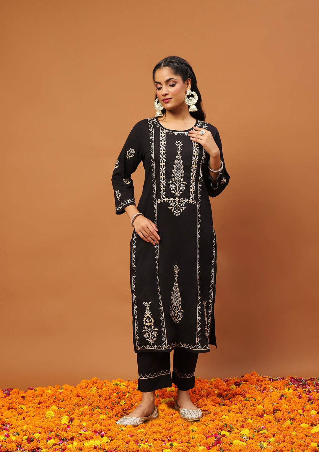 HOC Cotton Embroidered Zari Work Solid Women's 2 PC Co-ords-Set - Black