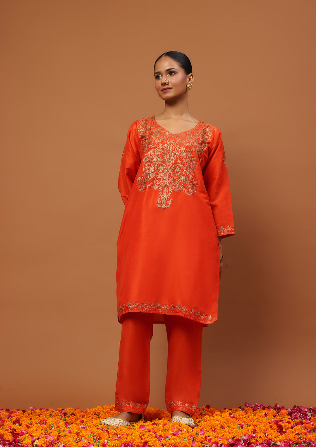 HOC Art Silk Embroidered Zari Solid Women's 2 PC Knee Kurta Set - Orange