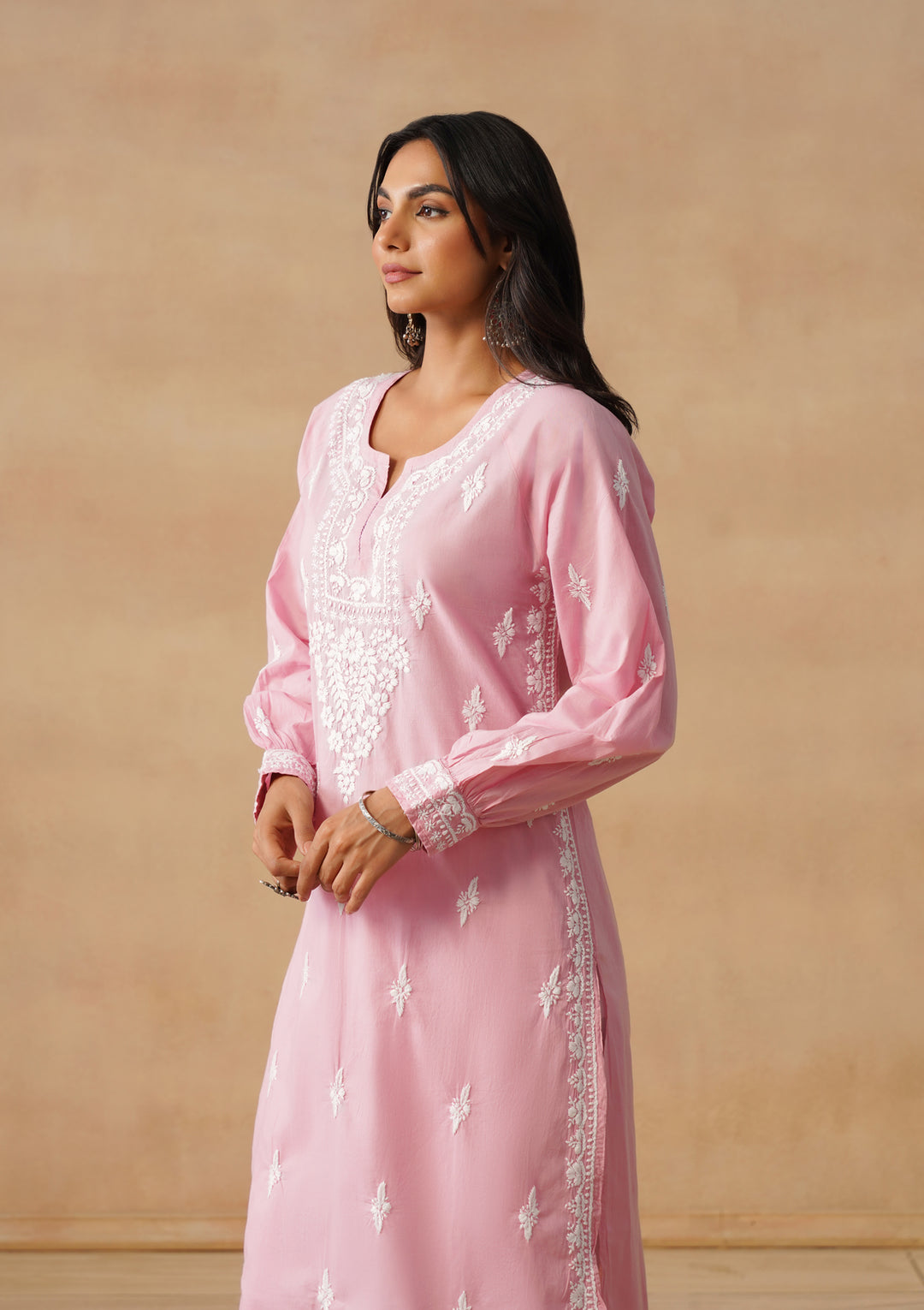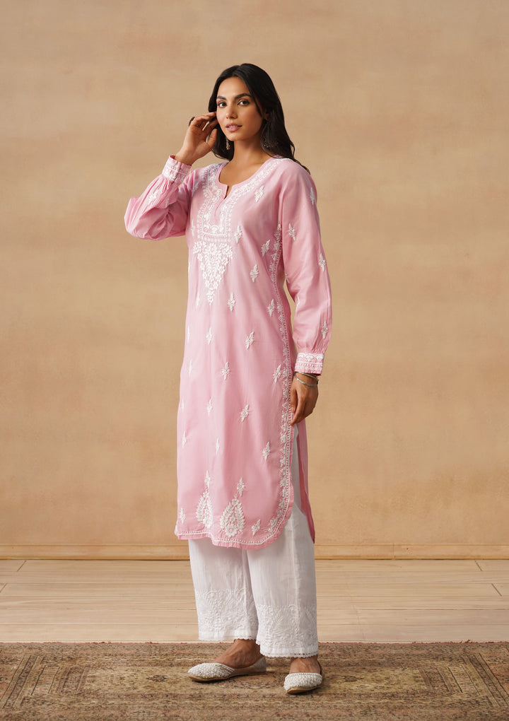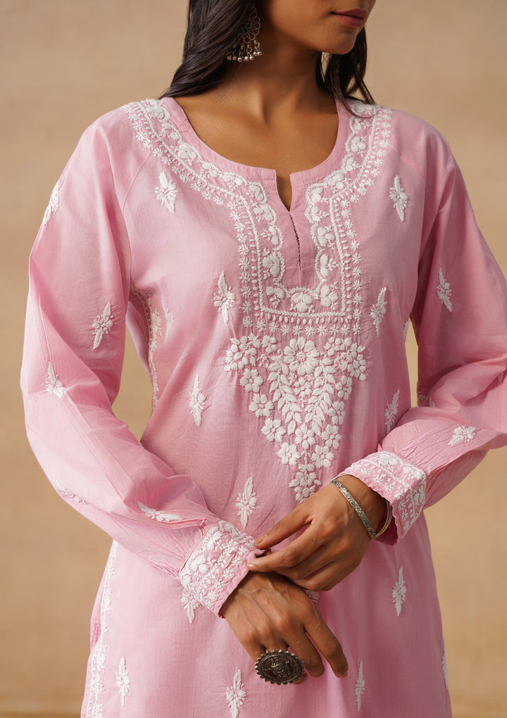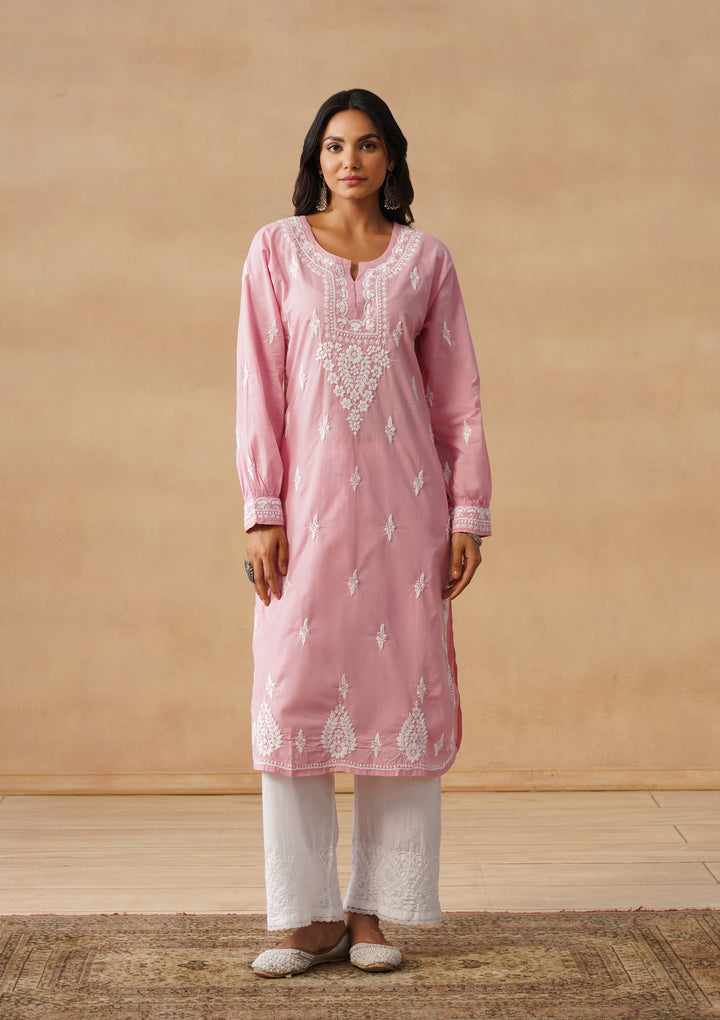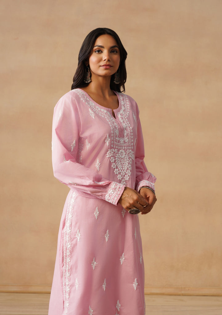 HOC Cotton Cambric Chikankari Solid Straight Women's Long Kurta-Dust Pink