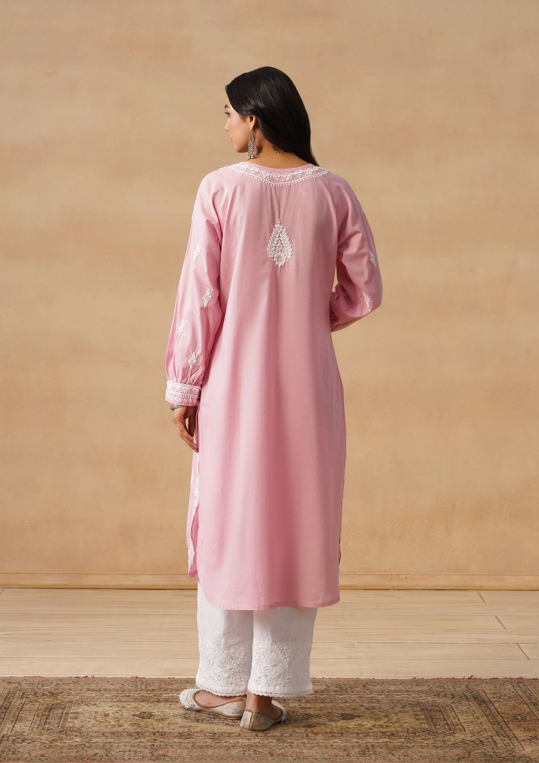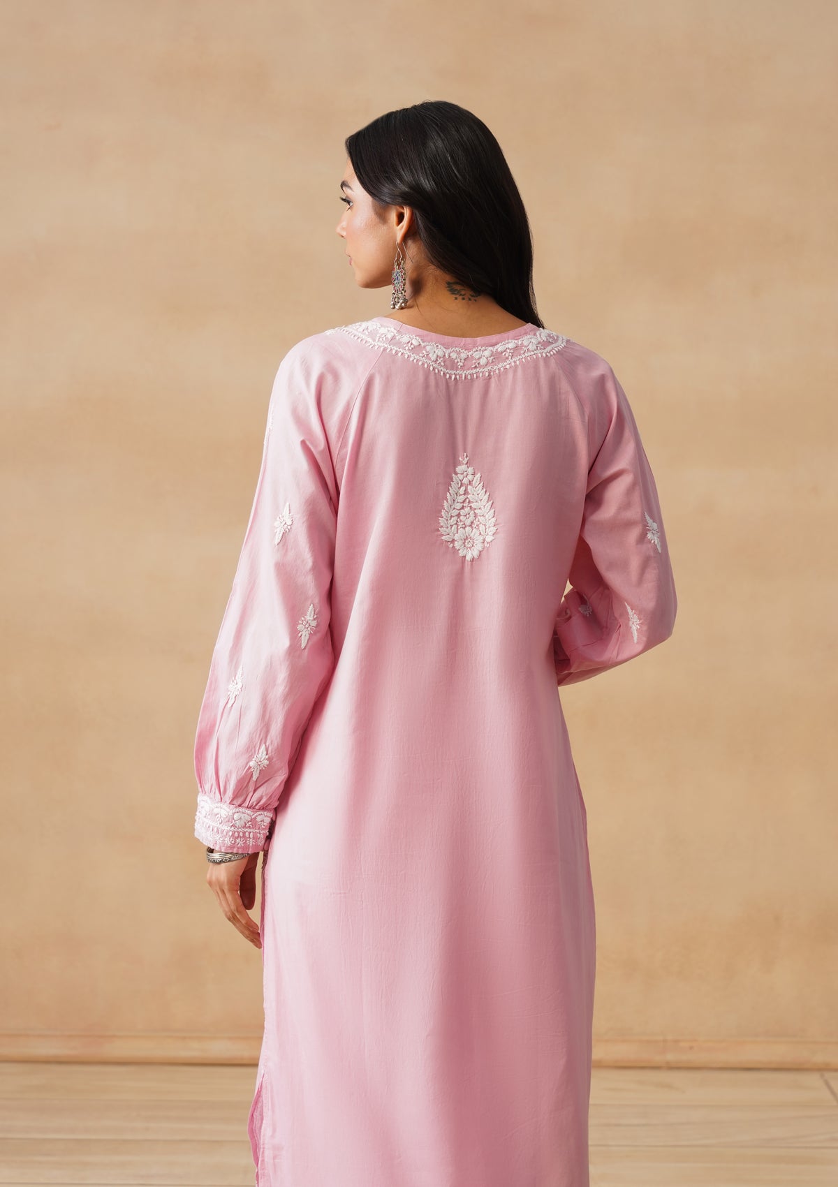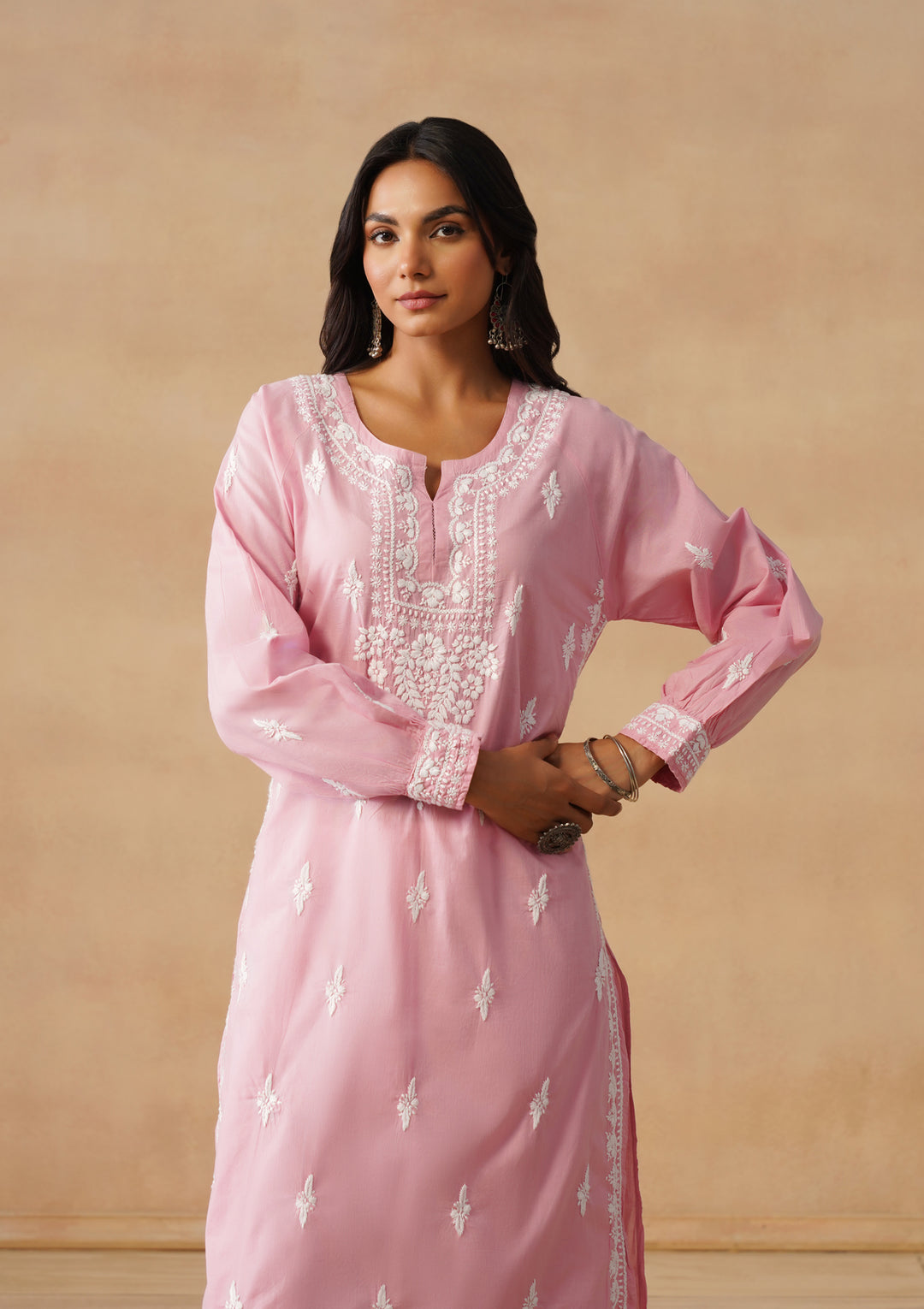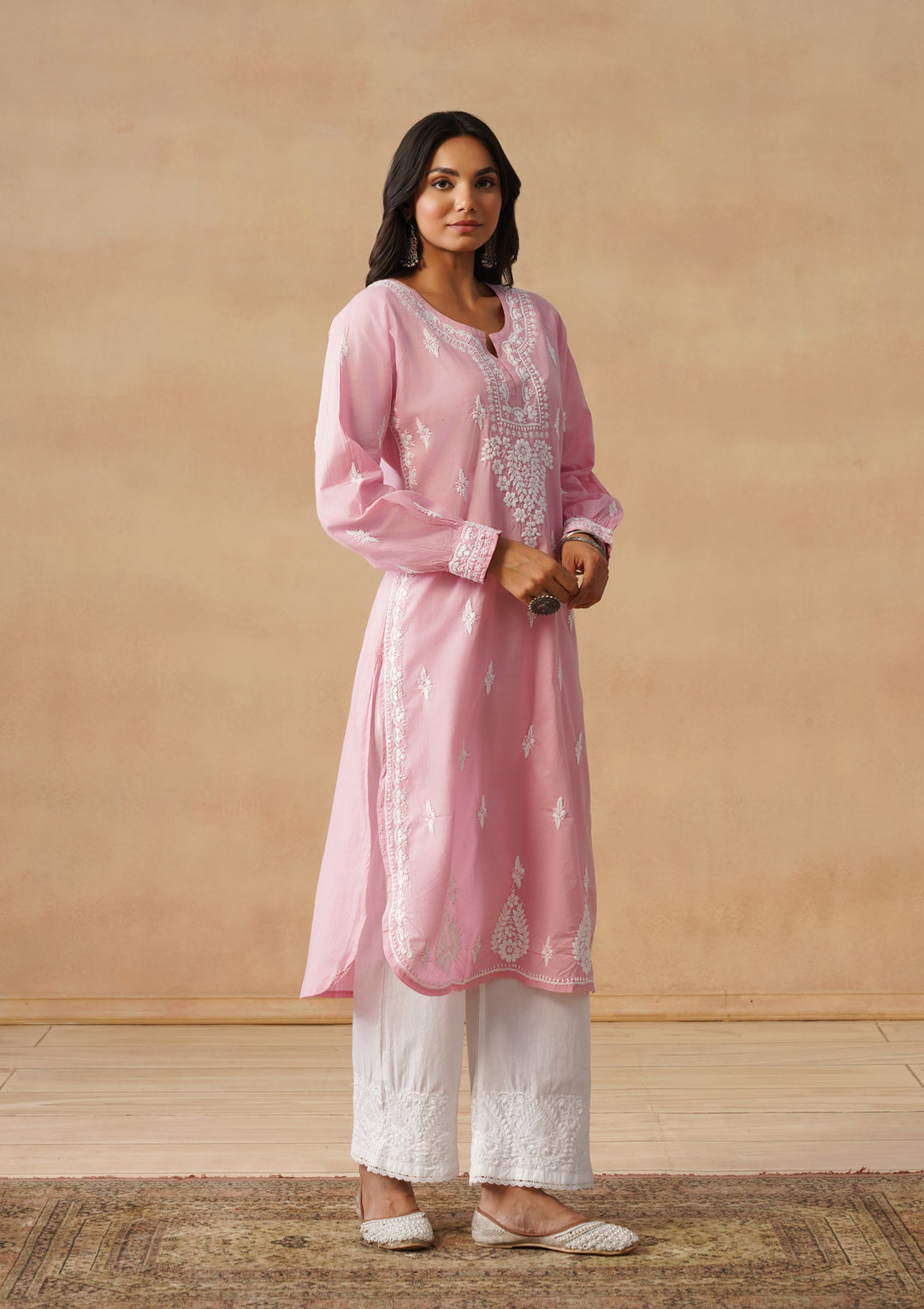 HOC Cotton Cambric Chikankari Solid Straight Women's Long Kurta-Dust Pink