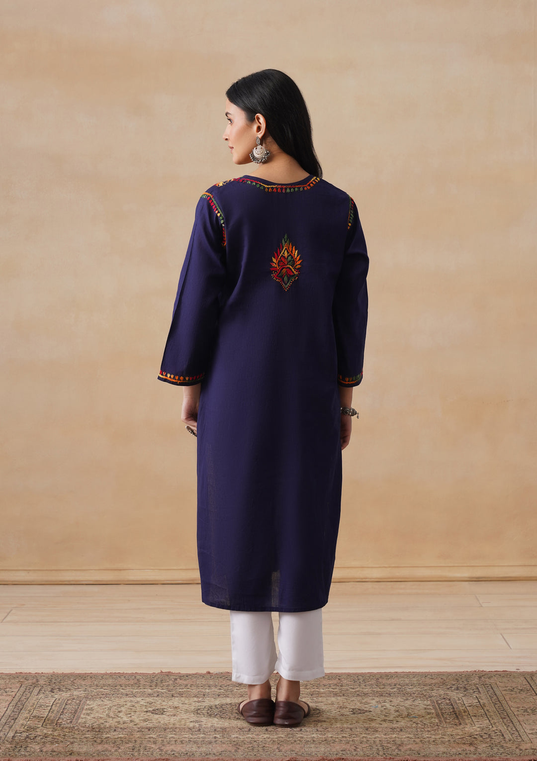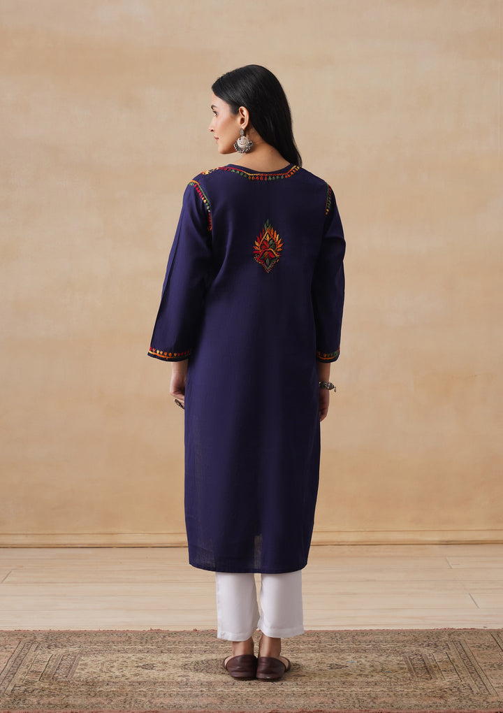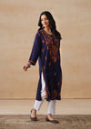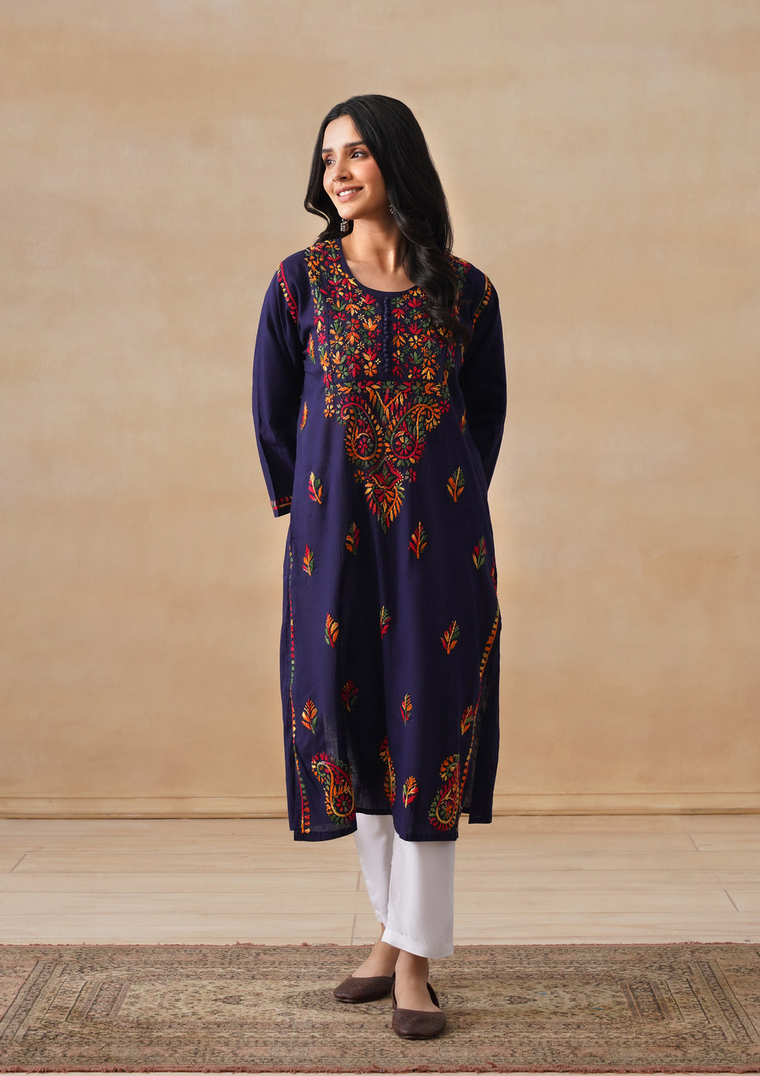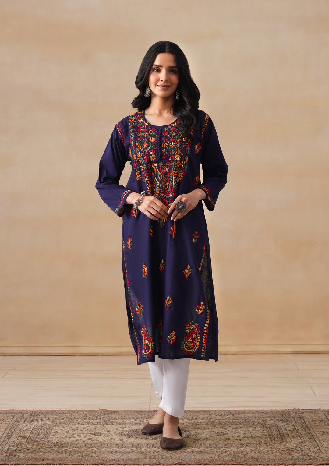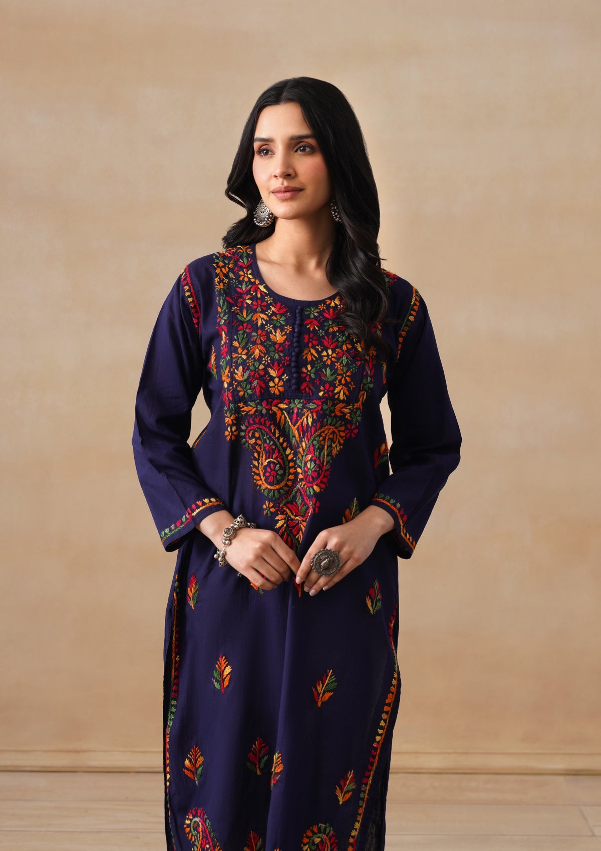 HOC Cotton Chikankari Solid Women's Long Kurta - Navy