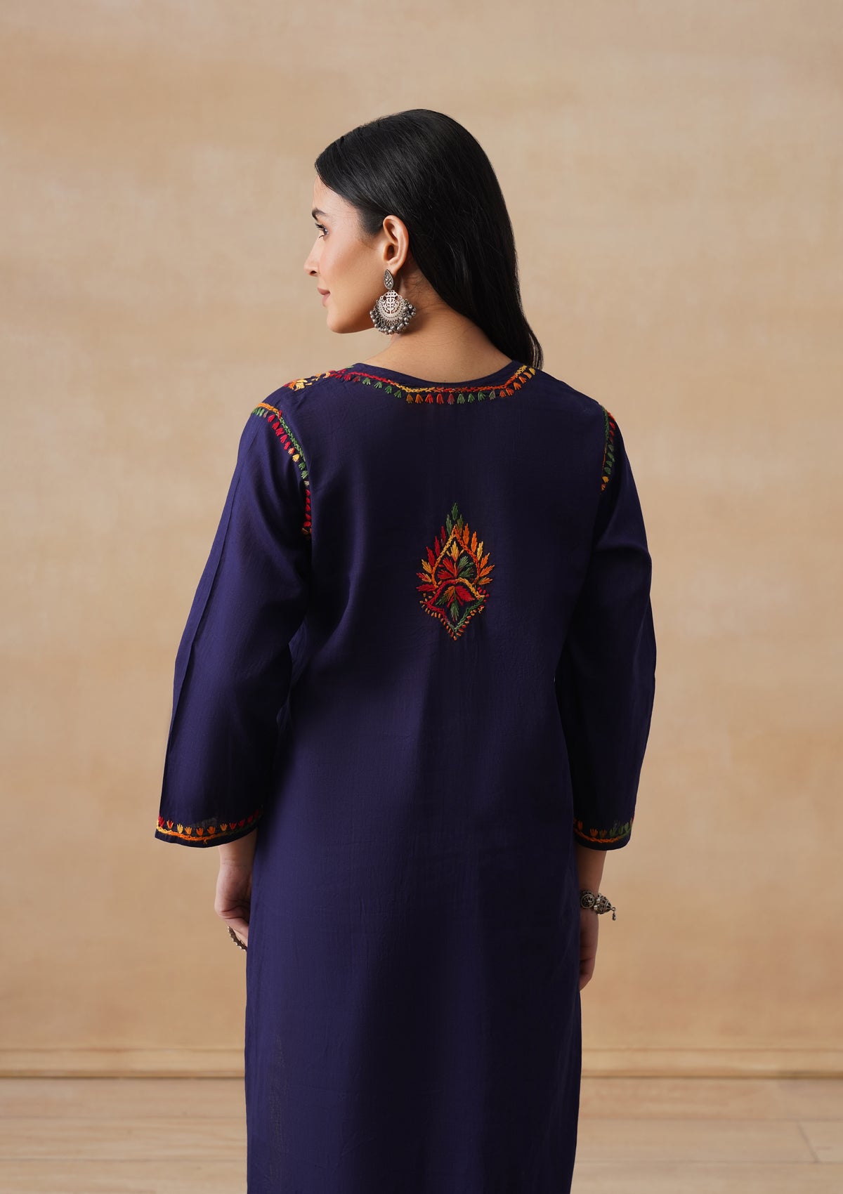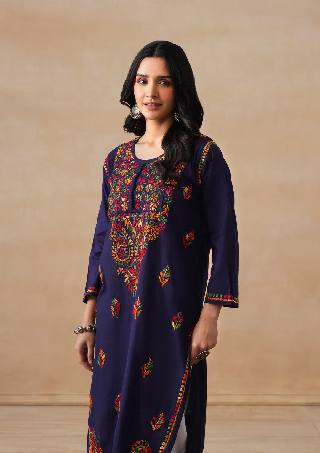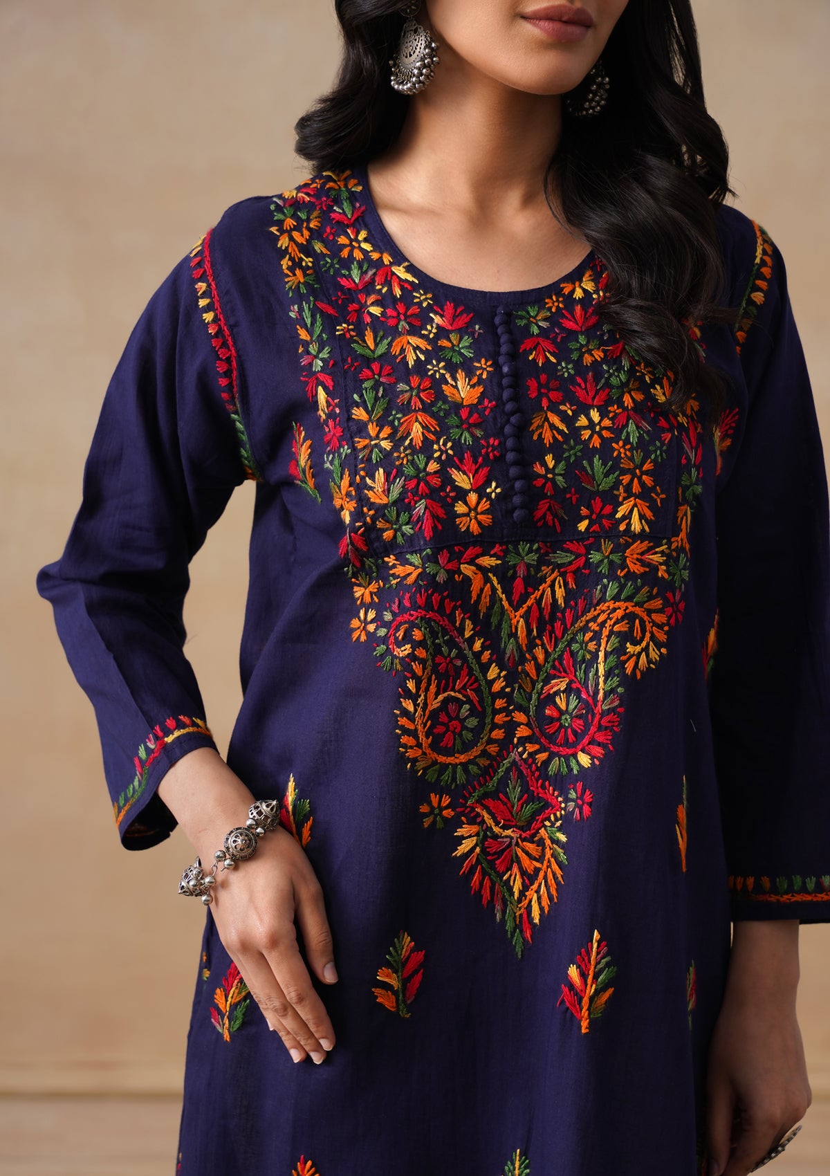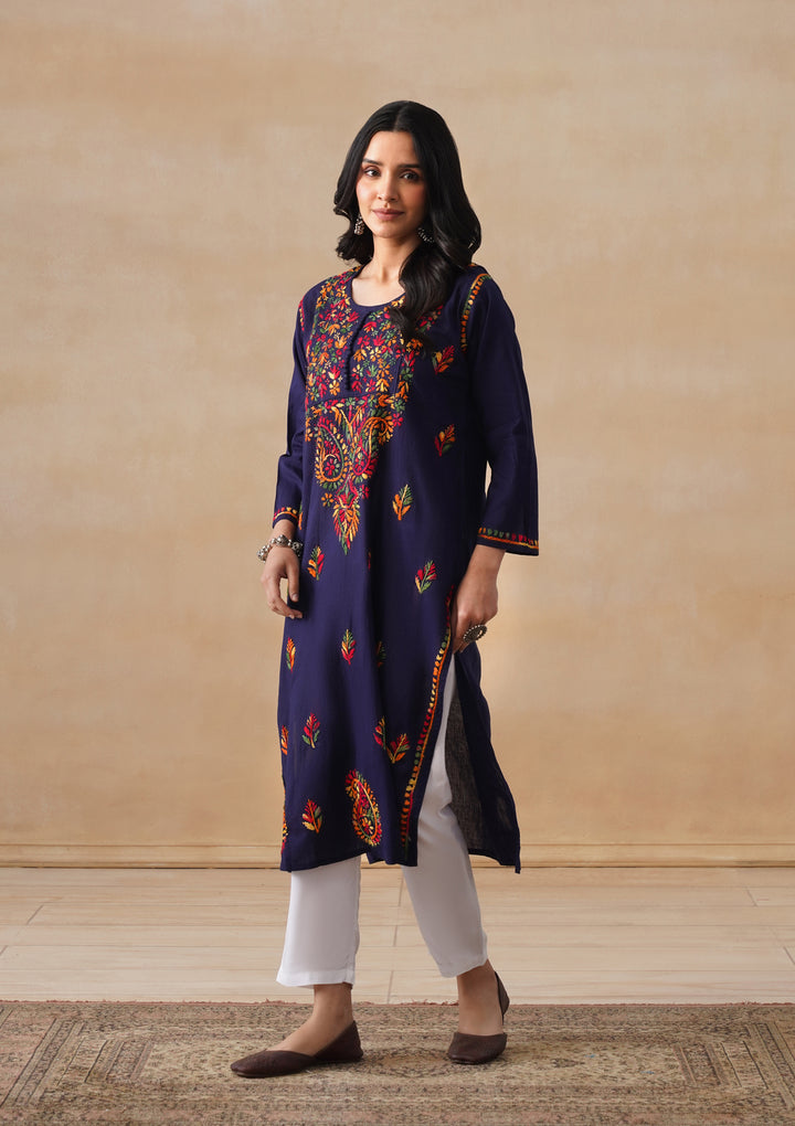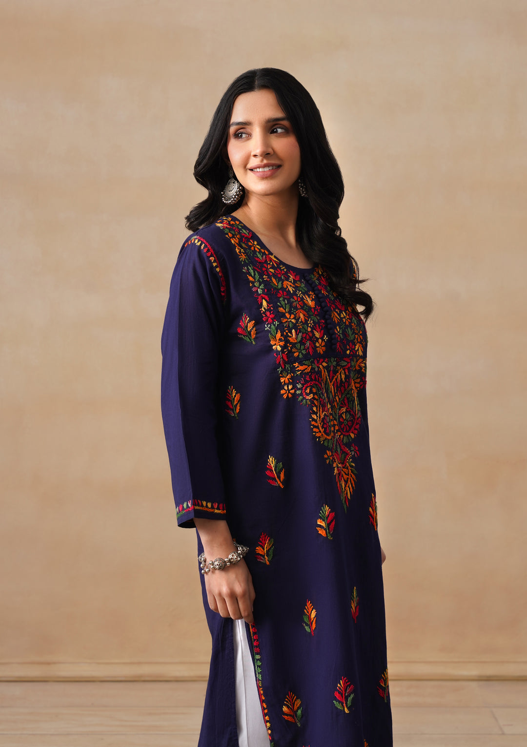 HOC Cotton Chikankari Solid Women's Long Kurta - Navy