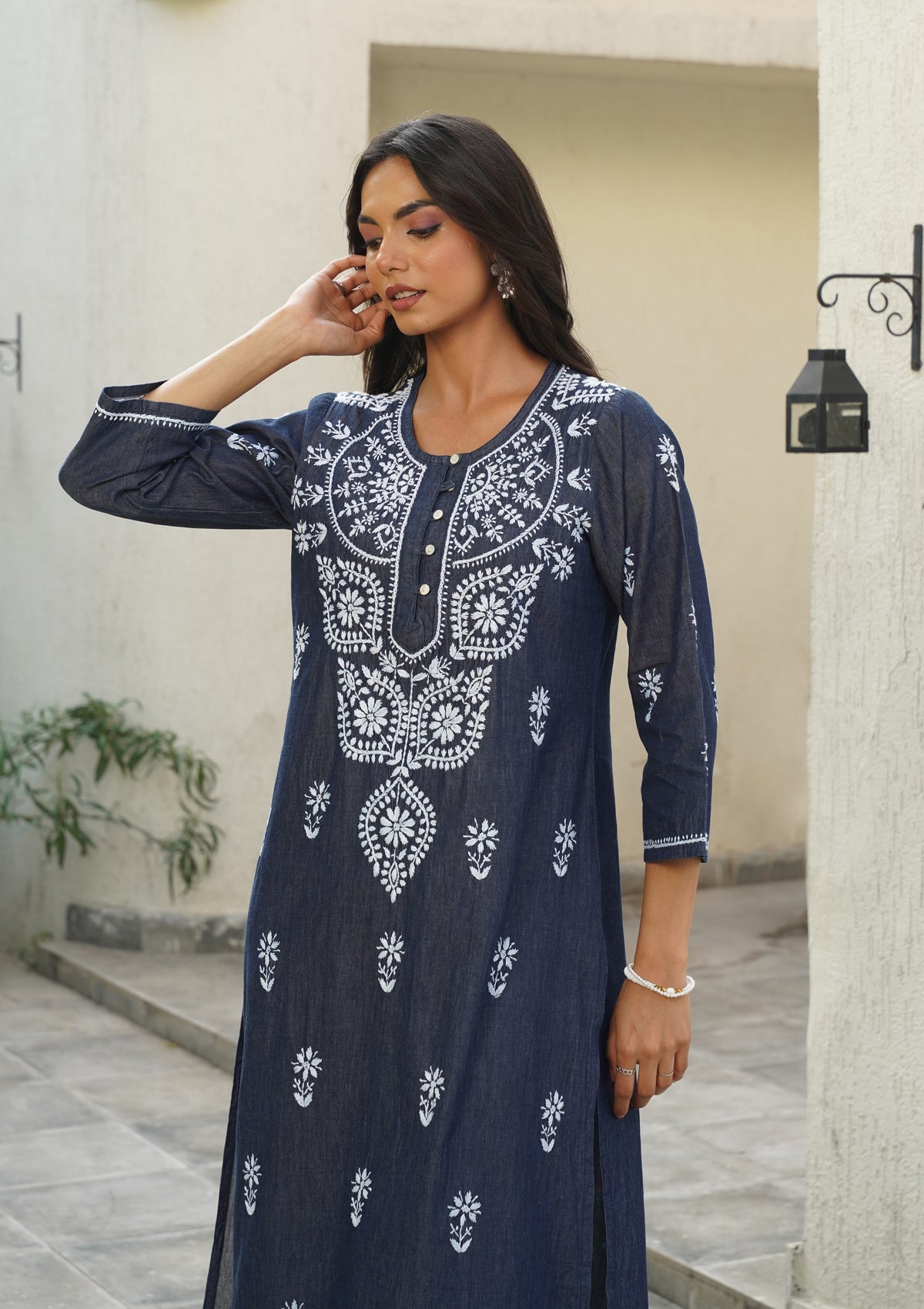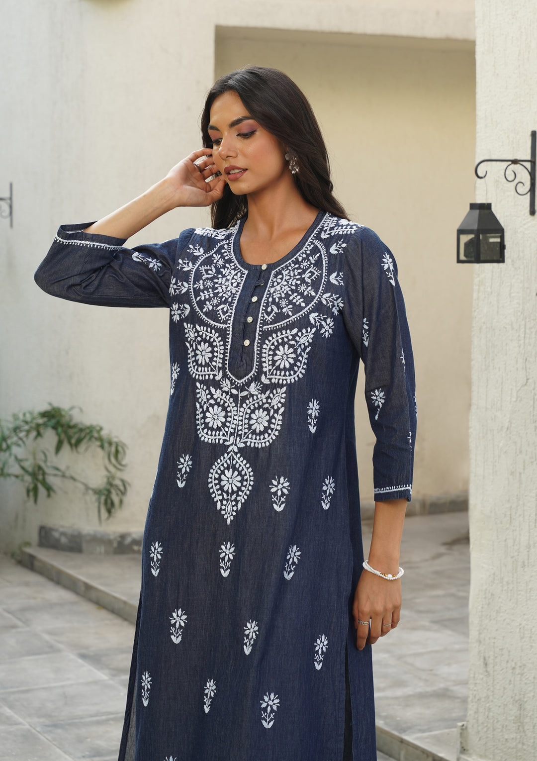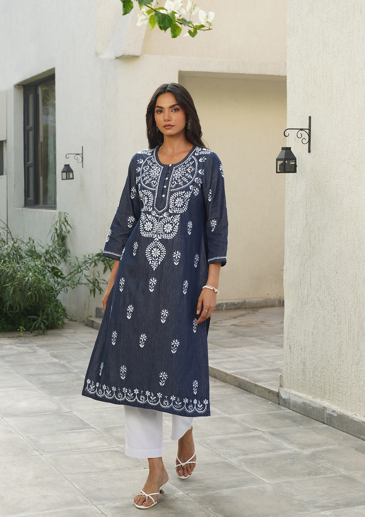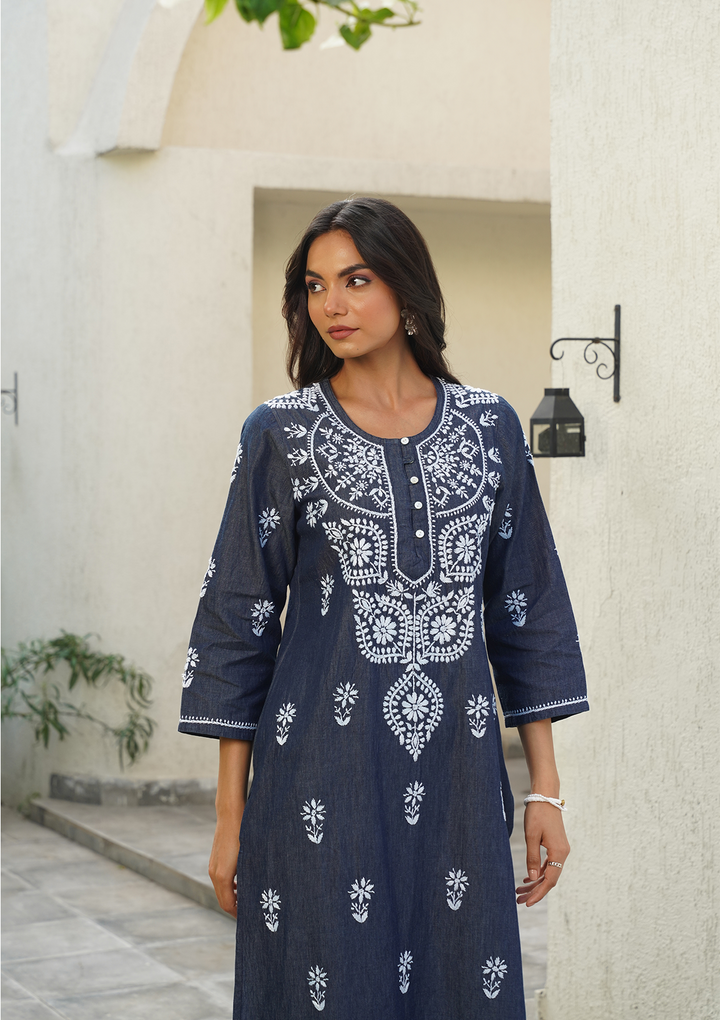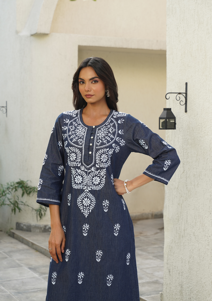 HOC Chambray Denim Chikankari Solid Straight Women's Long Kurta-Dark Blue